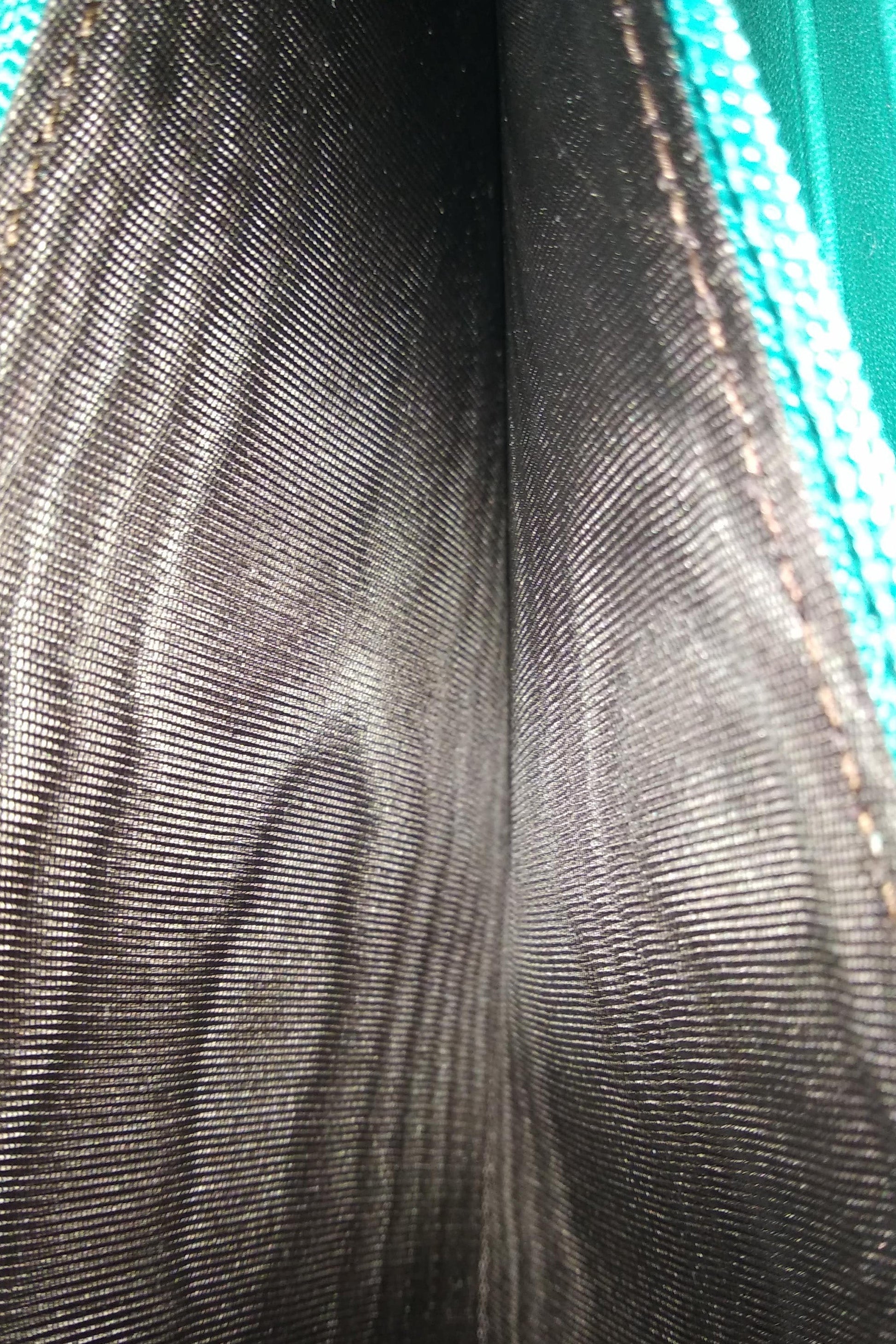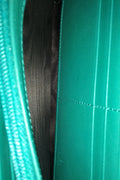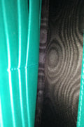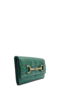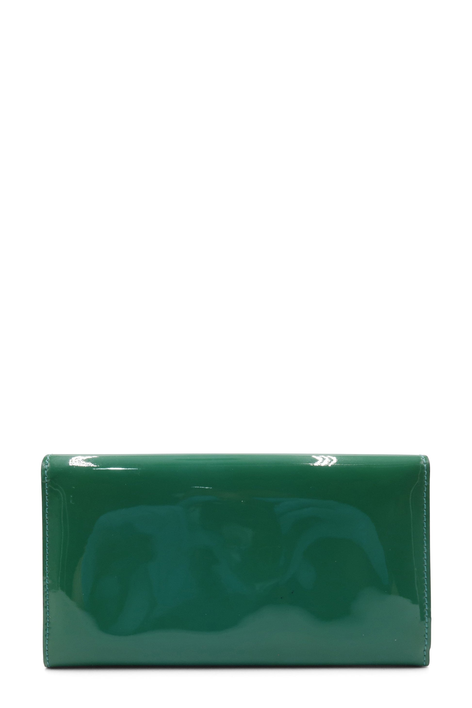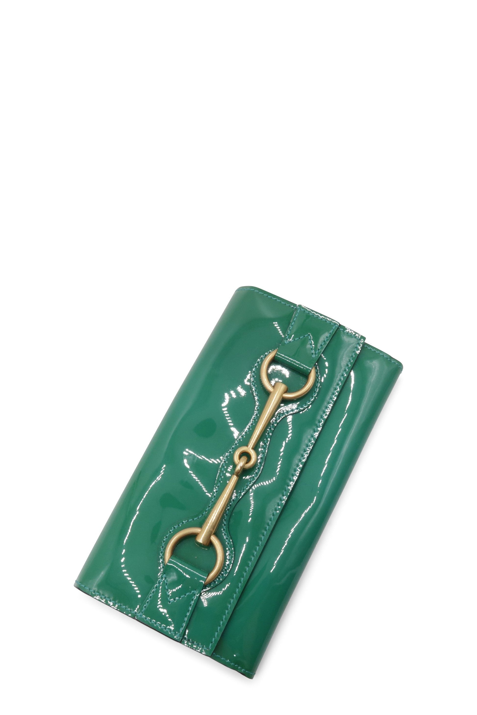 This is a stylish evening clutch is crafted of green patent leather with a front aged brass horsebit detail. The front flap opens to a green suede interior with a zipper pocket and patch pockets.