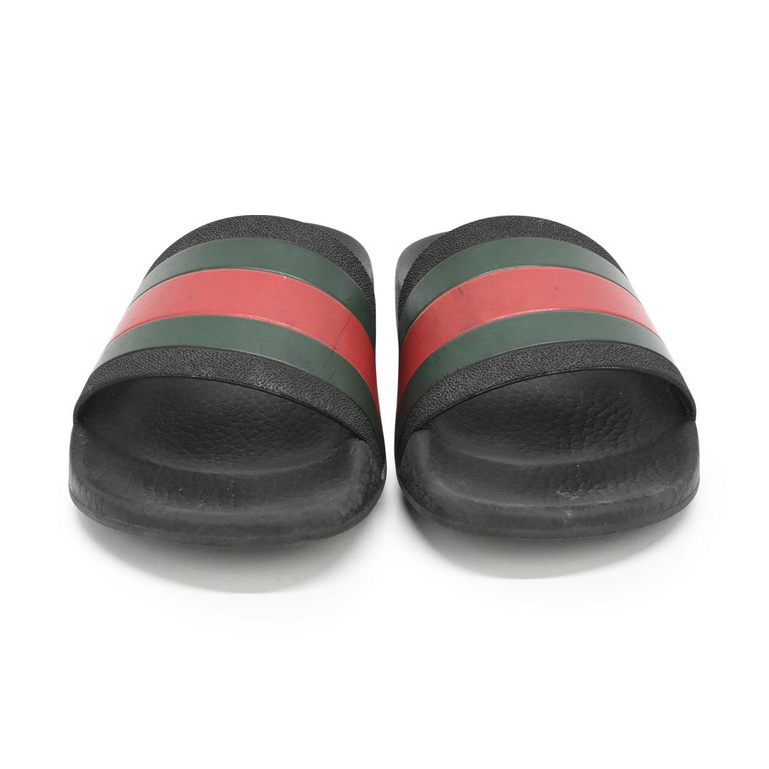 Gucci pool slides in black with green and red racing stripe across the top band.
