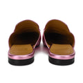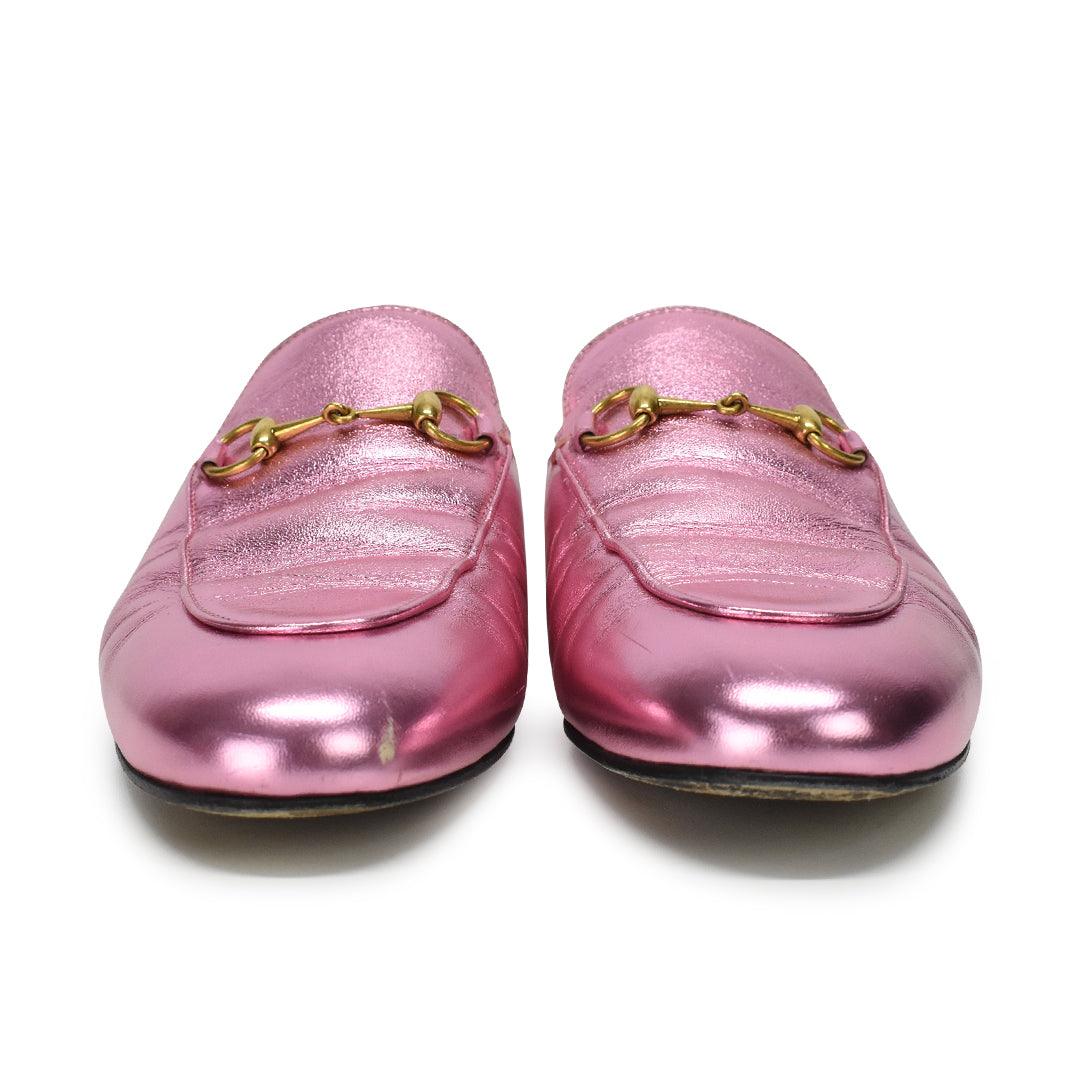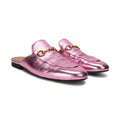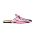 Gucci 'Princetown' loafer mules in metallic pink leather with aged gold horse bits. The initials 'BH' are heat stamped on the insole.