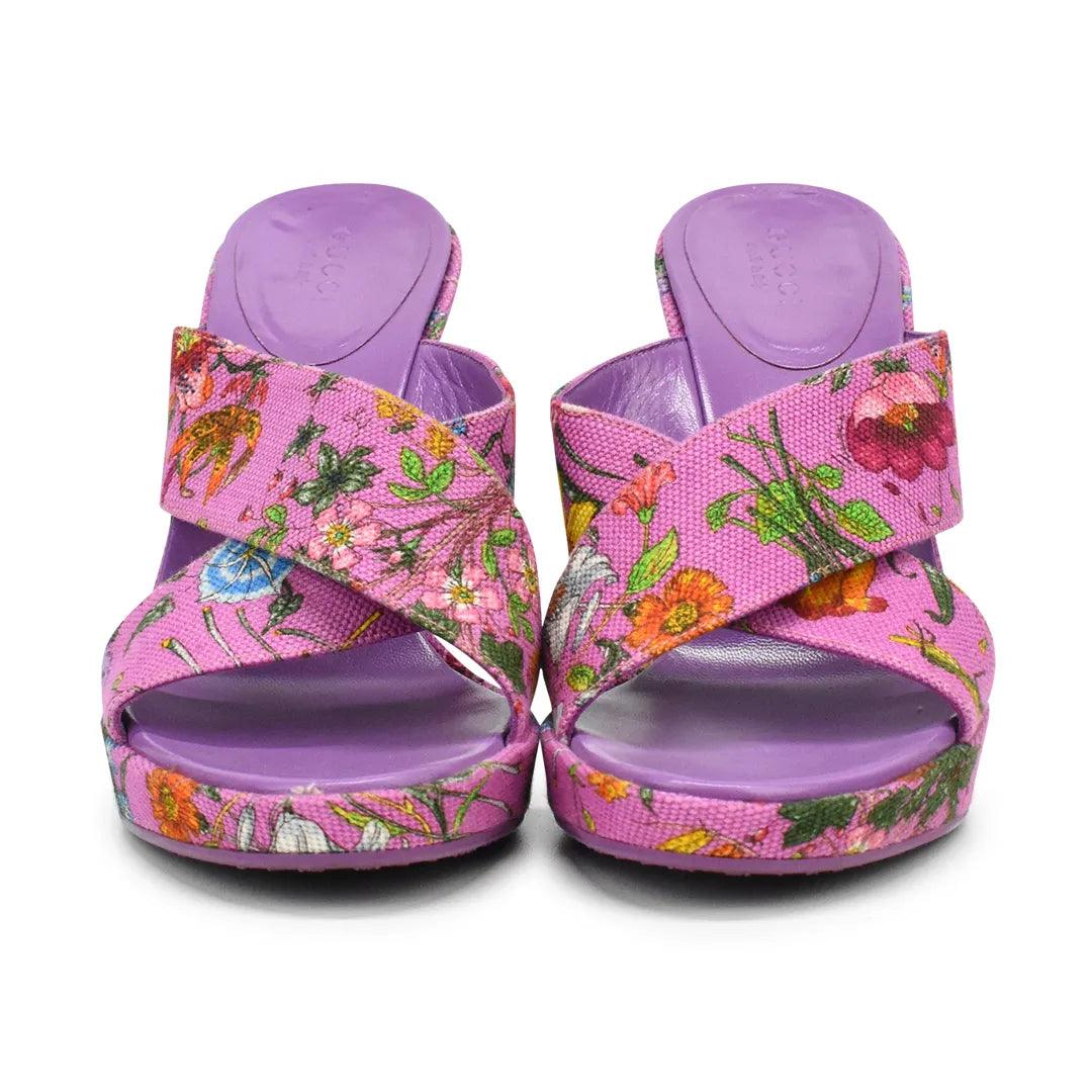 Gucci heels in purple canvas with an all-over floral print and crossed straps.