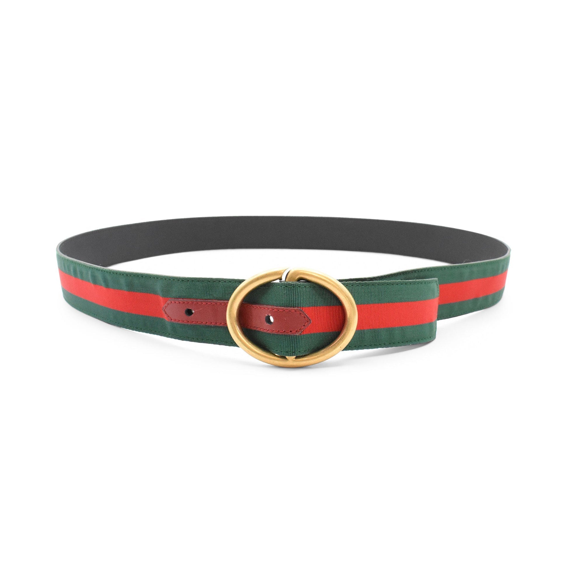 Gucci belt in red and green racing stripe cotton with black leather backing. Features a round gold hardware adjustable pin buckle.