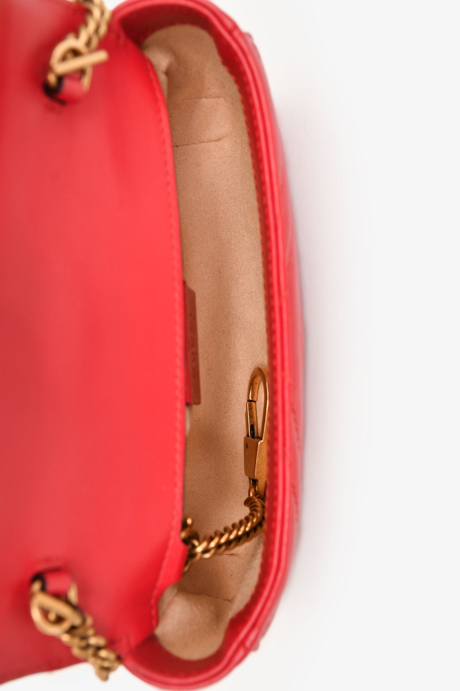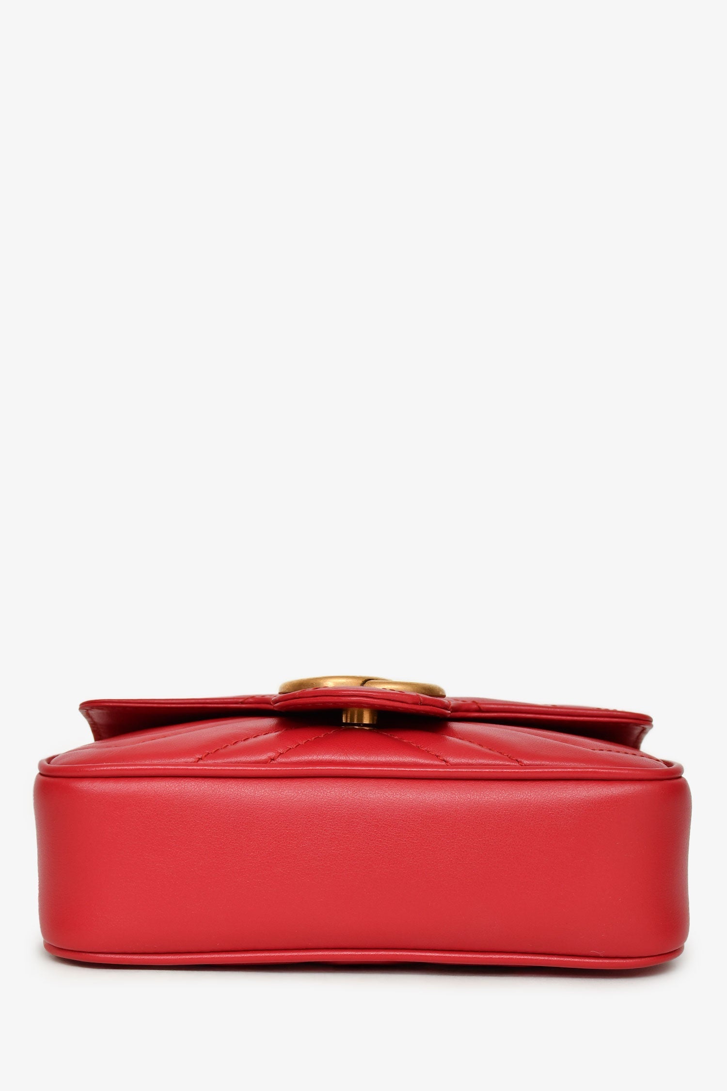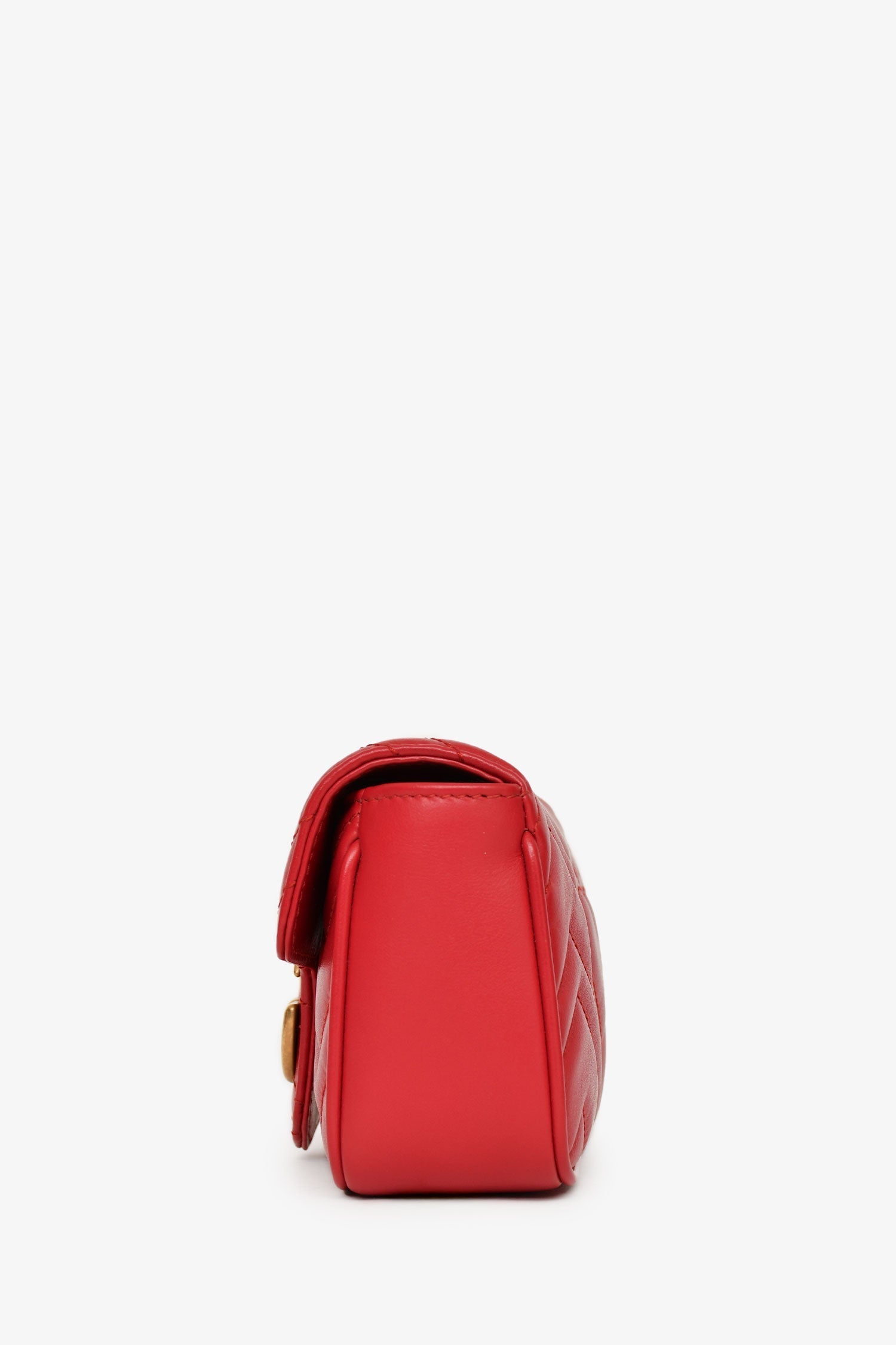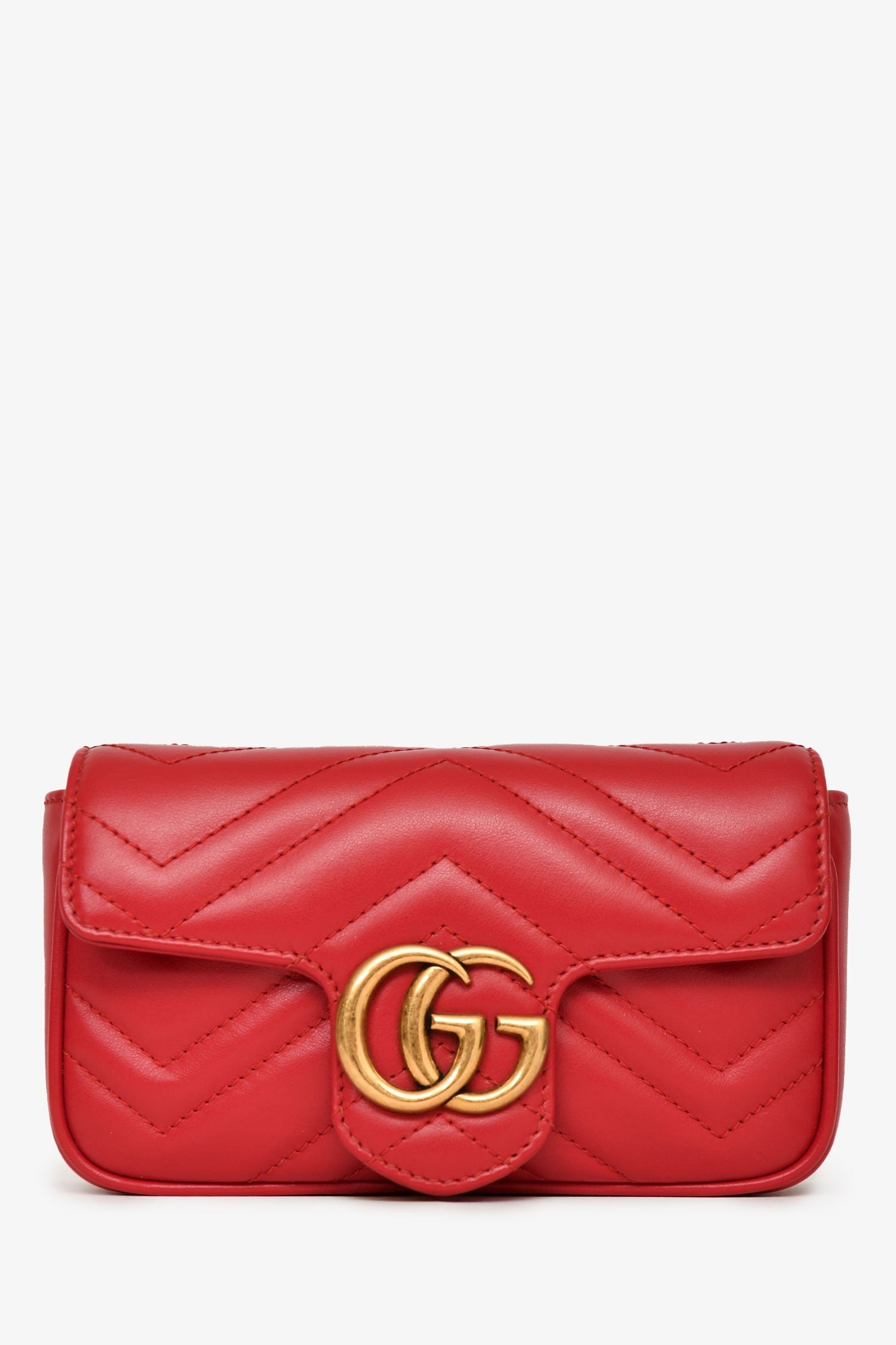 Gucci Red Leather Chevron Quilted Super Mini GG Marmont Crossbody Bag. Antique gold-tone GG logo at front. Flap with snap closure. Chain crossbody strap with key ring attachment. Lined interior. Tonal stitching. Comes with dust bag and box.
