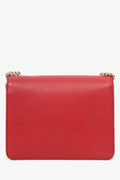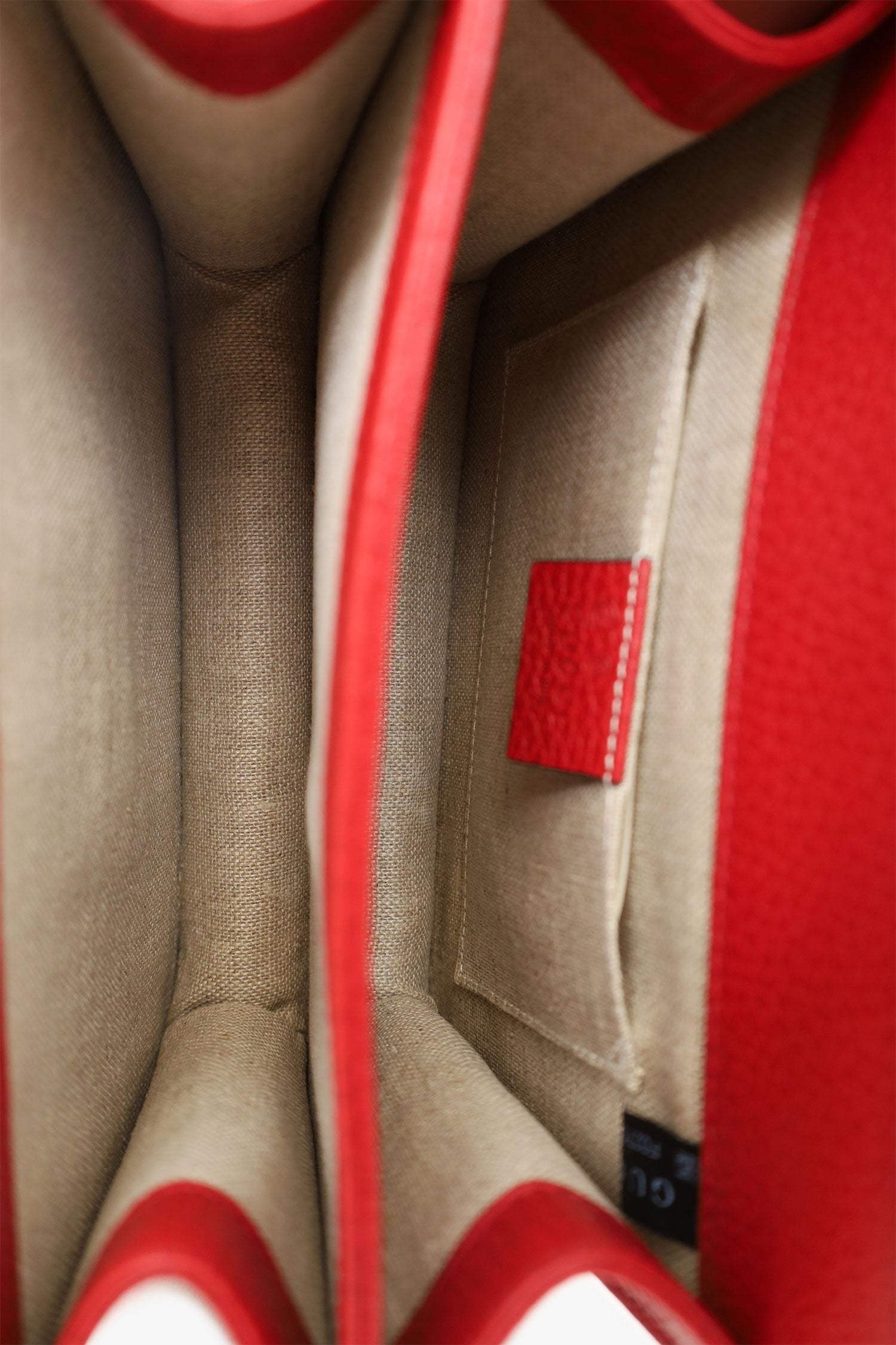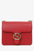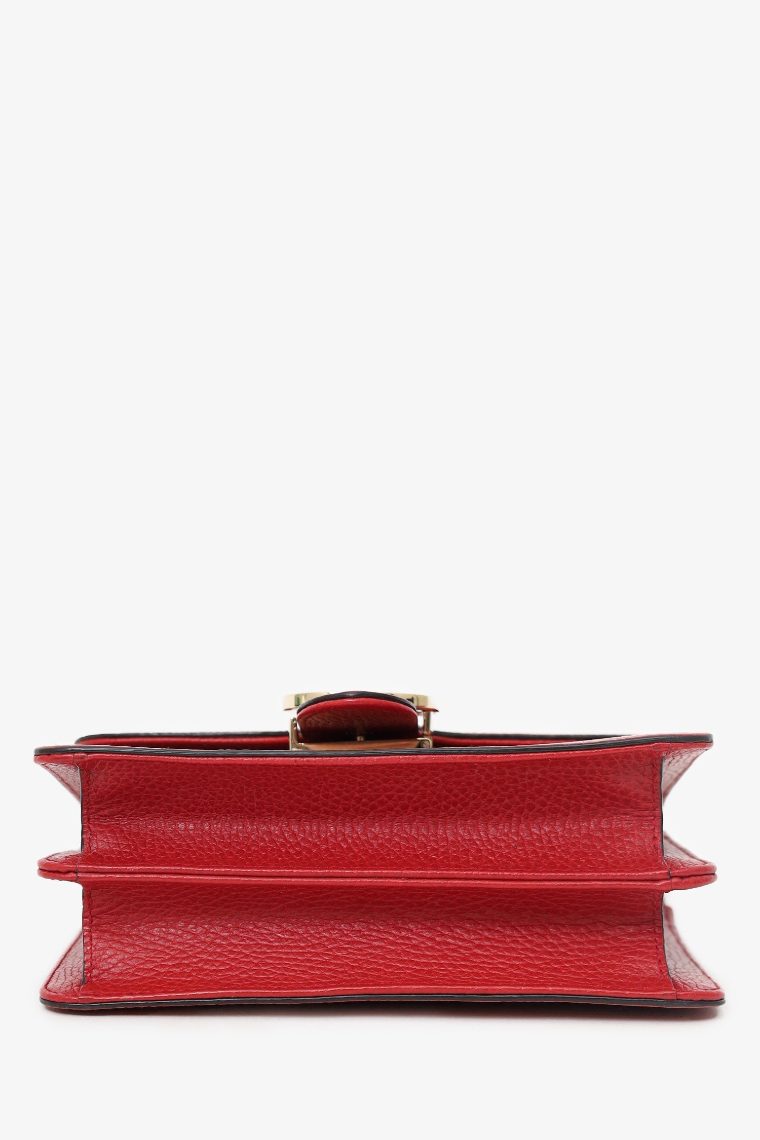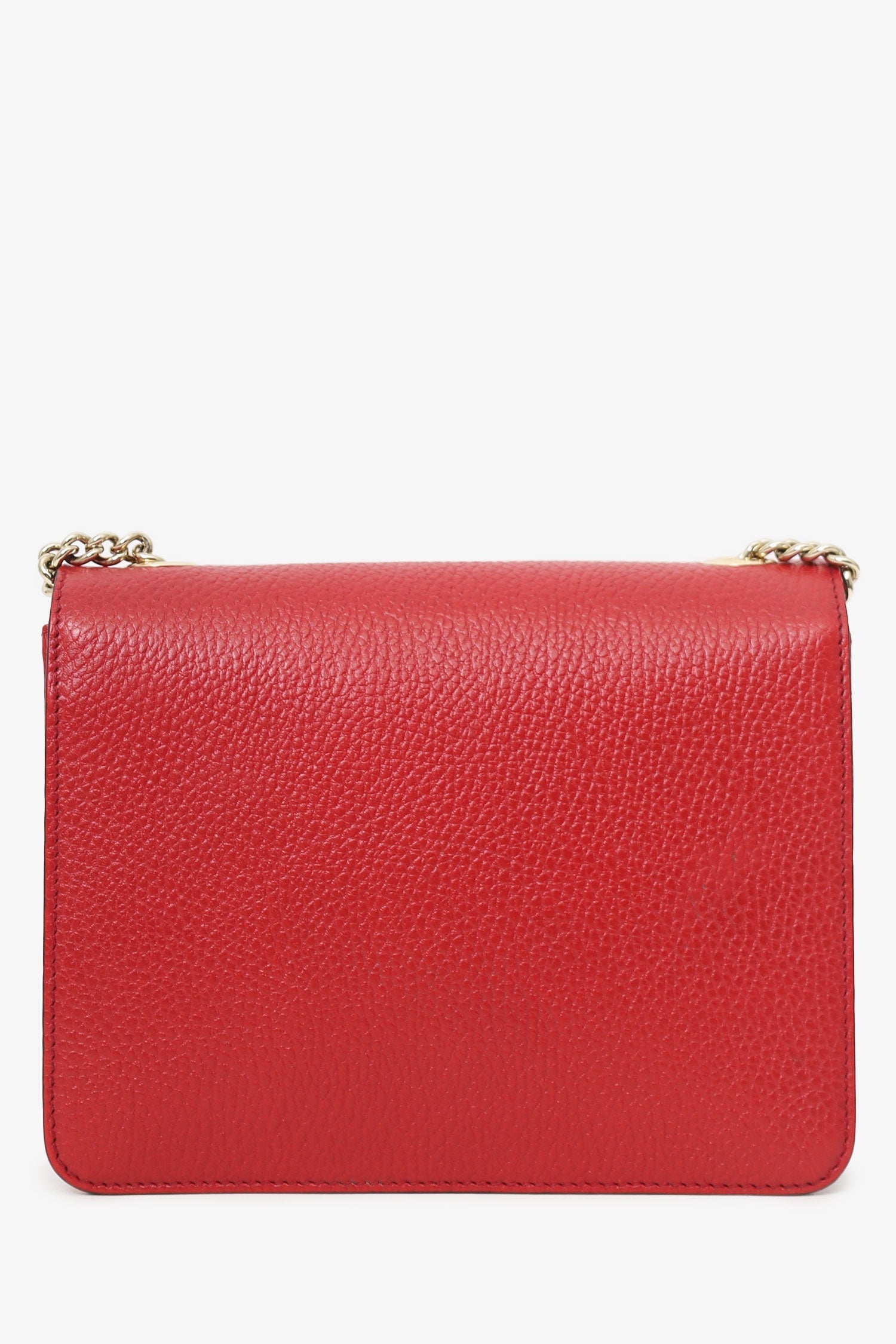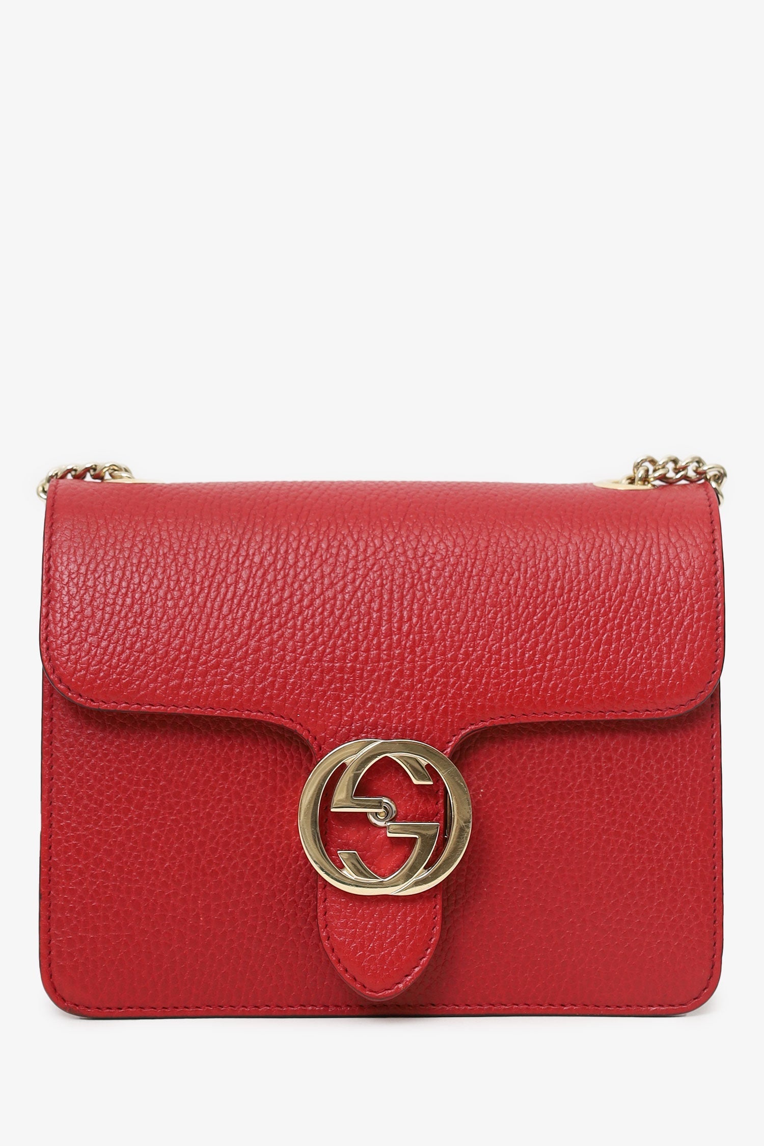 Gucci Red Leather Interlocking G Small Dollar Crossbody Bag. Front fold-over flap with flip-lock closure. Chainlink/leather crossbody strap that can be pulled in as doubled shoulder straps. Lined interior. 2 interior compartments; single slip pocket in rear compartment. Gold-tone hardware. Tonal stitching.