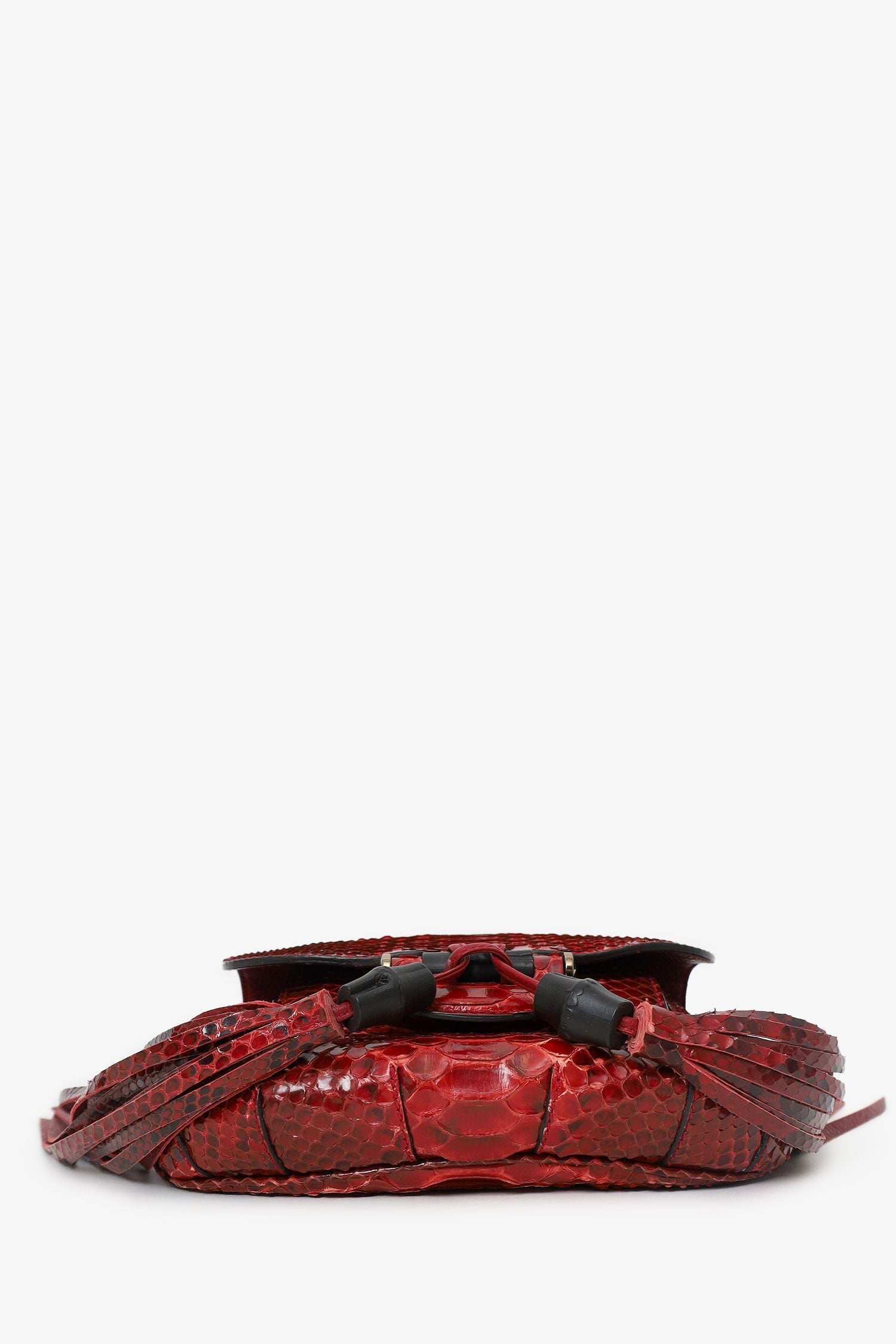 Gucci Red Python Small Nouveau Fringe Shoulder Bag. Front fold-over flap with tassel detail. Adjustable buckle strap . Leather lined interior. 2 interior pockets, 1 zip and 1 with snap-button closure. Silver-tone hardware. Tonal stitching.