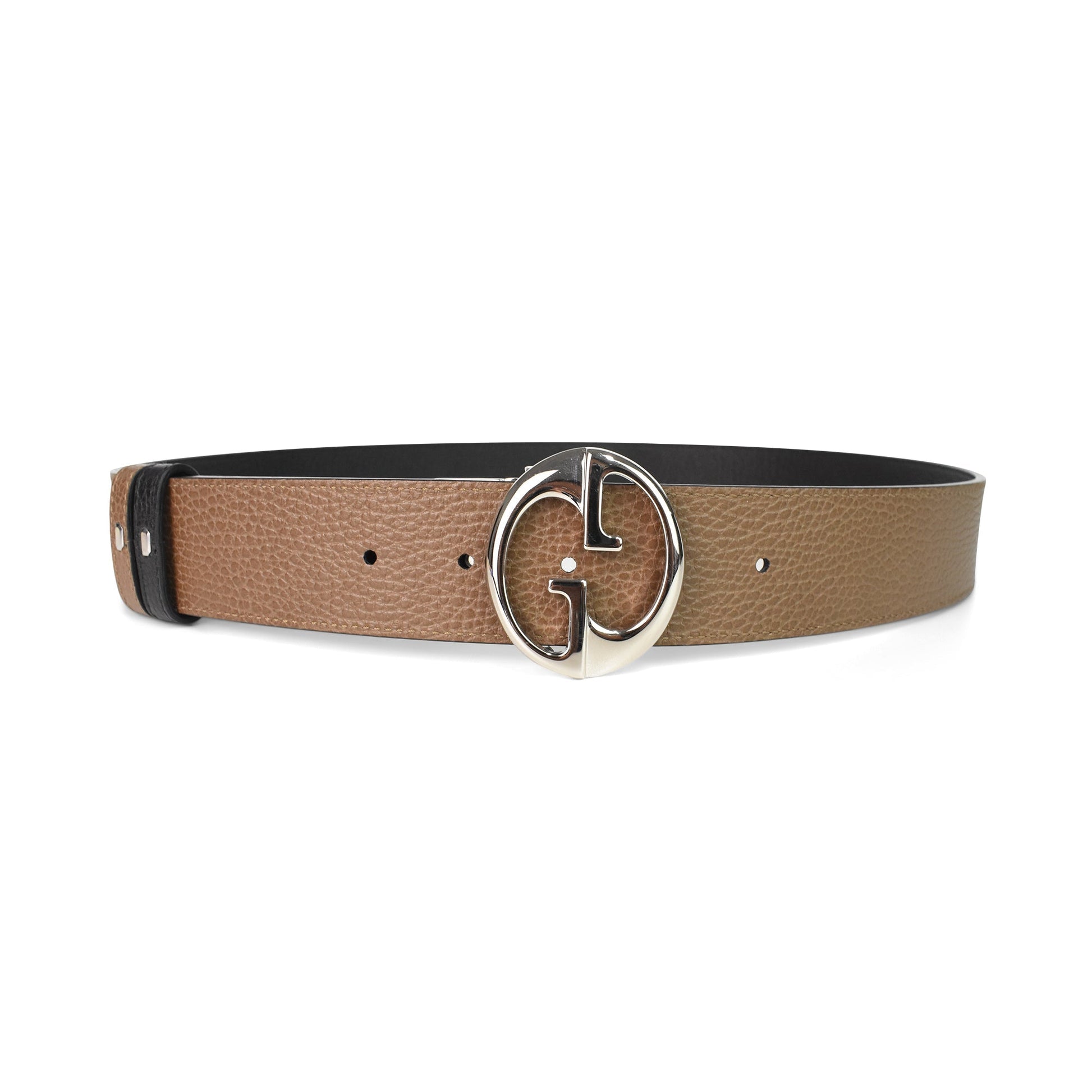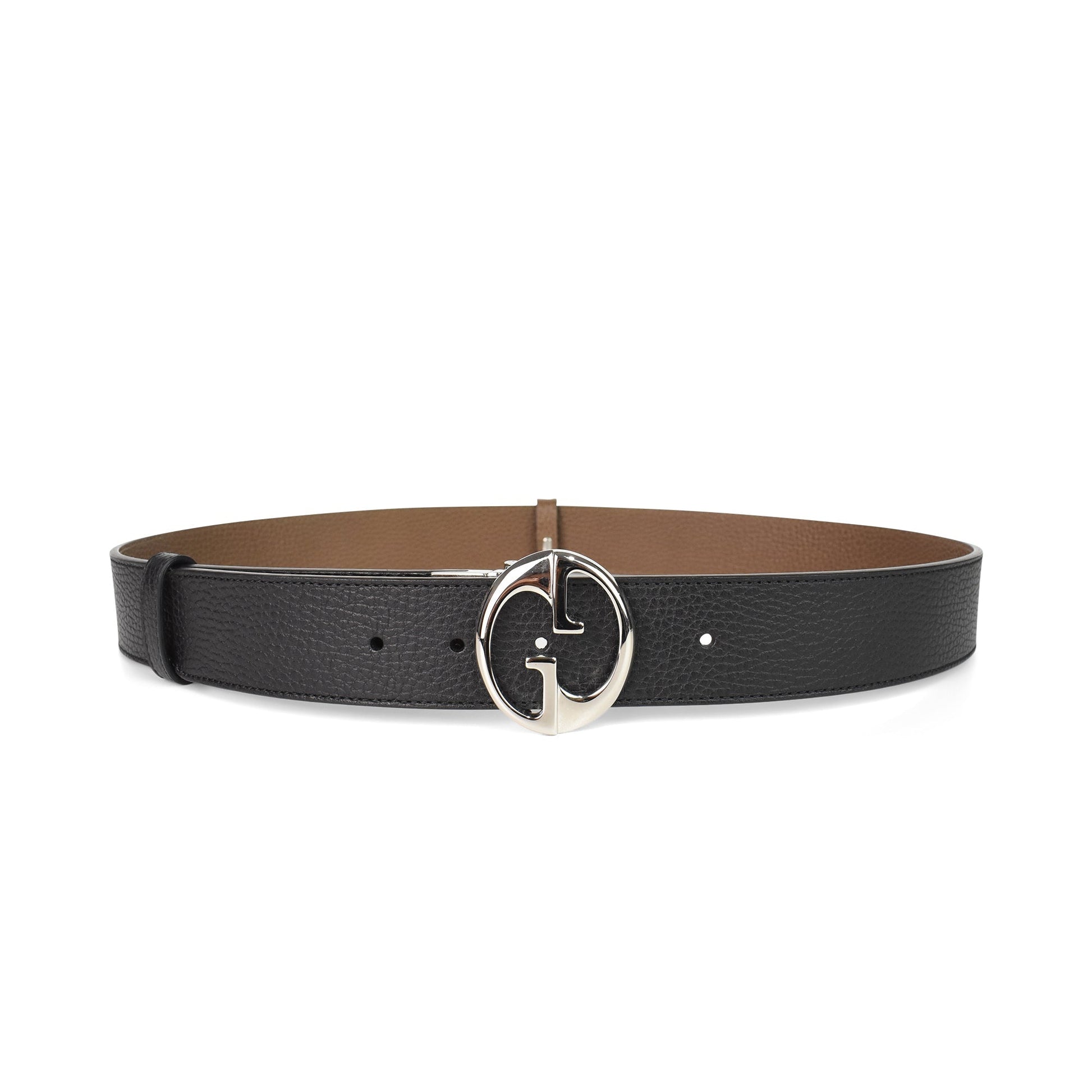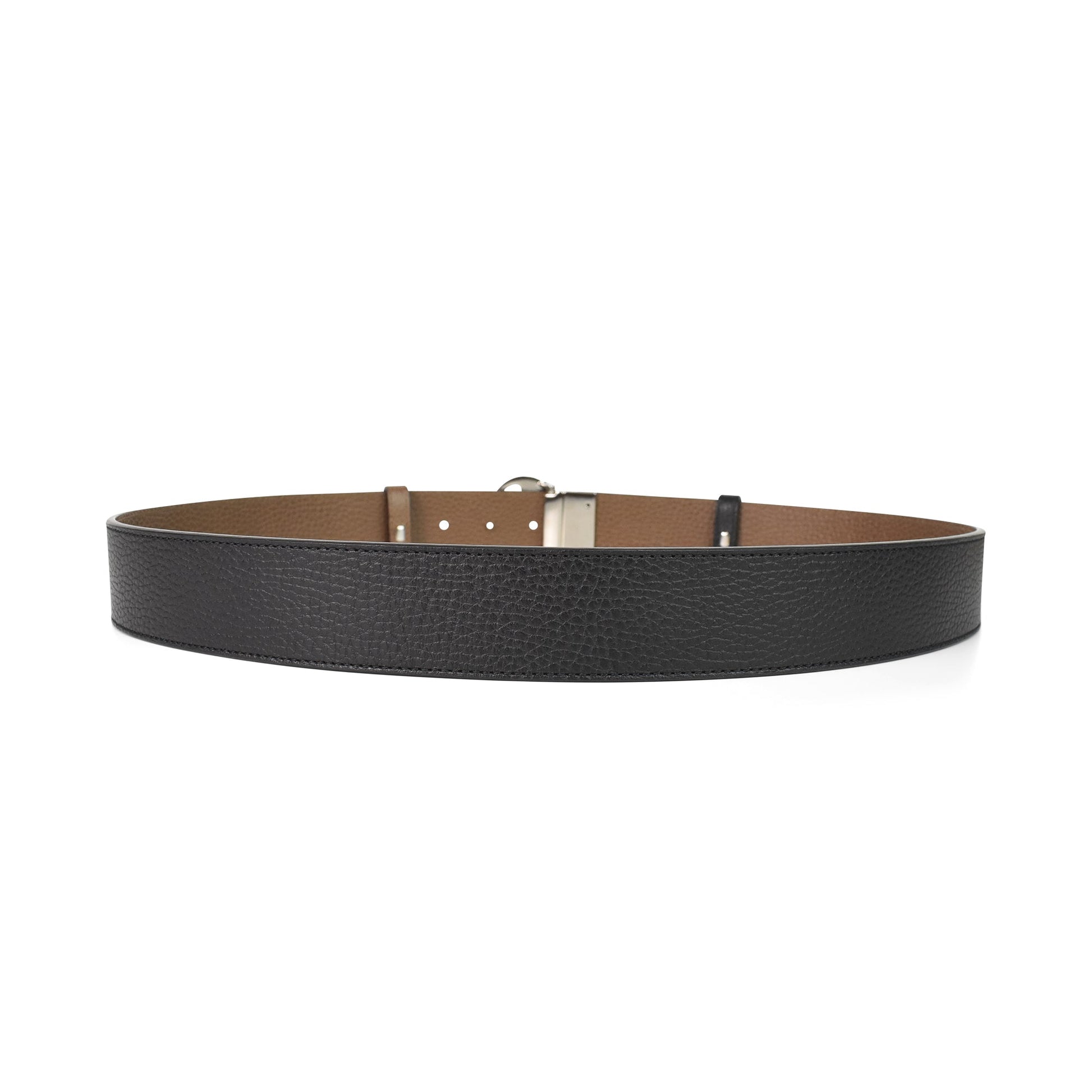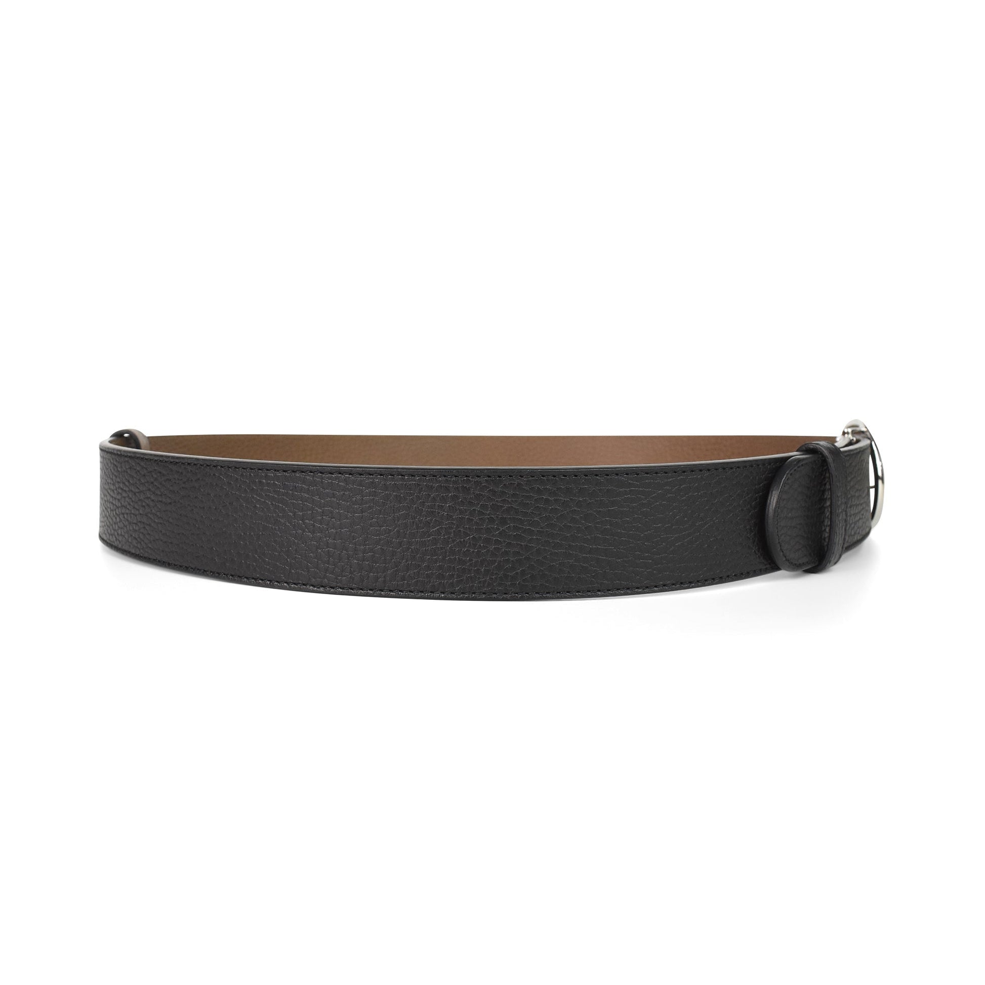 Gucci reversible belt with black grained leather on one side and taupe-brown grained leather on the other. Features a silver 'GG' buckle.