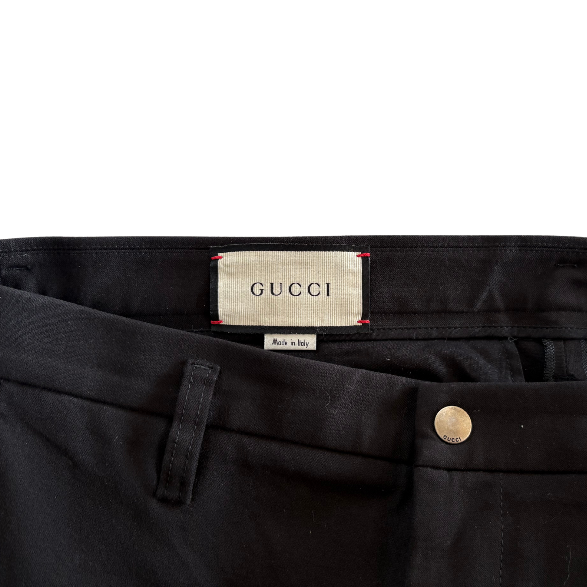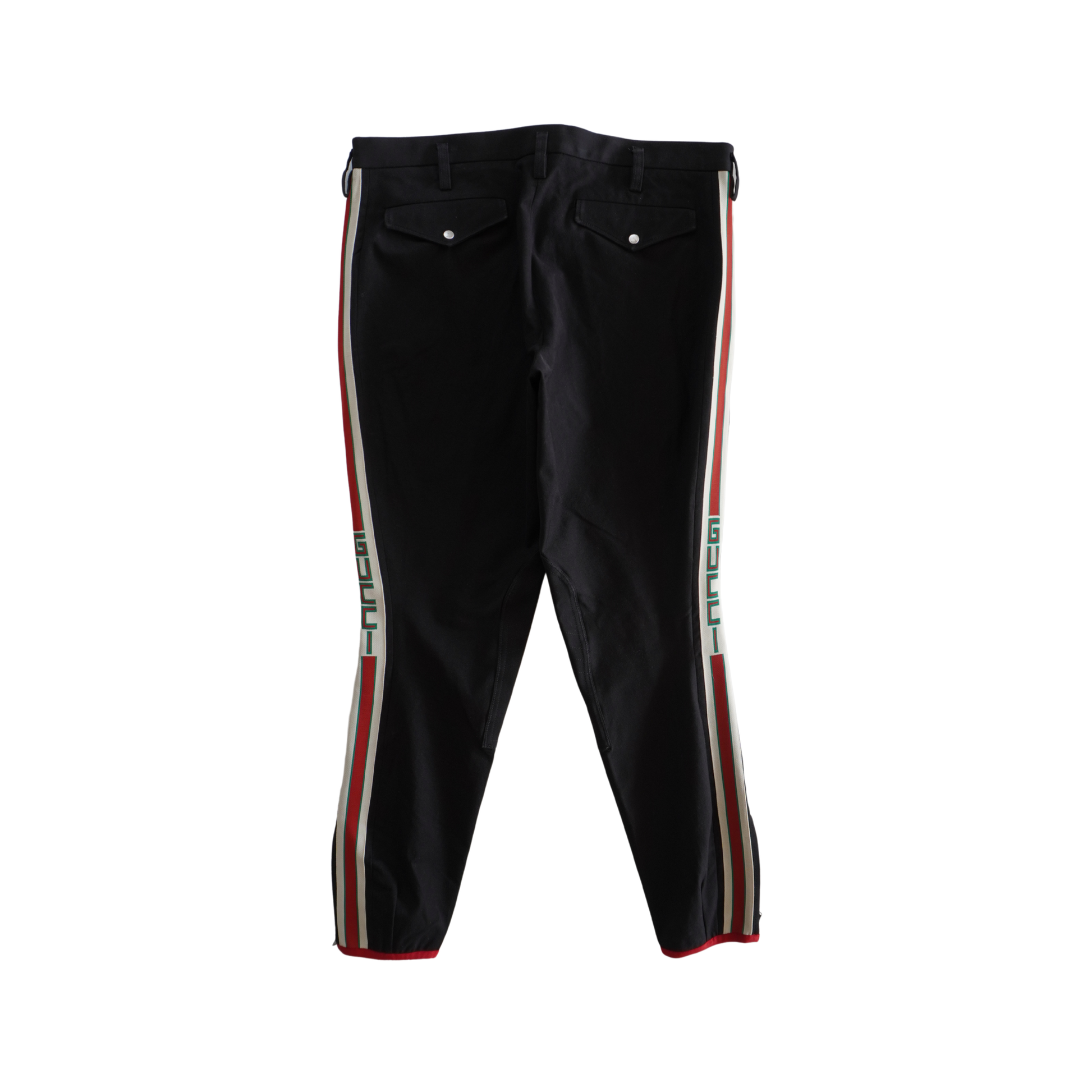 Gucci straight-leg riding pants in black cotton with a cream, red and green racing stripe with Gucci lettering on the sides. Featuring riding pant panels on the inner knee, zippers at the hem and two front slash pockets and two back flap pockets.