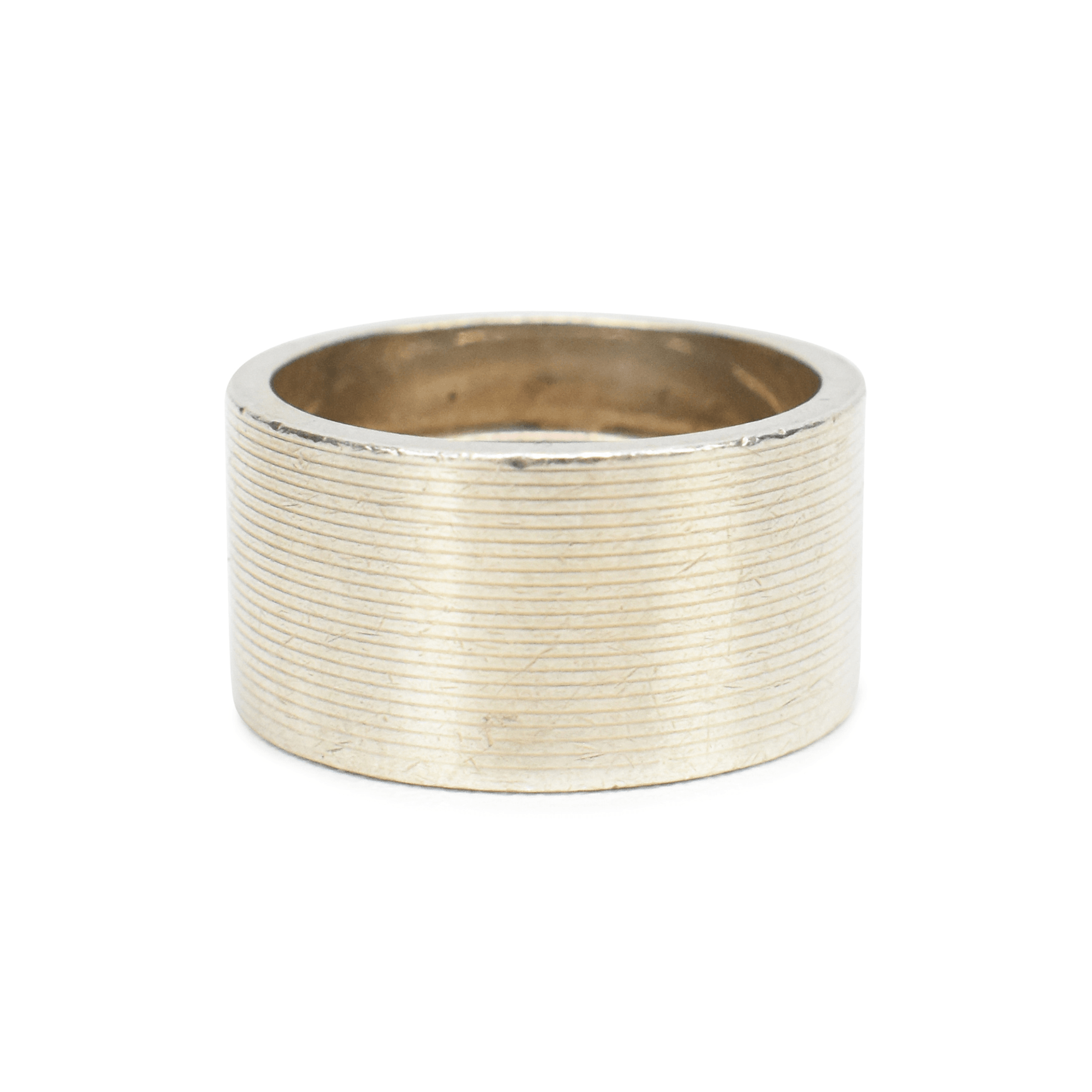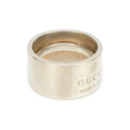 Gucci ring in 925 sterling silver with a thick outer band, slight ribbing, and an embossed logo.