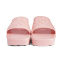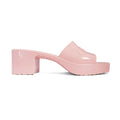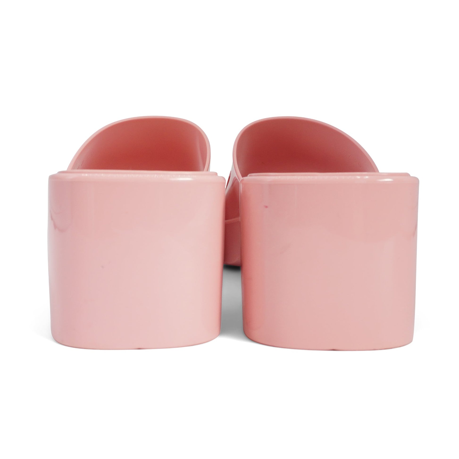 Gucci baby pink rubber slide sandals with an embossed logo on the strap and chunky block heels.