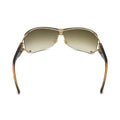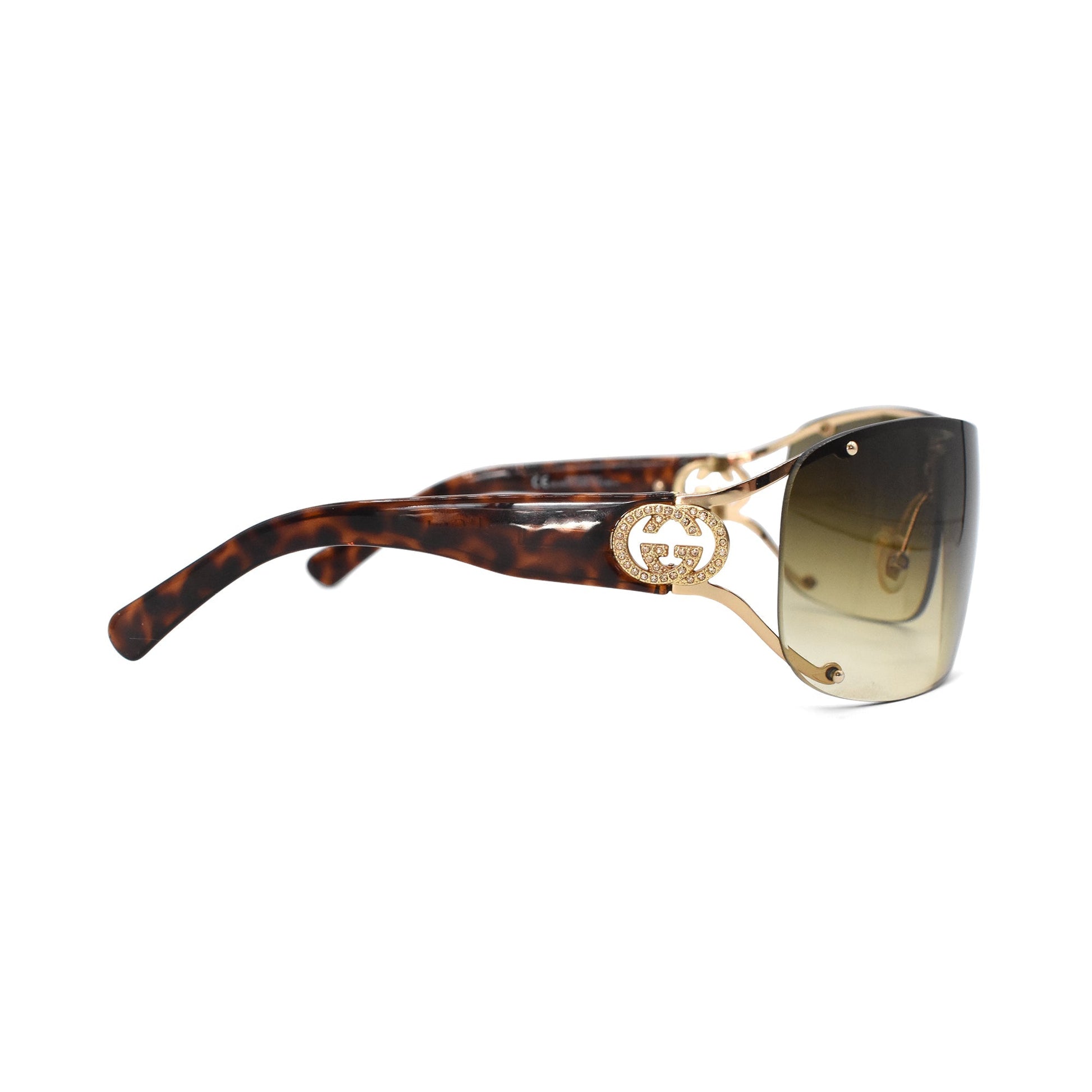 Gucci frameless shield sunglasses with brown lenses and brown tortoiseshell acetate arms. Features 'GG' logo gold hardware with rhinestones on the temples and gold hardware on the nose bridge.