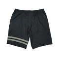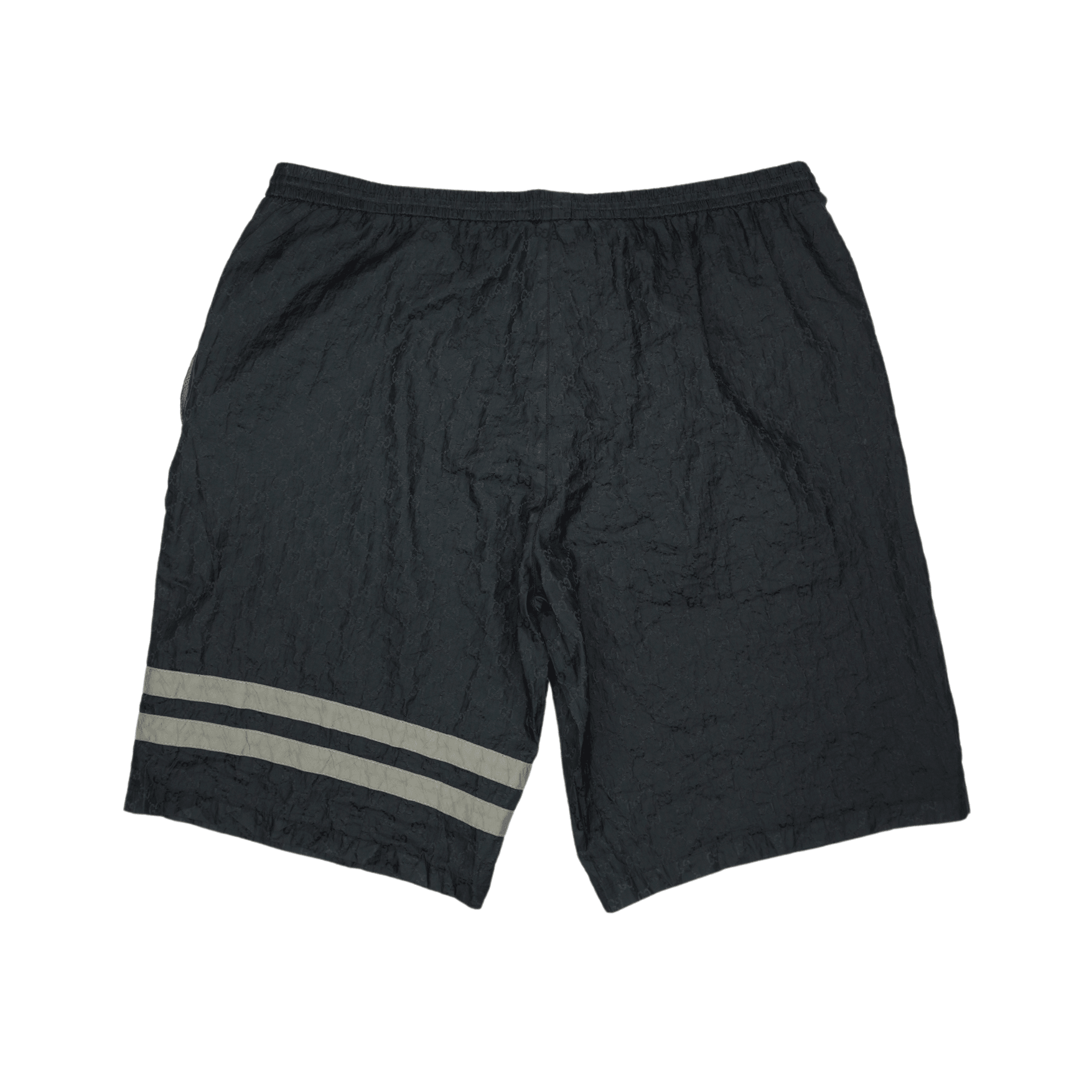 Gucci shorts in black nylon with an all-over monogram print, grey stripes around the right leg, and an elasticated waistband.