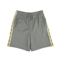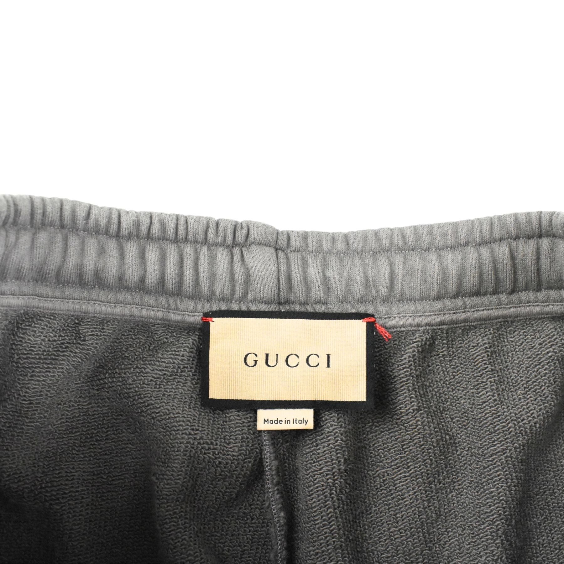 Gucci sweat shorts in grey cotton with an elastic drawstring waistband, side pockets, and a brown and tan 'GG' logo ribbon stripe down the side seams.