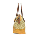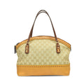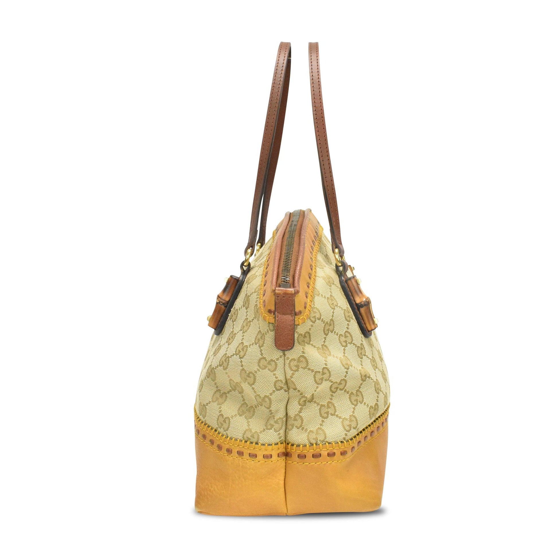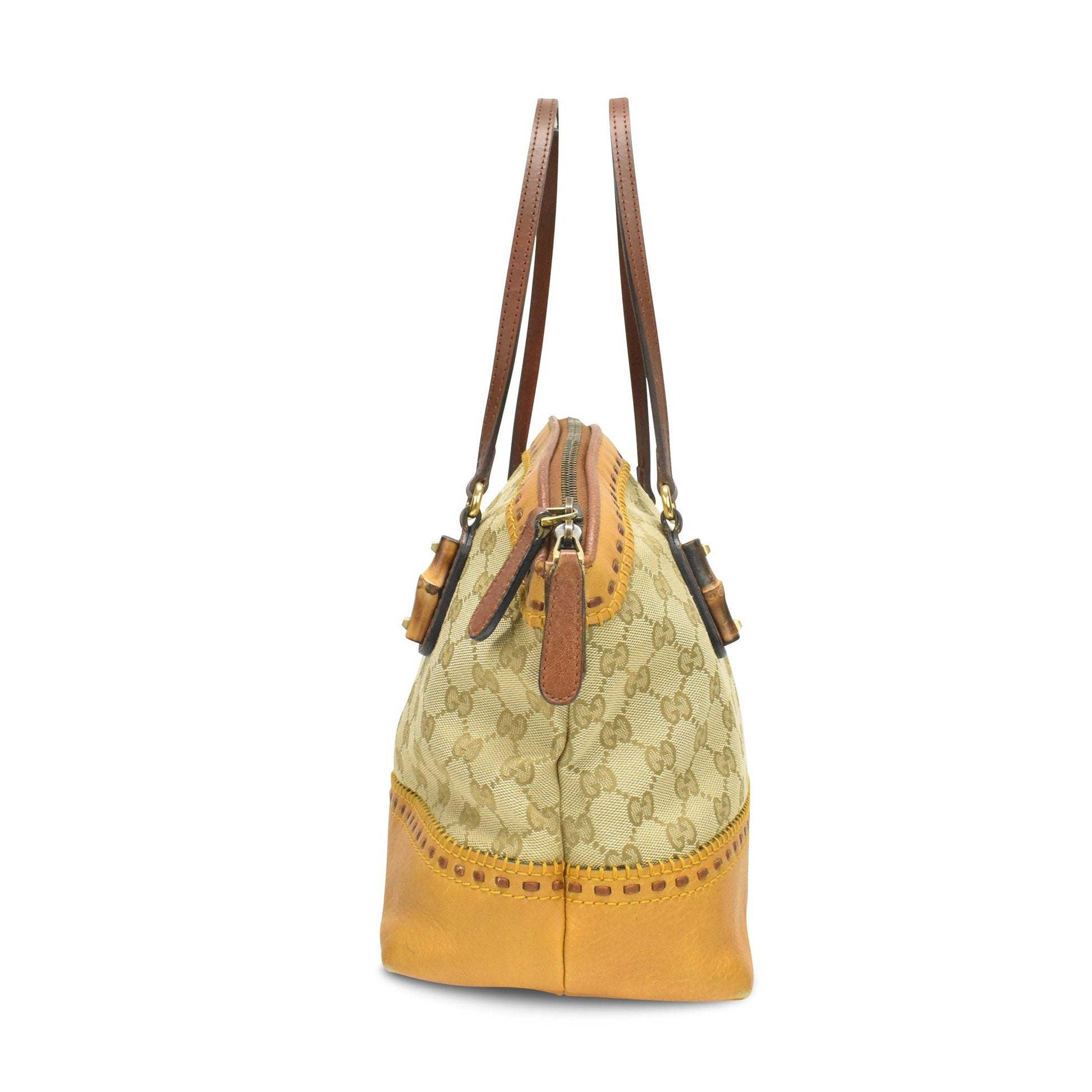 Gucci shoulder bag in beige monogram canvas with mustard yellow/tan leather base and top edge. Features brown straps, stitching detailing, and piping, brown bamboo wood details, and top zipper closure.