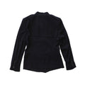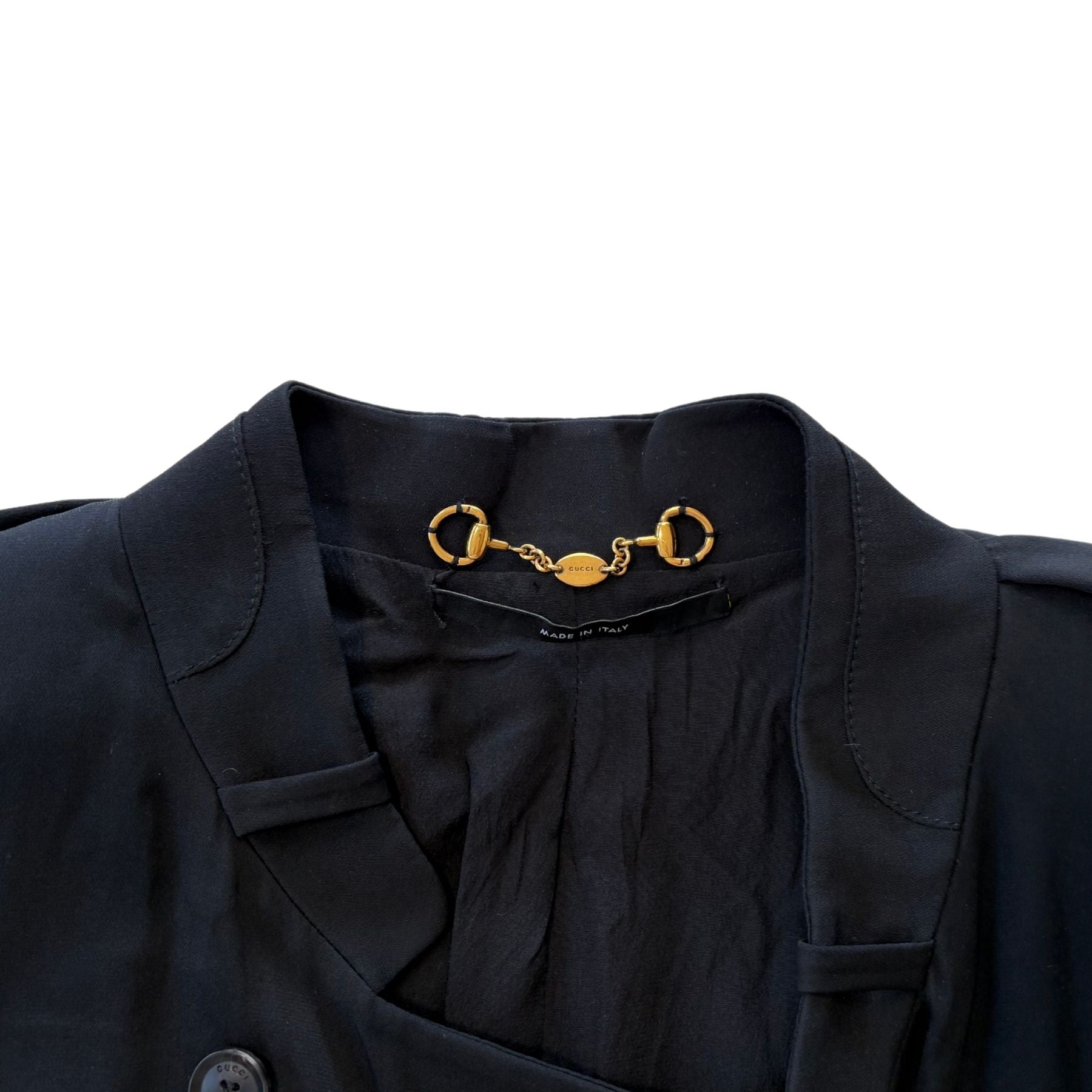 Gucci light-weight blazer in black silk with a military style double breasted button closure, faux front pockets, padded shoulders, and a raised collar.