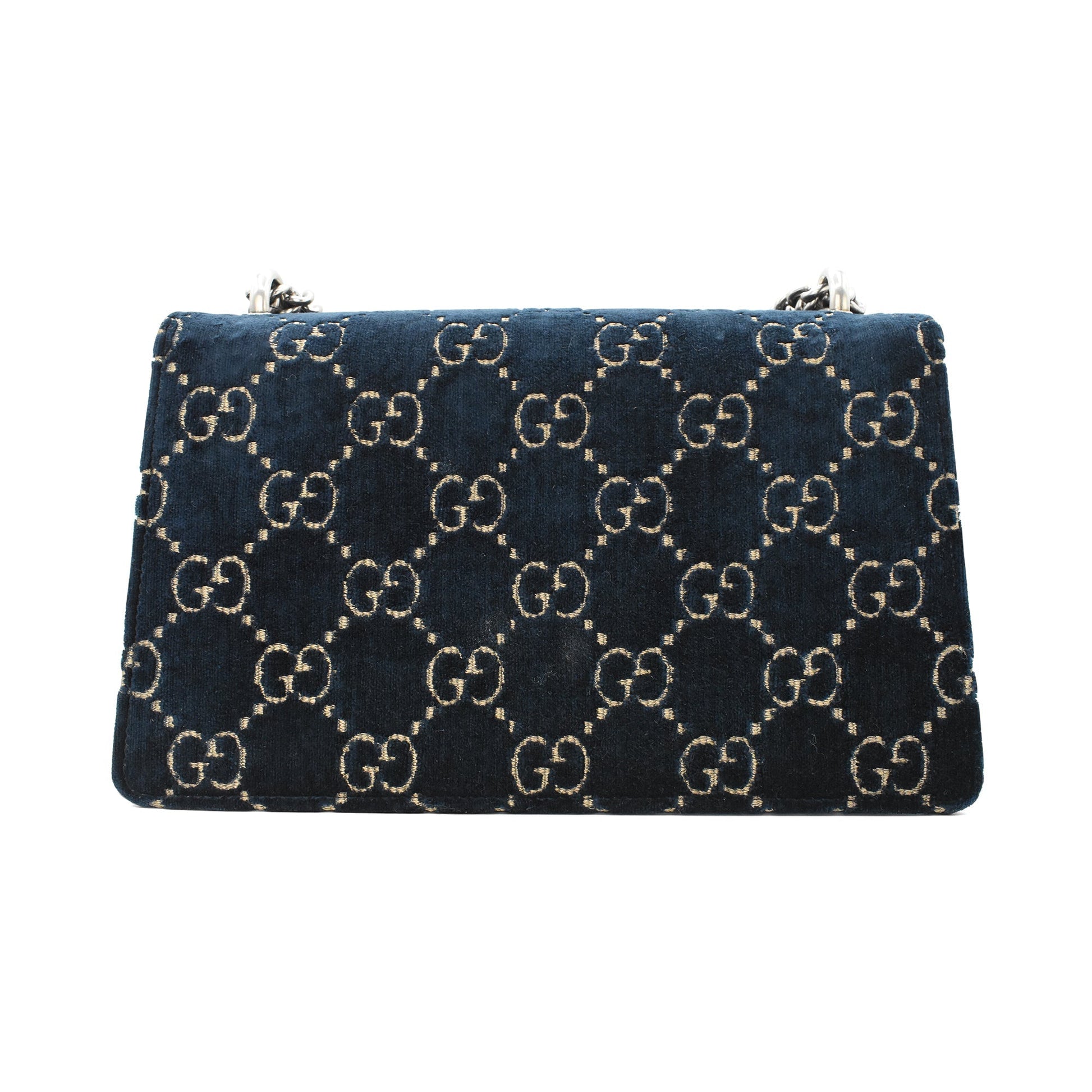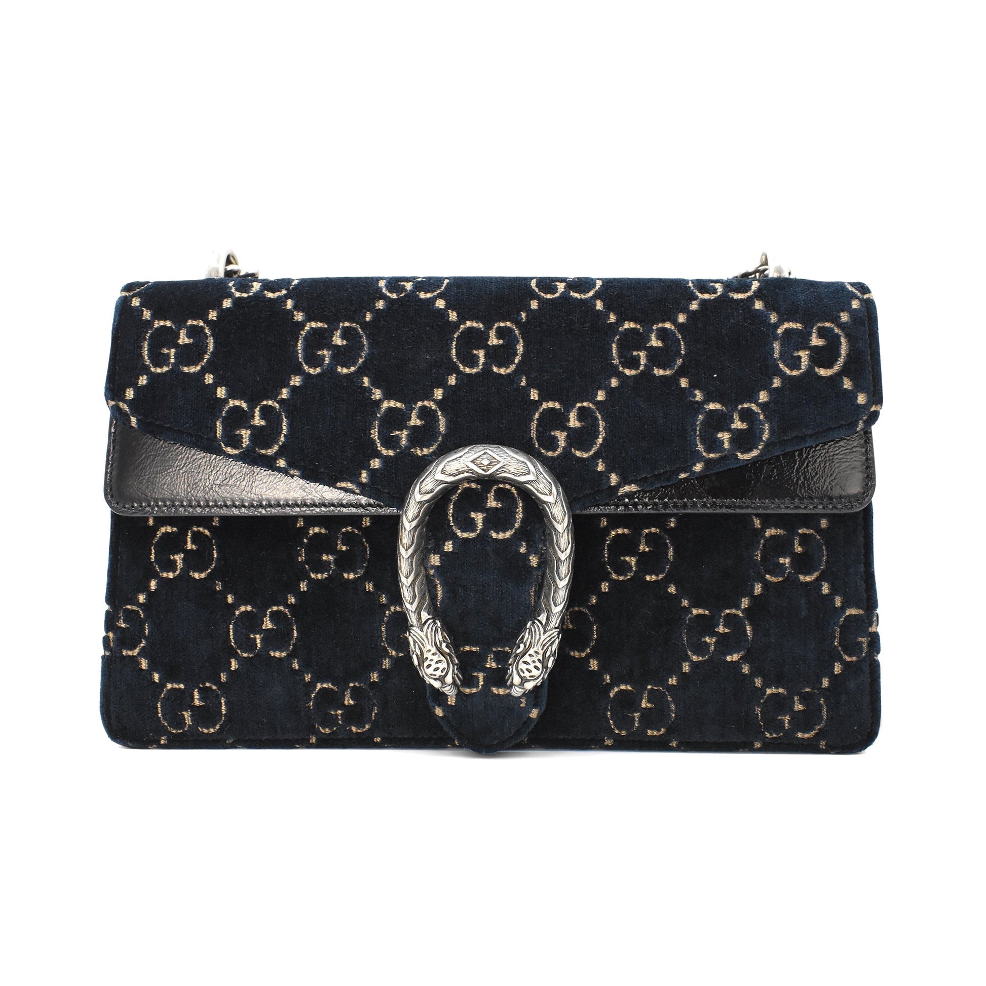 Gucci 'Small Dionysus Velvet' flap bag in navy blue velour with gold GG Supreme monogram embroidery and glazed black leather accents. Features a horseshoe buckle with dragon heads in aged silver concealing a pushlock closure. The accordion style interior is lined with blush pink suede and divided into two section with a zip pocket.