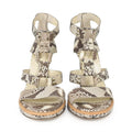 Gucci strappy heels in cream and beige python snakeskin leather with square ring hardware on the front in silver hardware. Features a back zipper closure and brown leather trim at the sole.