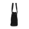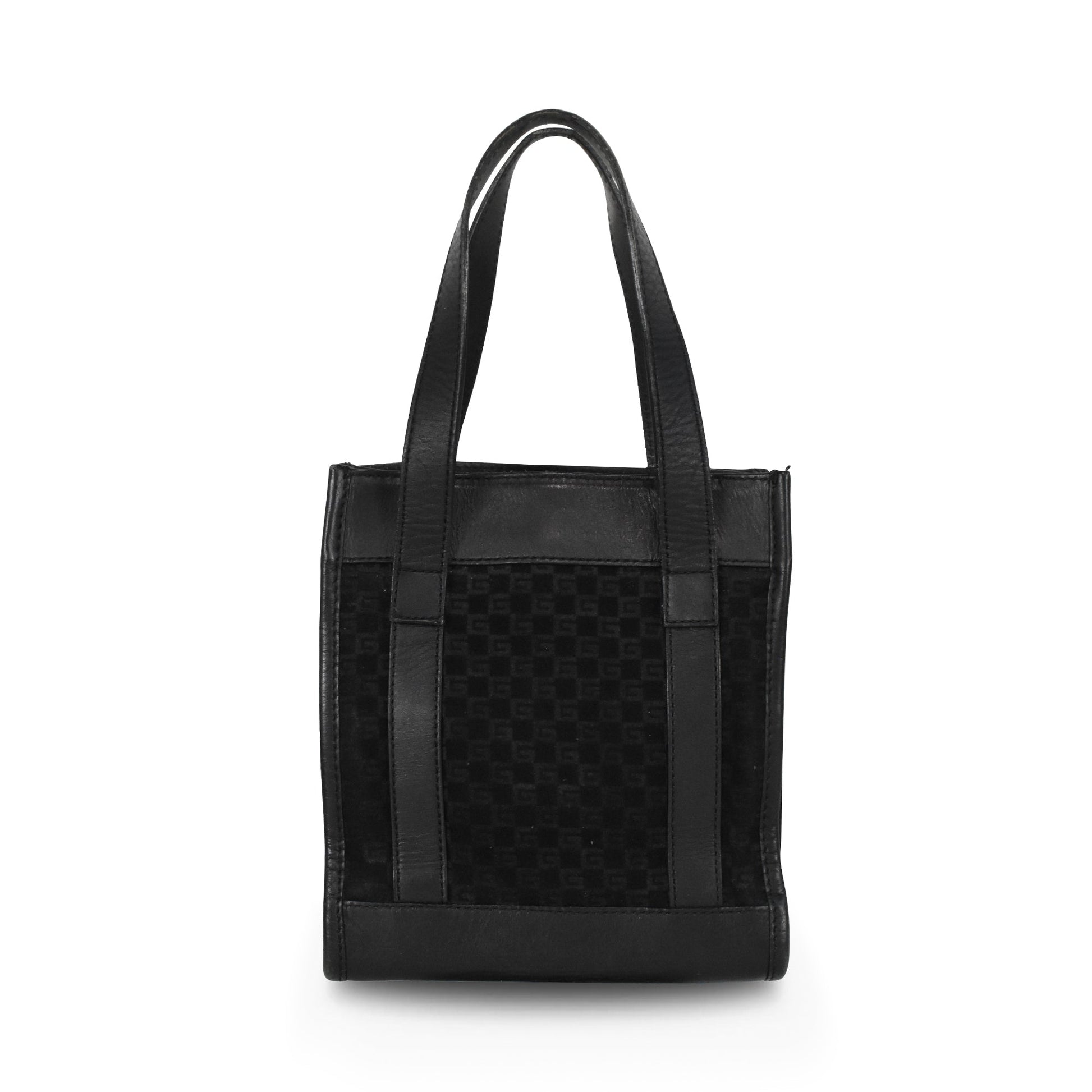 Gucci mini tote back in black felted wool embossed with a cubic G monogram. Features black leather accents and a fabric lining with interior zip pocket.