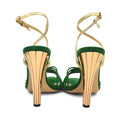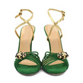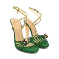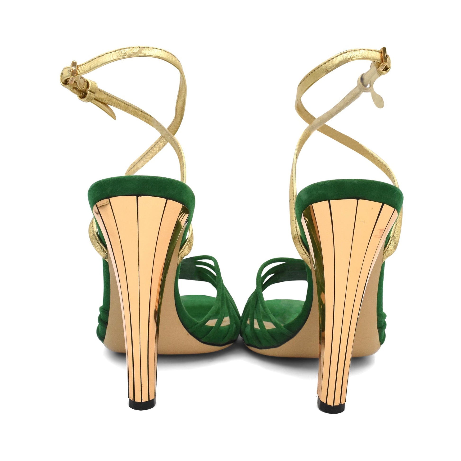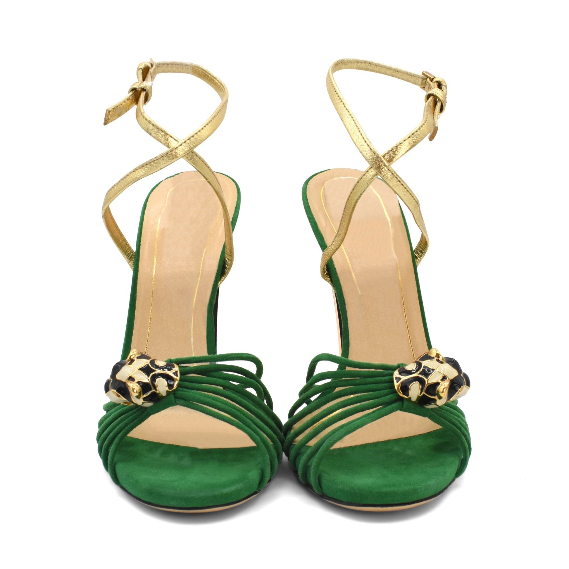 Gucci 'Tiger' strappy heeled sandals in green suede with gold metallic ankle strap. Features multiple toe-straps with a black and white enamel tiger head charm, and gold-tone metallic heel.