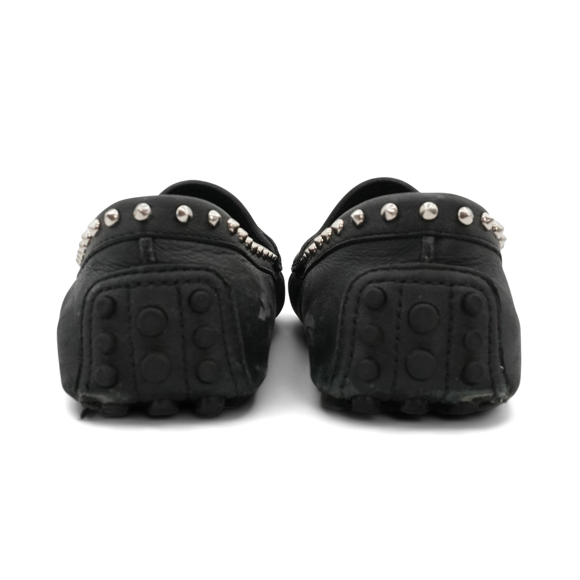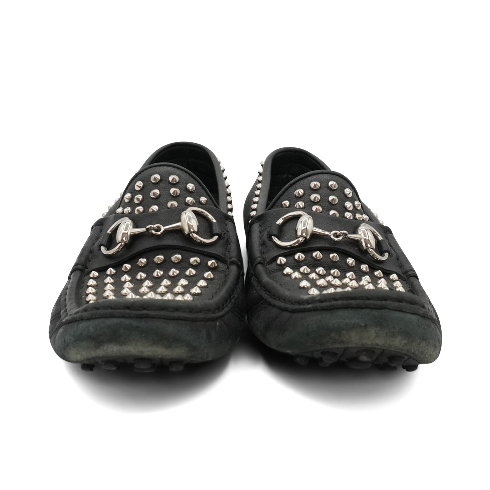 Gucci loafers in black leather with a silver horsebit detail at the toe and studding hardware throughout.