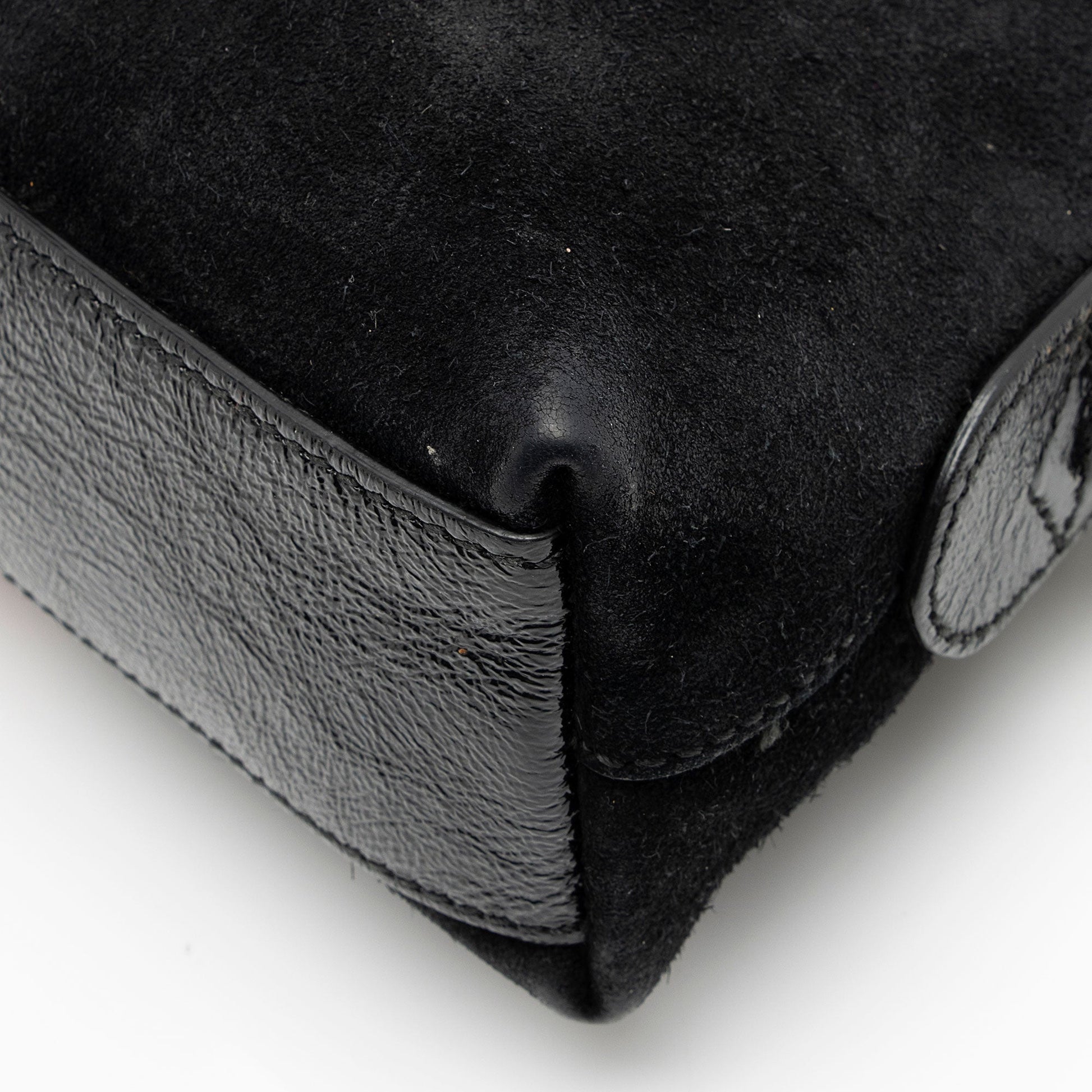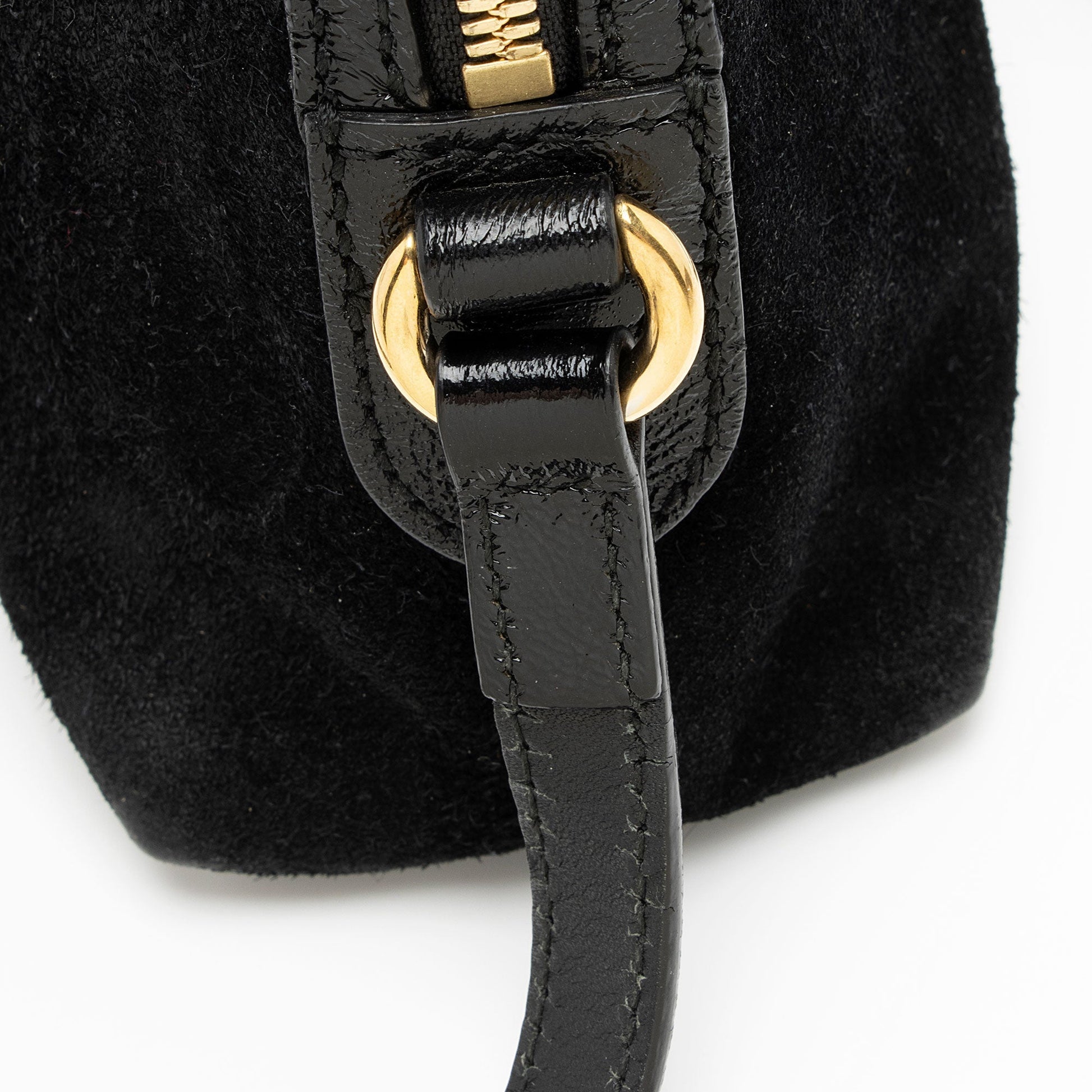 Condition Notes: Visible scuffs and wear to exterior bottom corners. Light marks and scuffs throughout exterior suede. Visible marks to shoulder strap from hardware. Surface scratches to hardware. Light marks throughout interior.