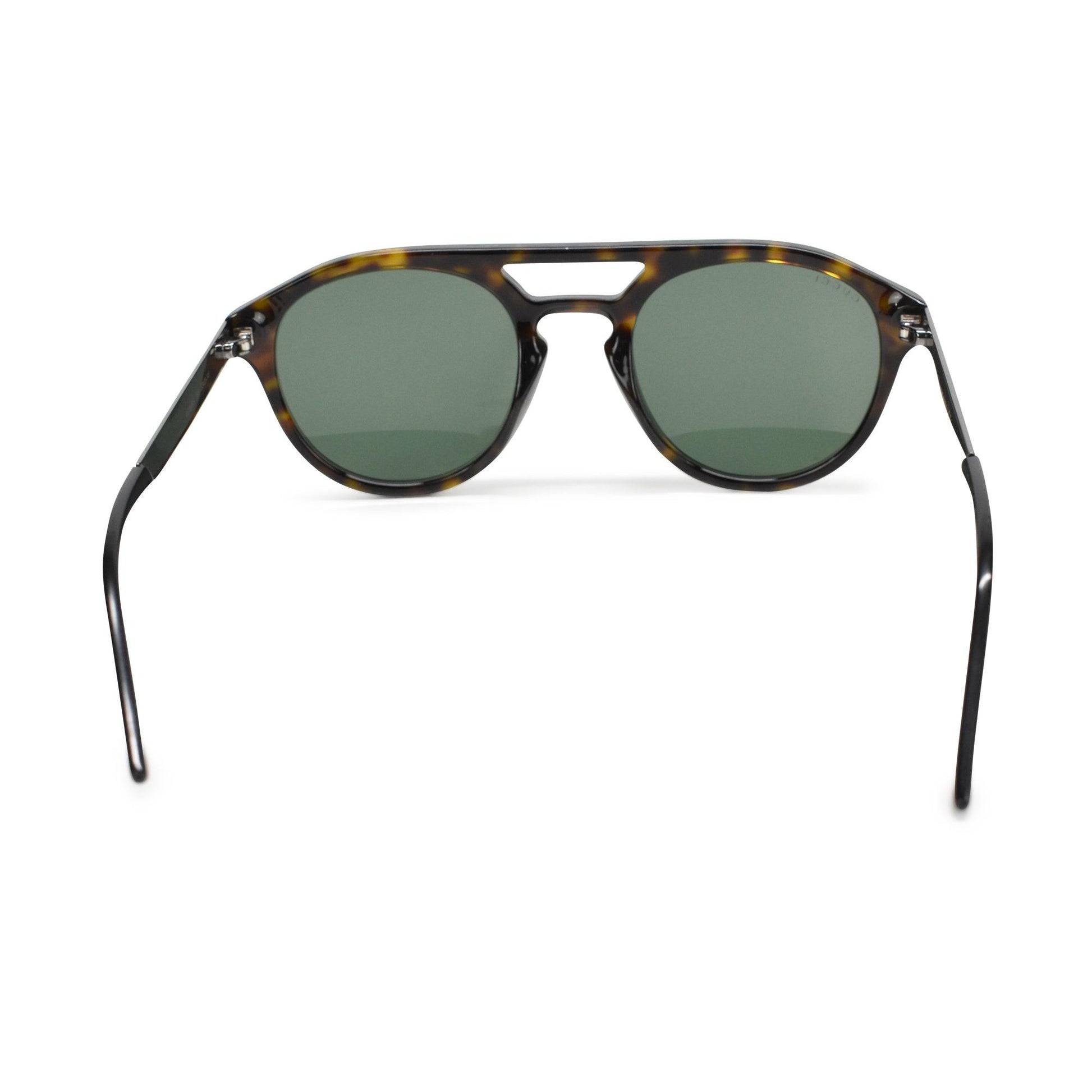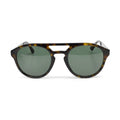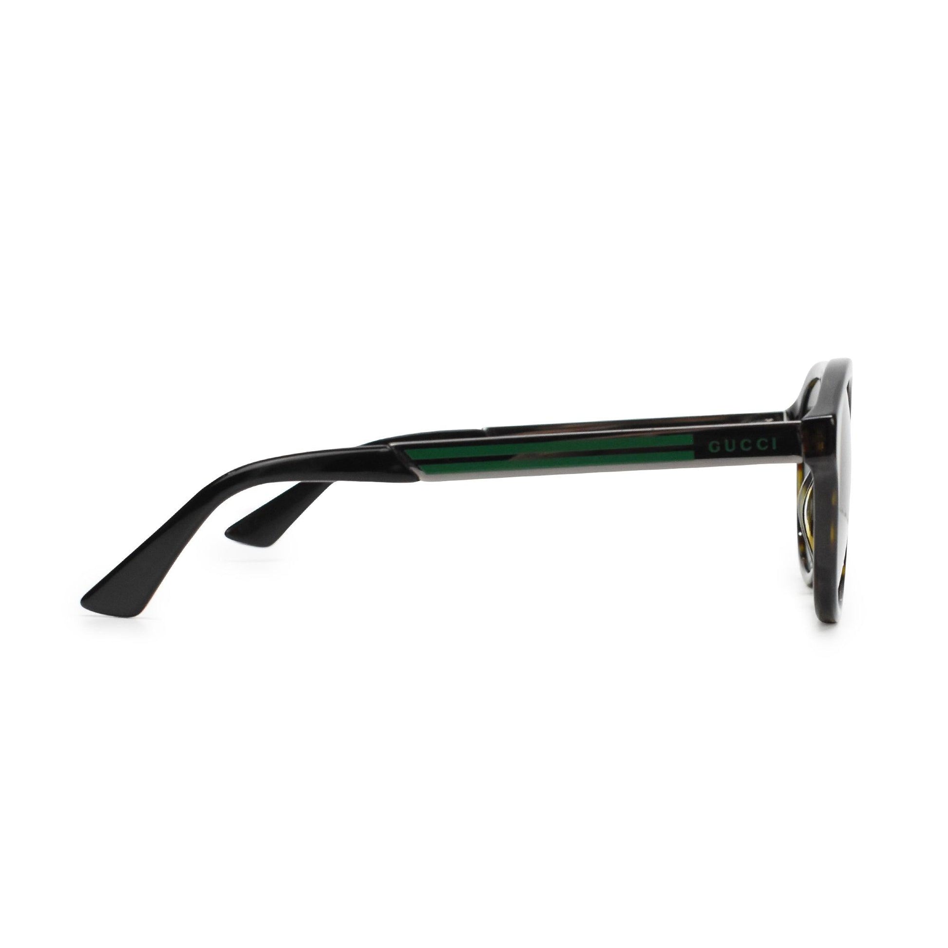Gucci rounded sunglasses in brown tortoise acetate with a brow bar cutout and silver metal arms with green enamel stripes.