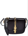 Elevate your style with the Gucci Sylvie 1969 Mini Leather Shoulder Bag. This iconic accessory is a must-have for any fashion-forward woman. Made in Italy with black leather and gold-tone hardware, this shoulder bag features a chain accent for added elegance. The interior is lined with luxurious fabric, and the adjustable shoulder strap allows for a customizable fit. The fold-over flap with turnlock closure adds a touch of sophistication. Measuring 6.6 inches wide, 5 inches high, and 2.75 inches deep, this compact bag is perfect for carrying your essentials in style. Please note that all measurements are approximate. Rest assured, this product is genuine and . Add a touch of Italian luxury to your wardrobe with the Gucci Sylvie 1969 Mini Leather Shoulder Bag.