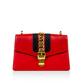 An instant classic the moment it hit the shelves, the Gucci Sylvie is one of those bags that every luxury-loving woman needs in her wardrobe. This stunning red baby is complimented by the brand's signature red and green striped ribbon handle and also features a removable leather shoulder strap ideal for cross-body usage. The Sylvie is an absolute necessity, especially during holiday season. With a gold buckle chain prominently depicted on the front flap, the Sylvie is luxurious, glamorous and the perfect compliment to any neutral-toned or monochromatic outfit. Whether you dress her up or down, you can be sure this bright, bold piece is the ideal accessory for any occasion. Sleek, stylish, sophisticated but youthful and playful at the same time, the Sylvie is a well-worthy addition to any luxury handbag collection.
