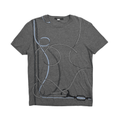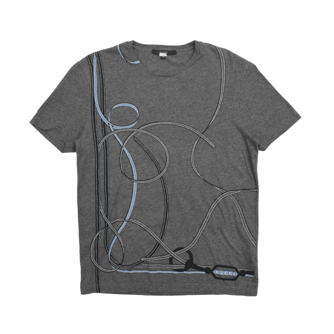 Gucci t-shirt in heather grey cotton with blue and navy ribbon graphics across the front.