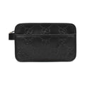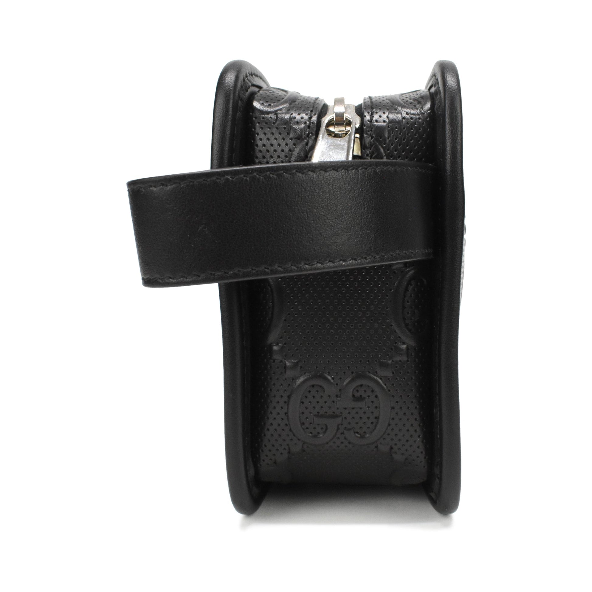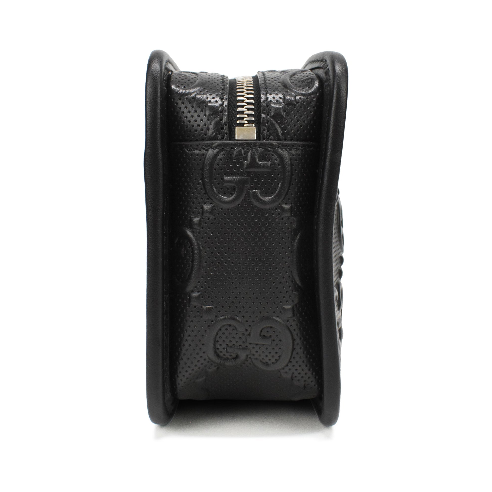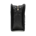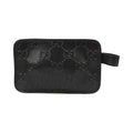 Gucci rectangular toiletry pouch in black raised supreme monogram leather with a top zip closure in silver hardware. Features a front slip pocket and a small handle strap. The interior is white canvas lined with a push-button closure pocket.