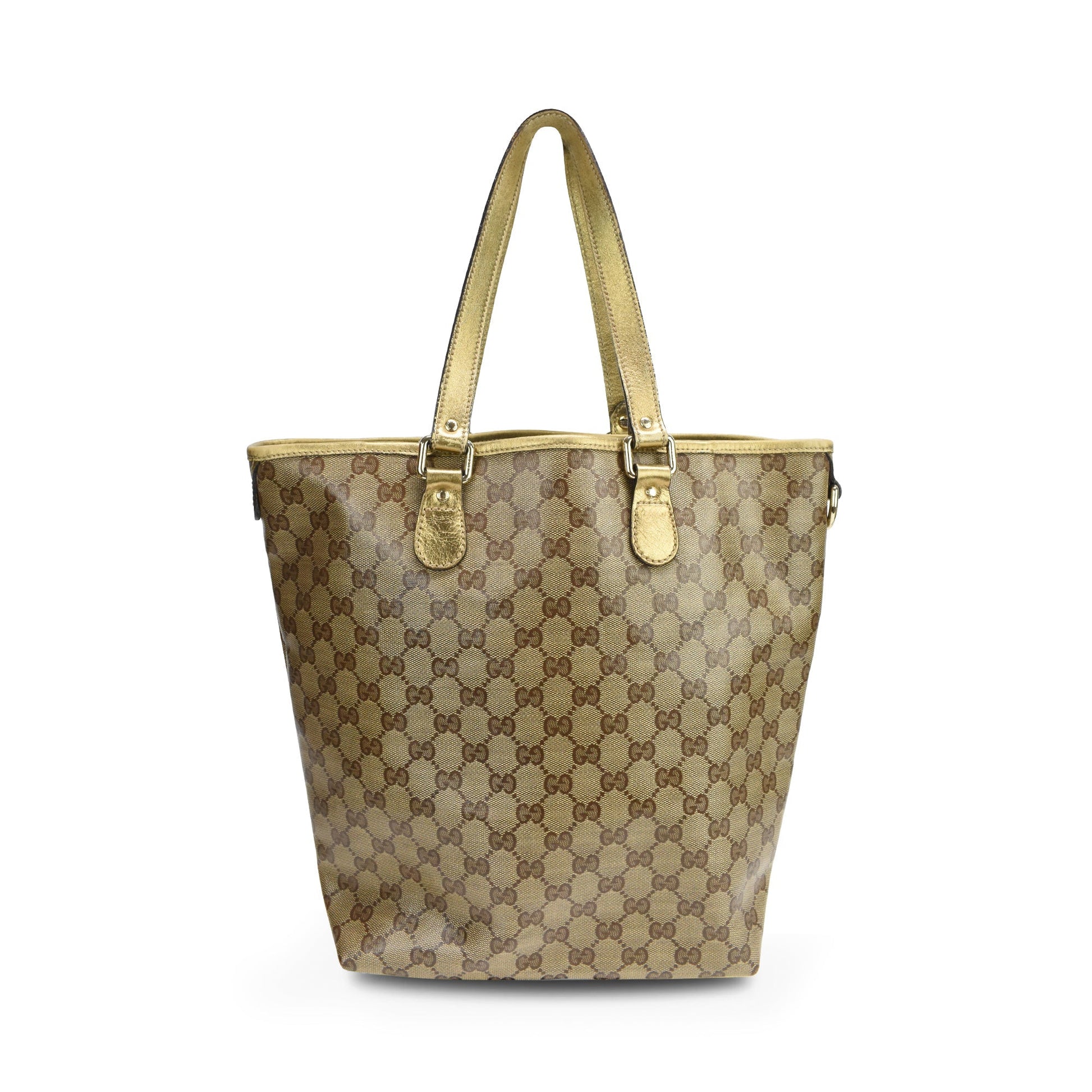 Gucci tote bag in brown logo monogram coated canvas with metallic gold leather trim. Features two flat top handles and a gold d-ring on the side. The interior is brown fabric lined.