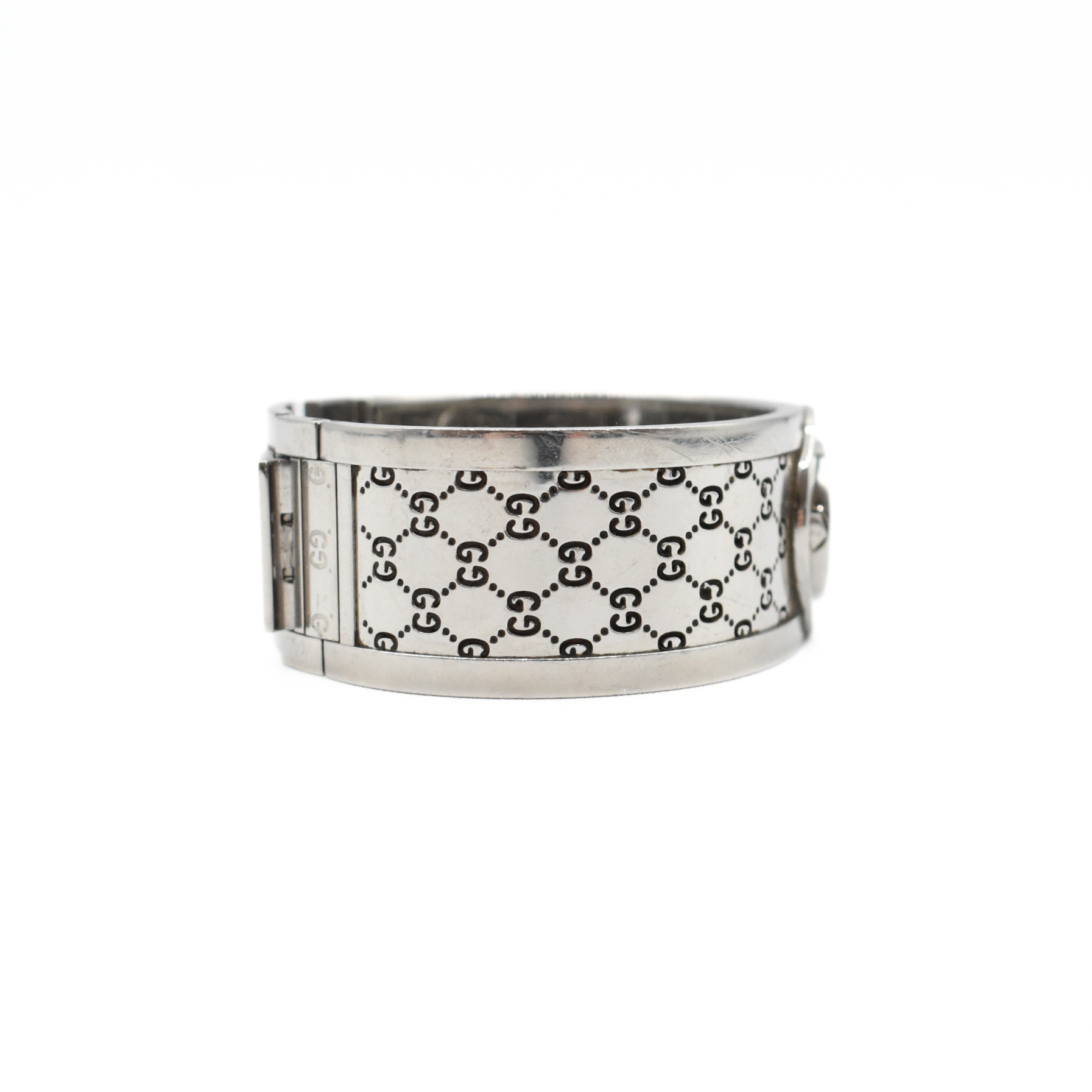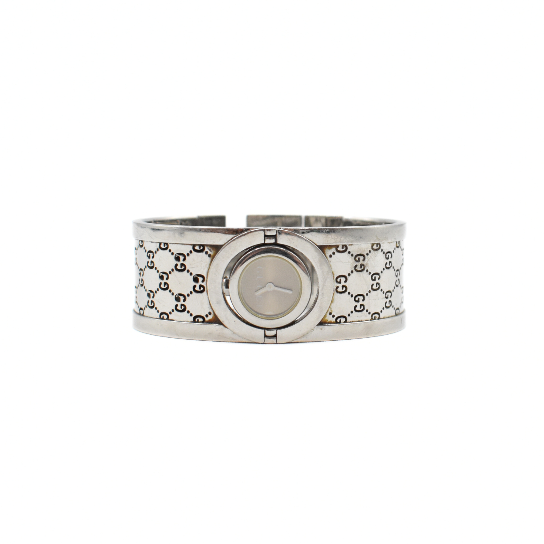 Gucci 'Twirl' watch in silver stainless steel with a 'GG' monogram embossed thick band, a grey quartz face with a swivel detail, and a butterfly clasp closure.