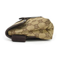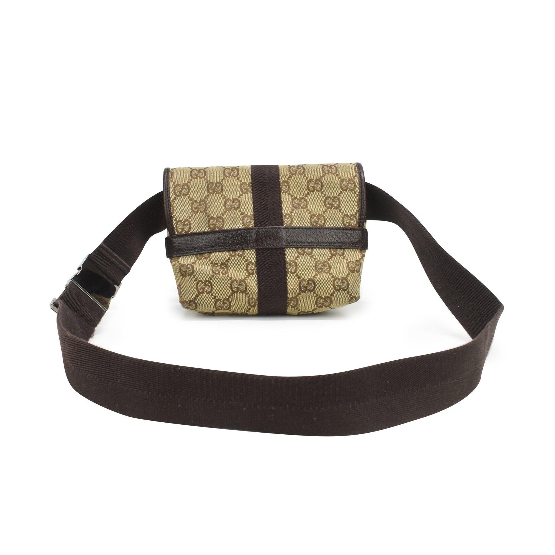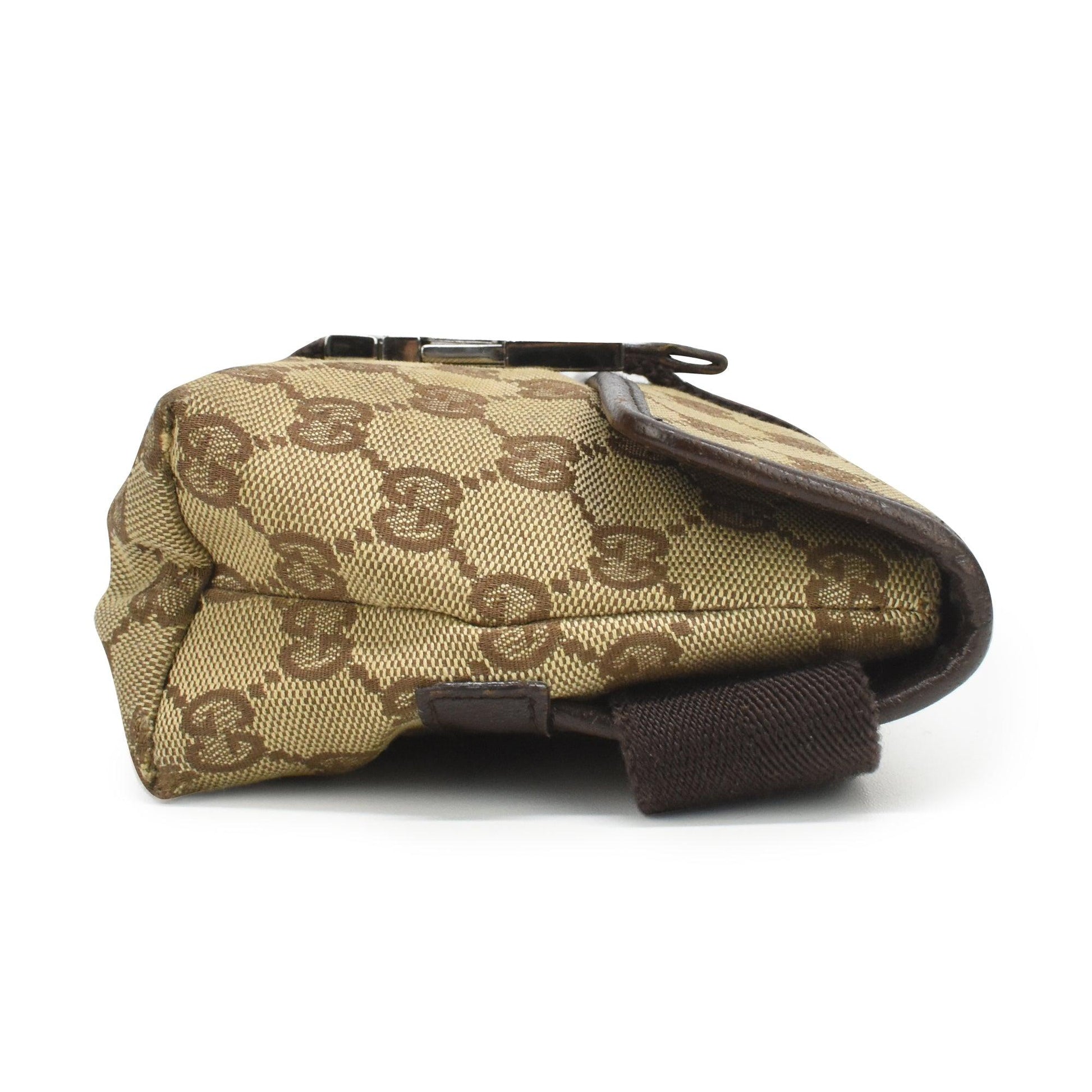Gucci waist bag in beige monogram canvas with brown leather trim, an adjustable canvas strap, and a large buckle closure in silver hardware.