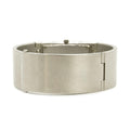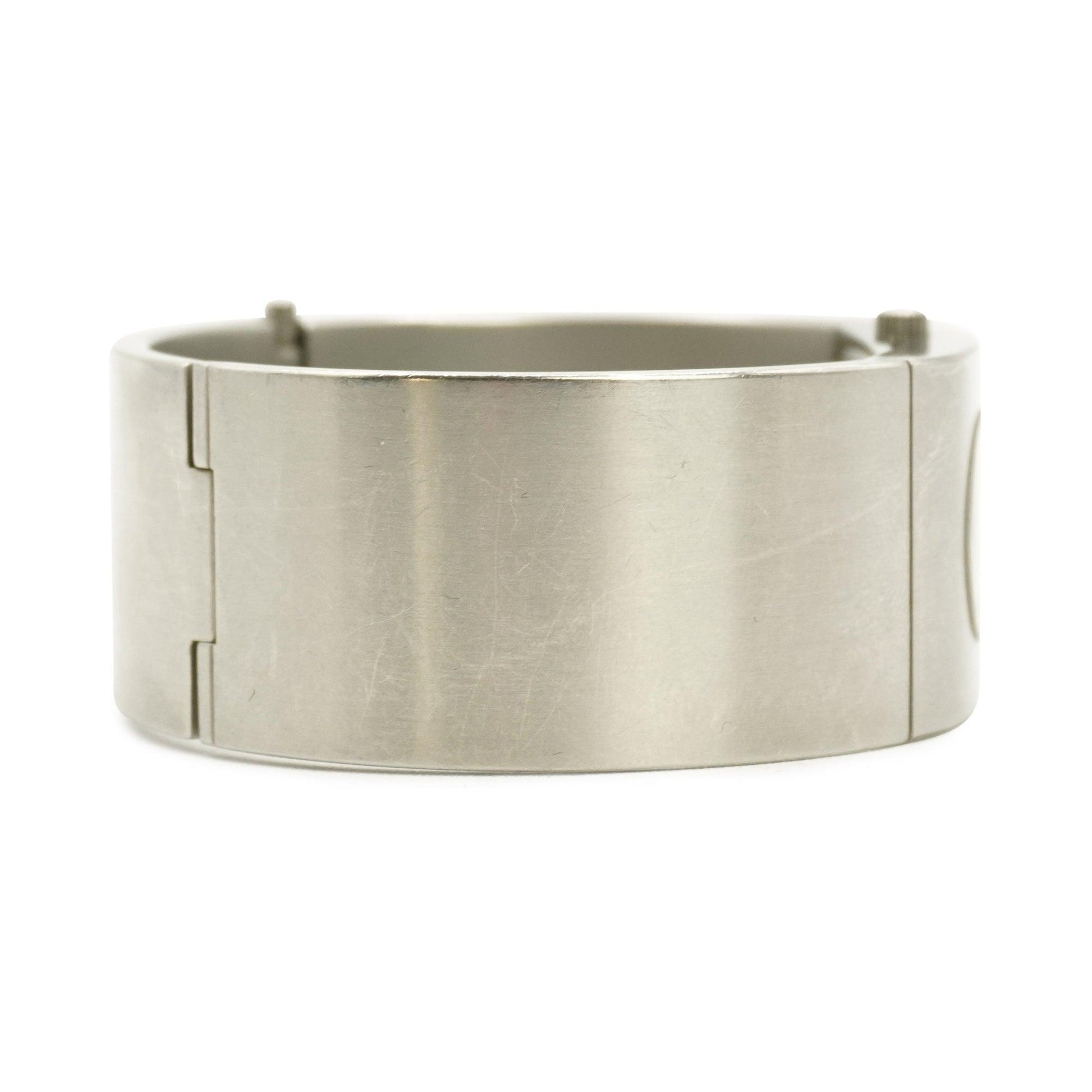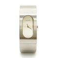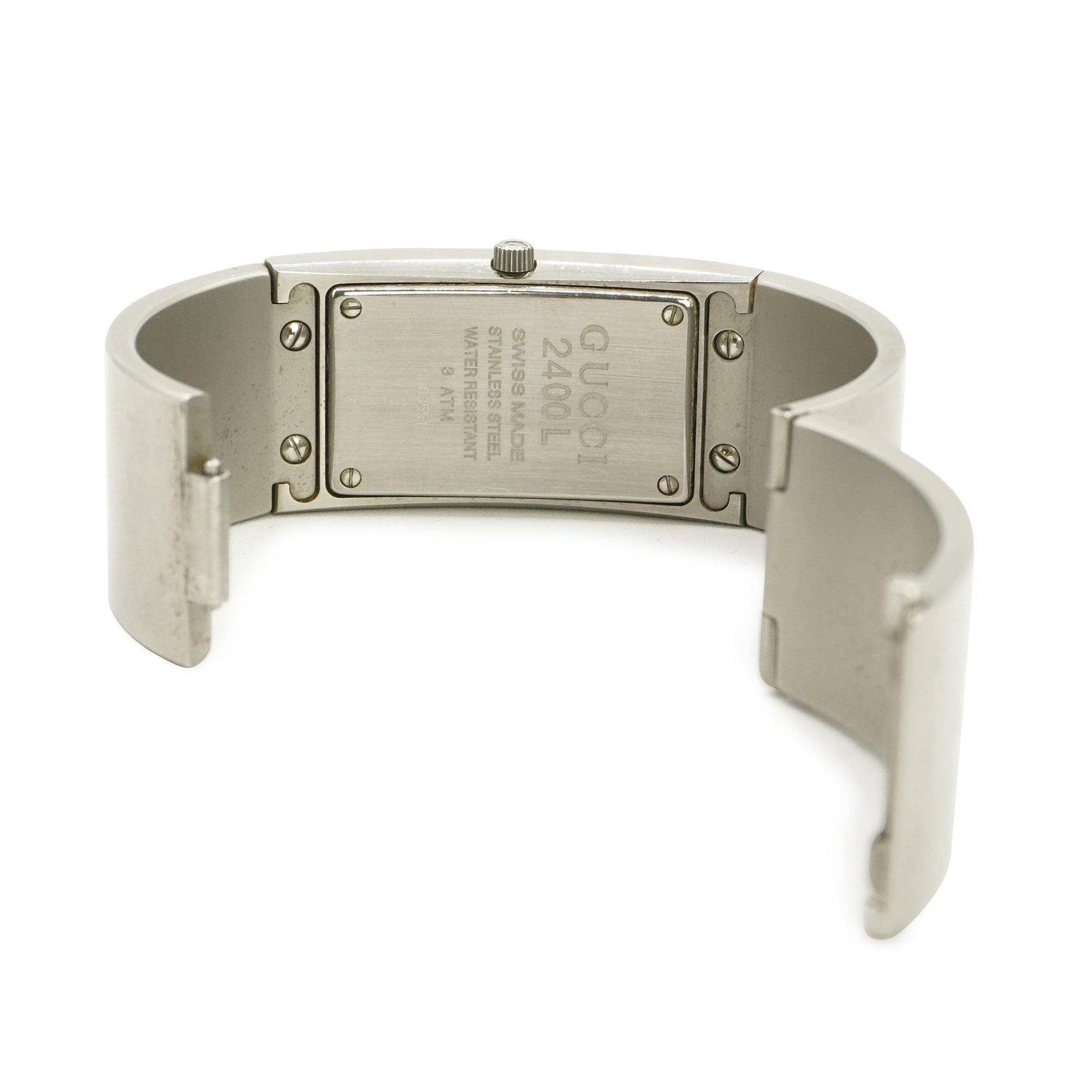 Gucci vintage bangle watch in silver hardware with an oval face and a push button closure.