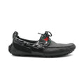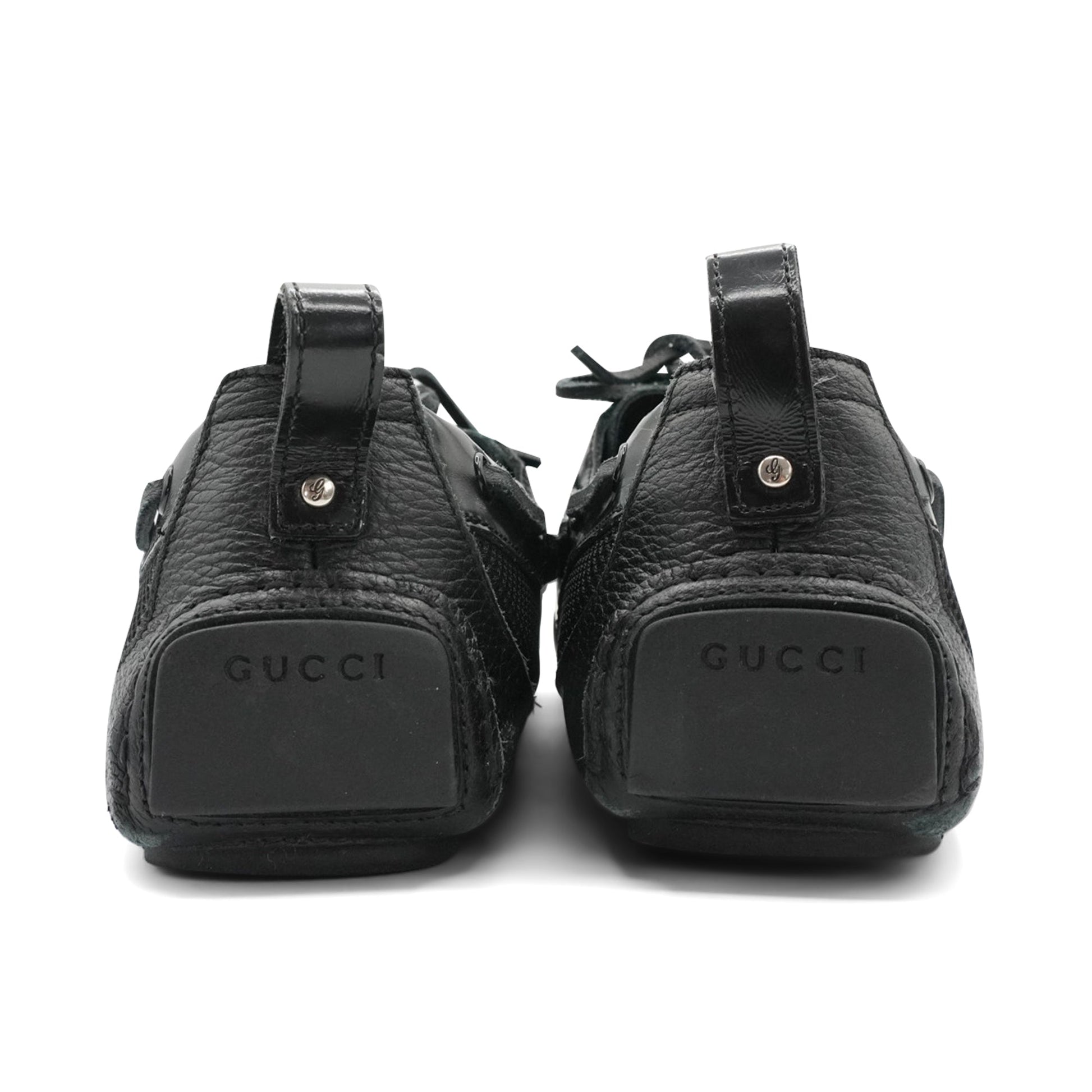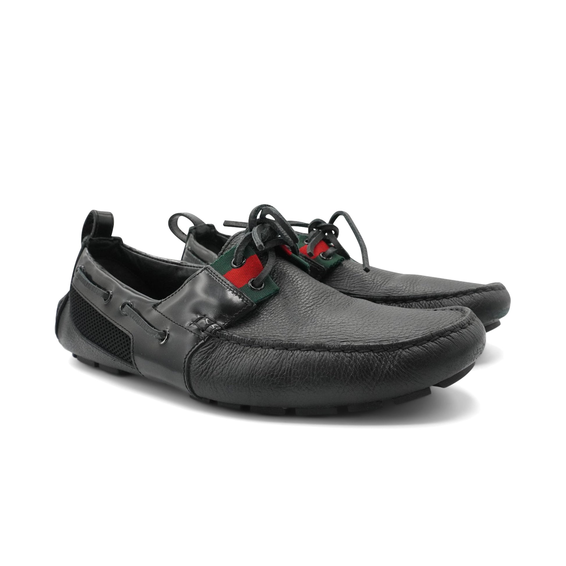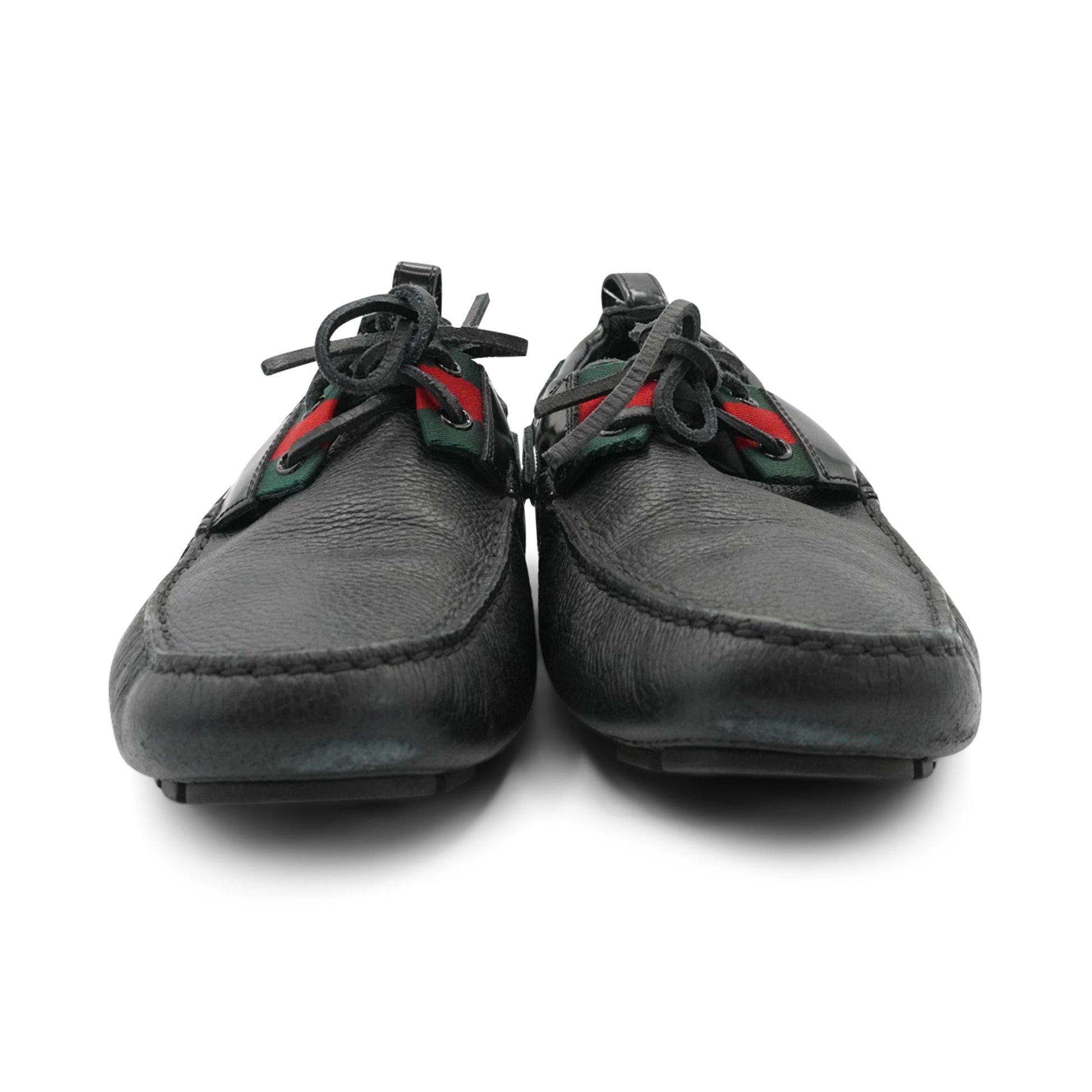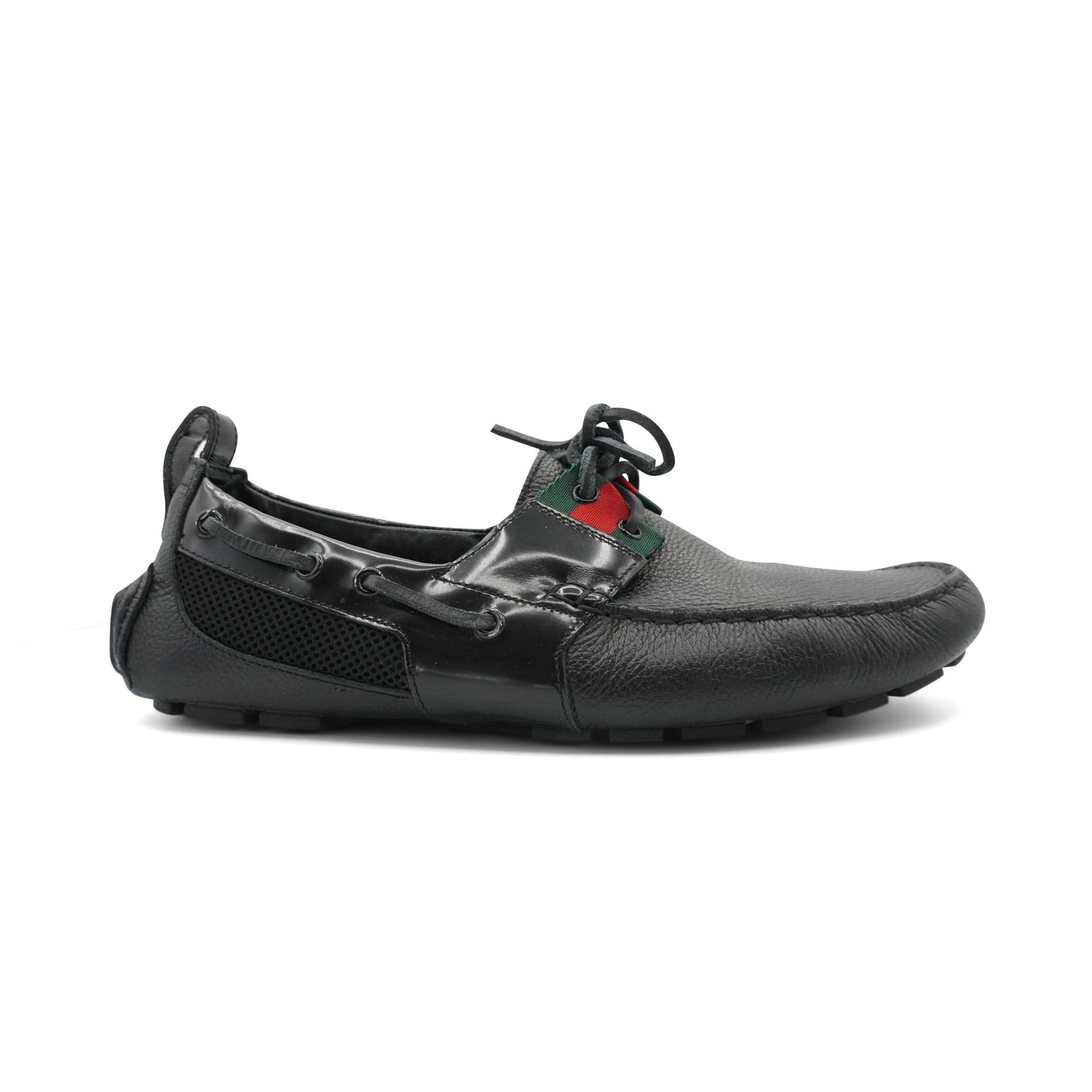 Gucci 'Web' loafers in black grained leather with a patent leather trim, mesh panelling at the sides, and signature red and green racing stripe detail.