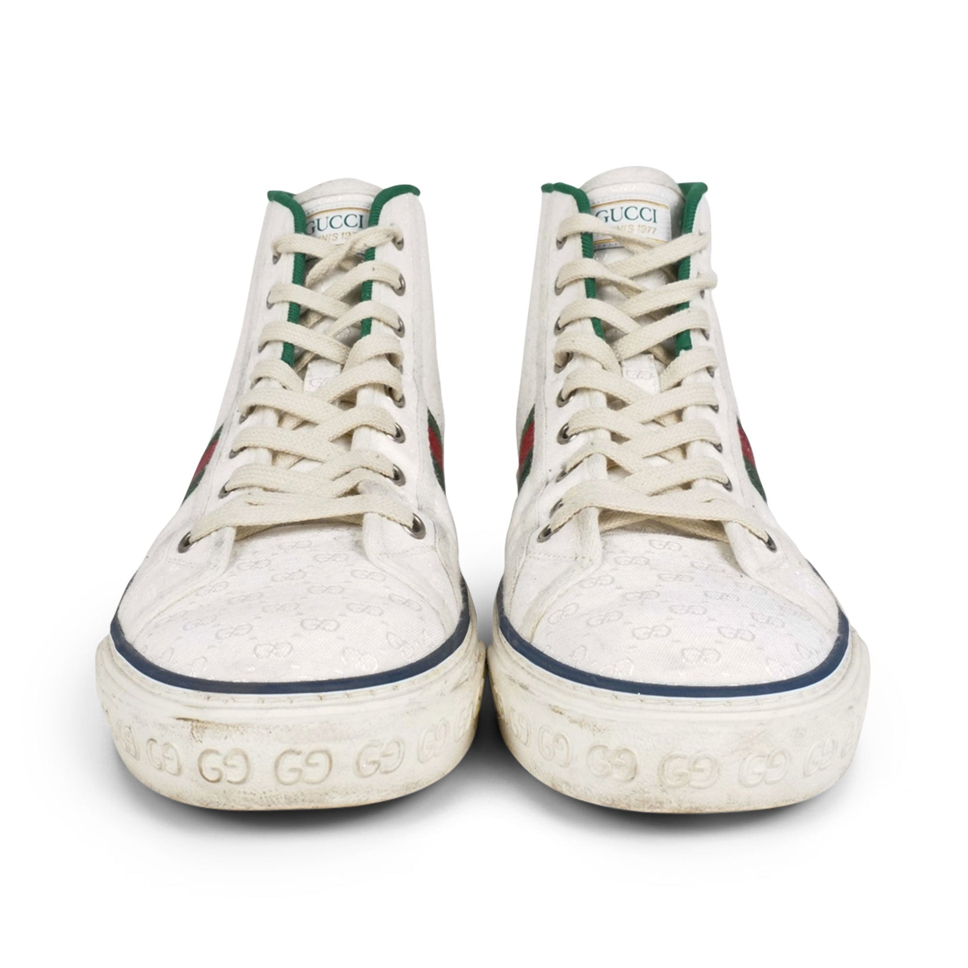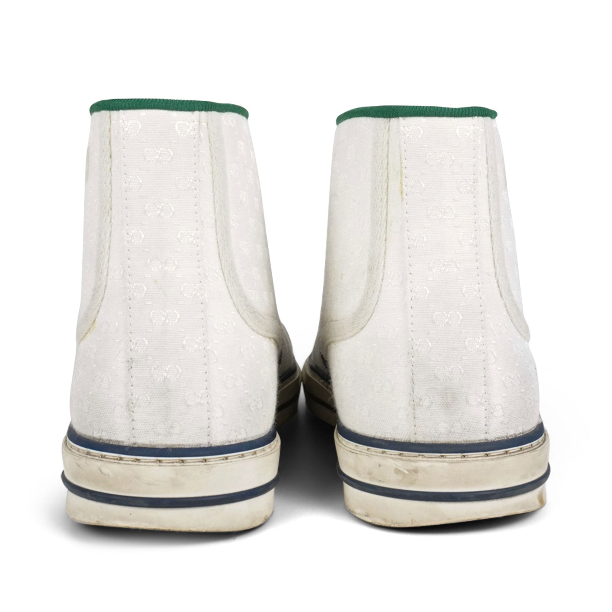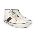 Gucci 'Tennis 1977' high-top sneakers in white canvas monogram with a green trim, web racing stripe, and a lace-up closure. Features a rubber and stripe sole with GG logo.
