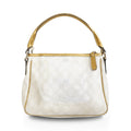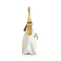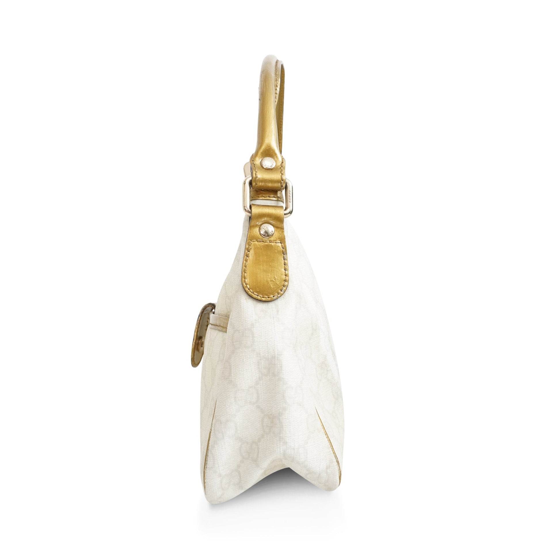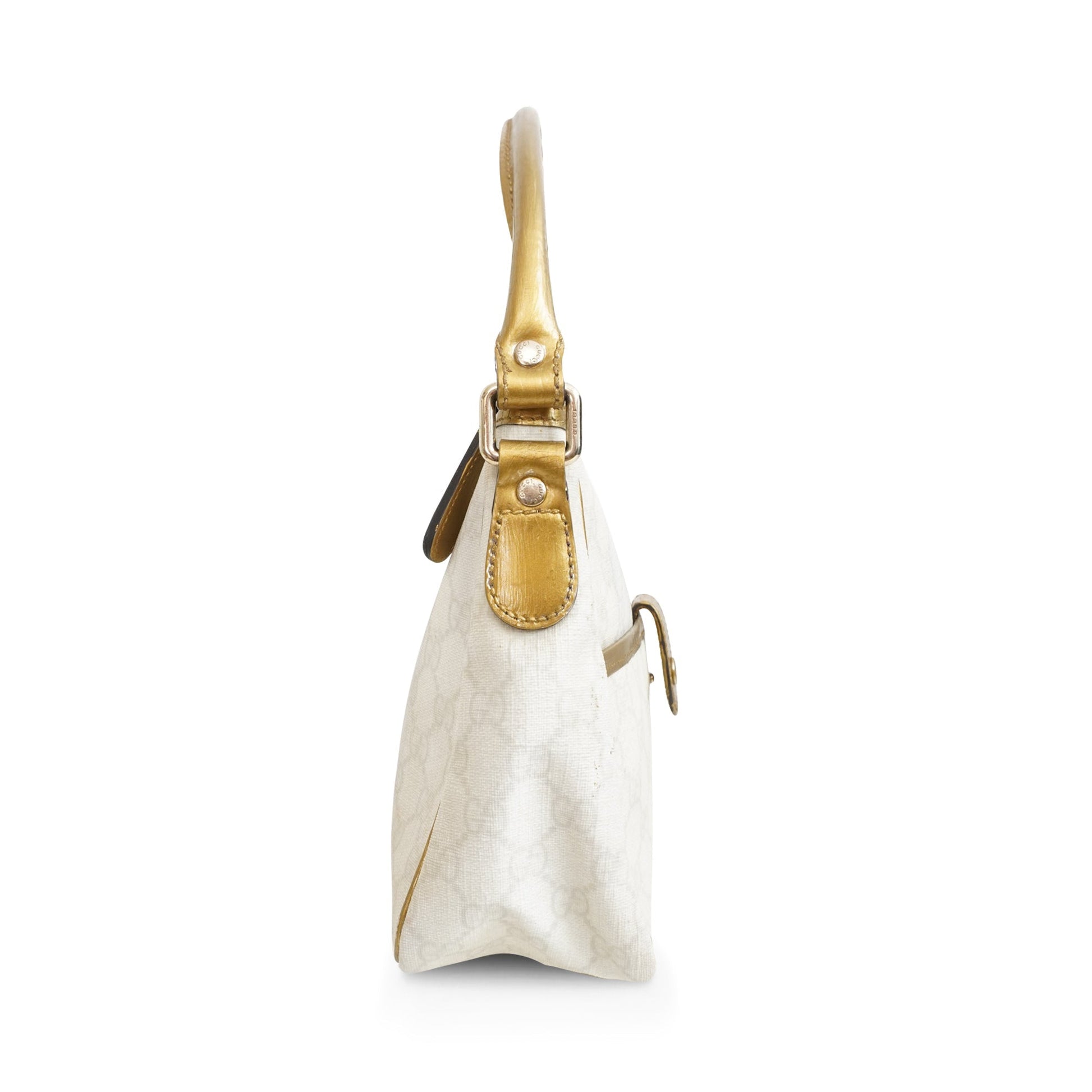 Gucci Shoulder Bag in white monogram with metallic gold trim. Features top zip closure in silver hardware, rolled top handle in gold hardware and a front snap pocket.