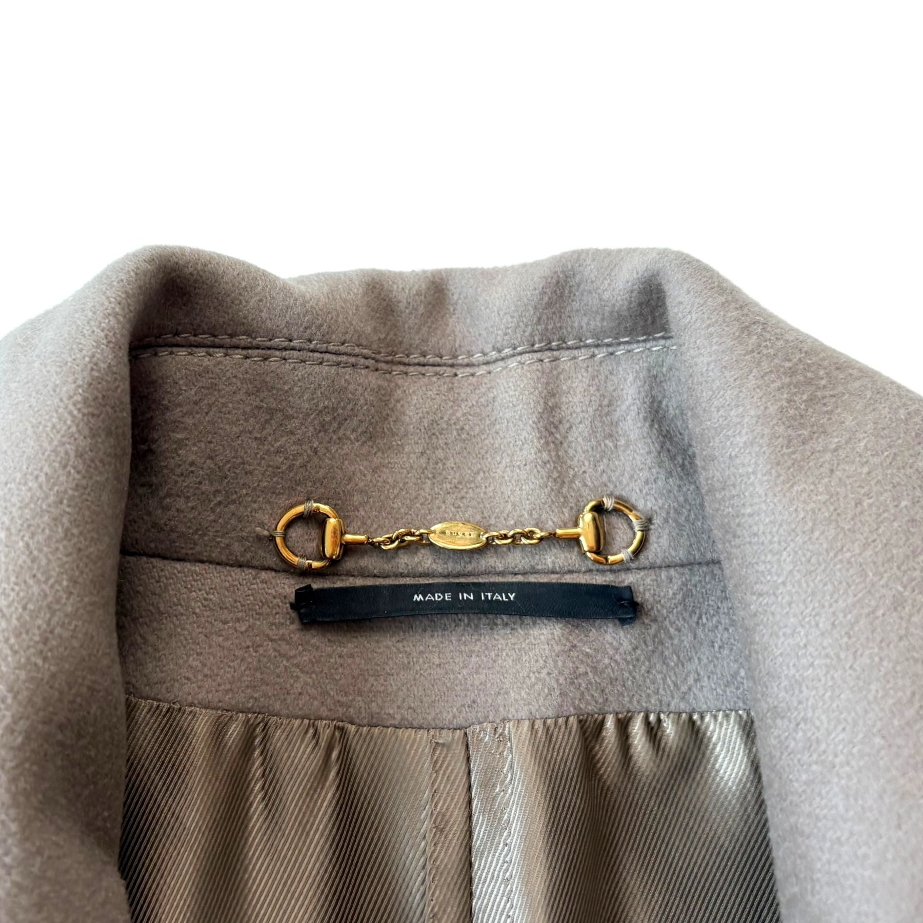 Gucci mid-length coat in taupe grey wool with a hidden front-button closure with brown buttons, large front flap pockets, and a belted detail at the waist and collar with gold buckle hardware.