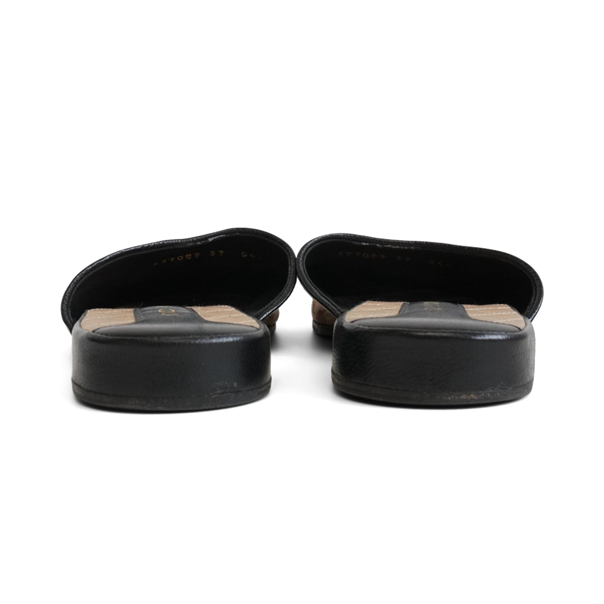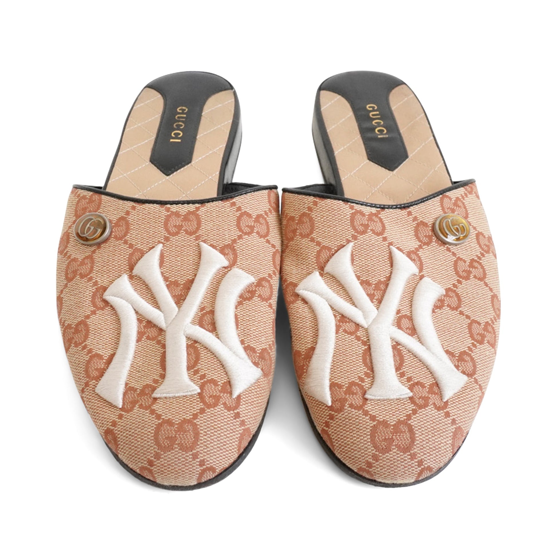 Gucci x NY Yankees mule slides in brown monogram printed canvas with a white 'NY' logo on the toe, black leather trim, and a silver logo emblem on the side.