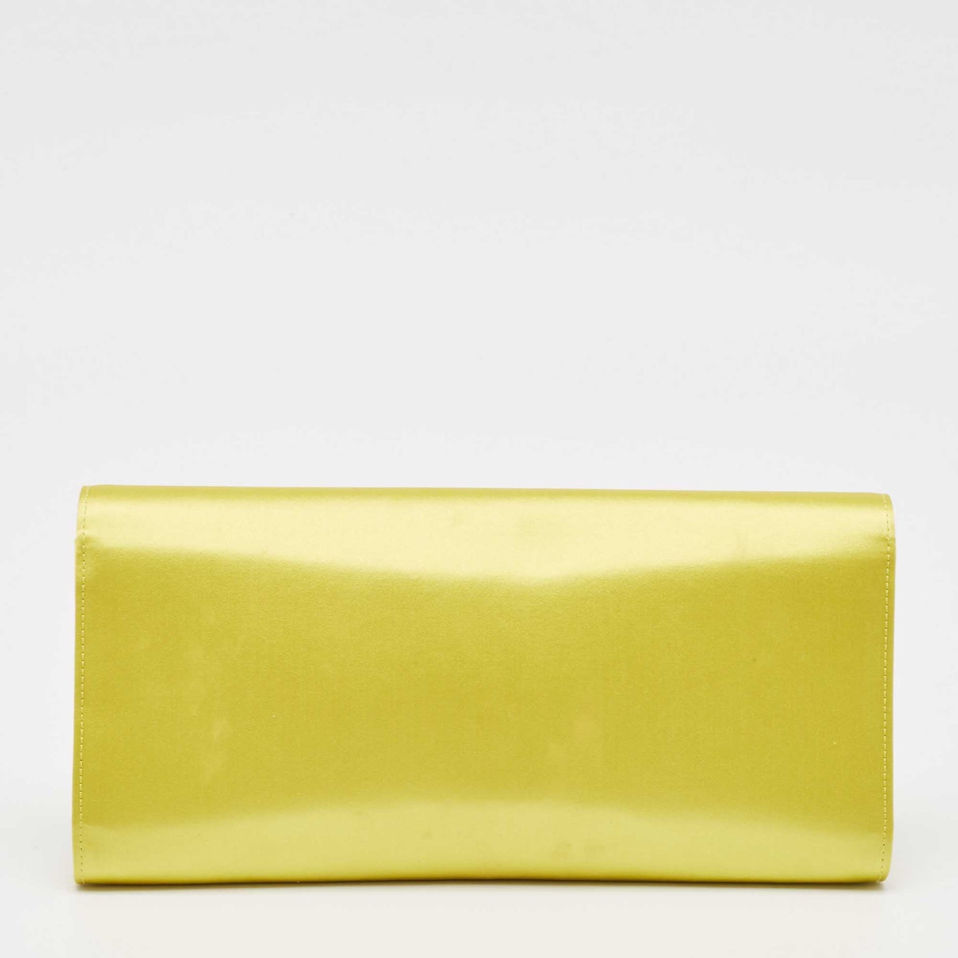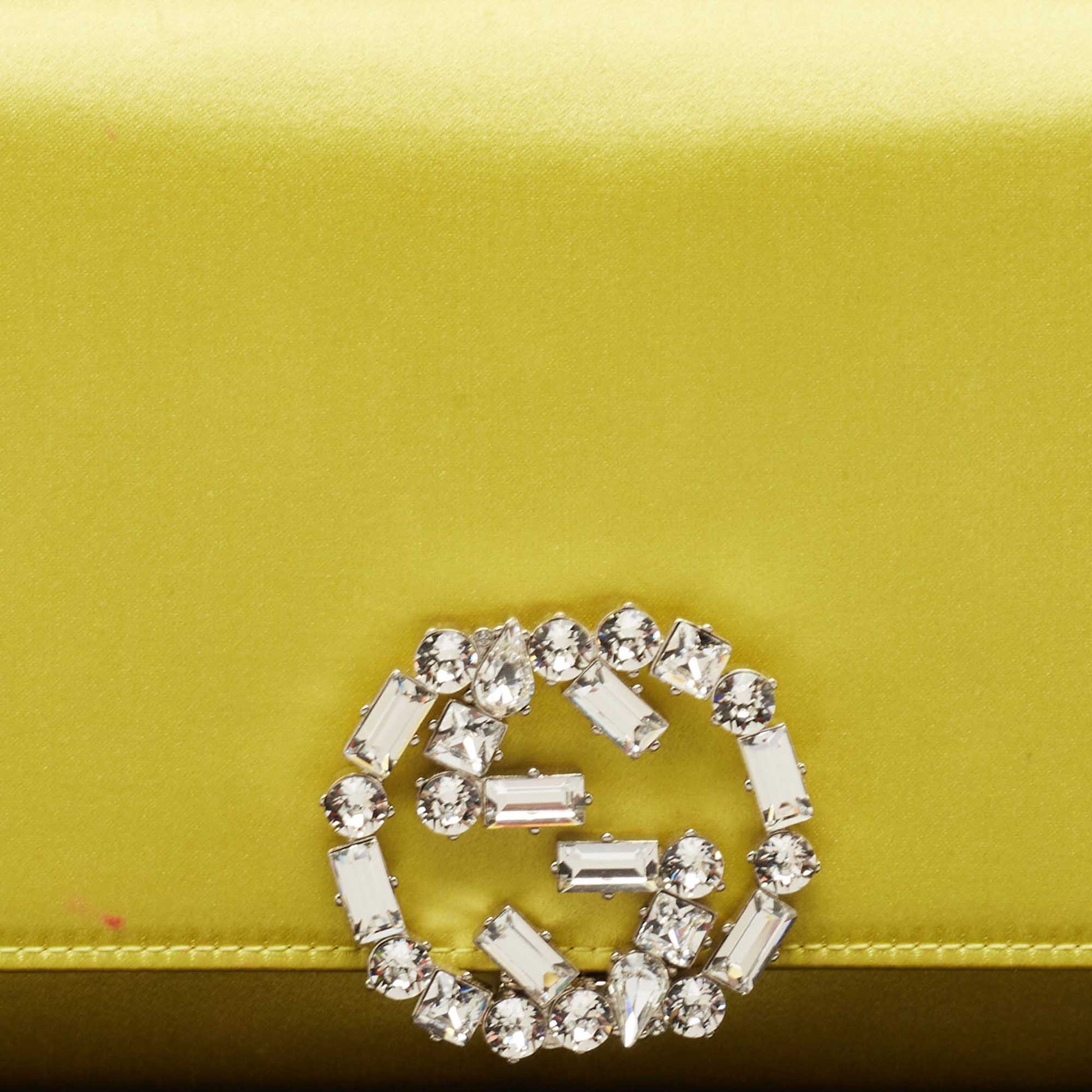 The Gucci Broadway clutch in yellow satin is adorned with GG crystals on the flap. It is a glamorous accessory ideal for day to evening events.