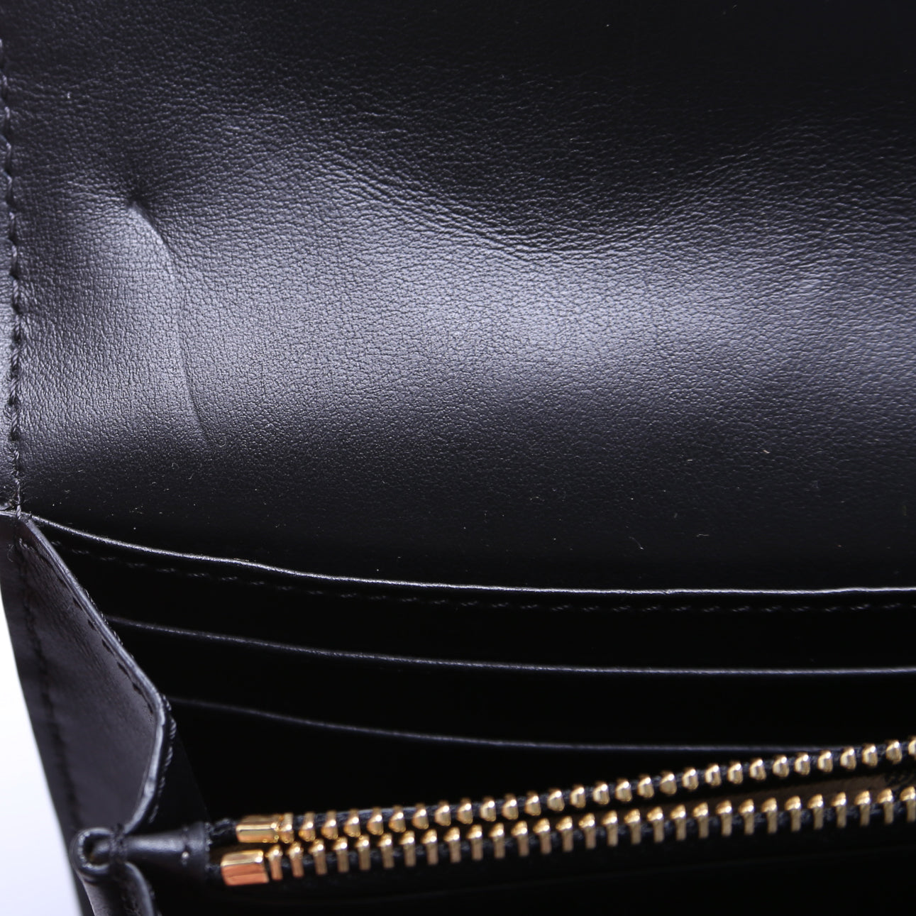 Interior: The interior is clean and free of rips or tears. There are minor scuffs and indentions to the leather throughout. The interior features twelve card slots, and three bill slots, and one zip closure pouch.