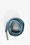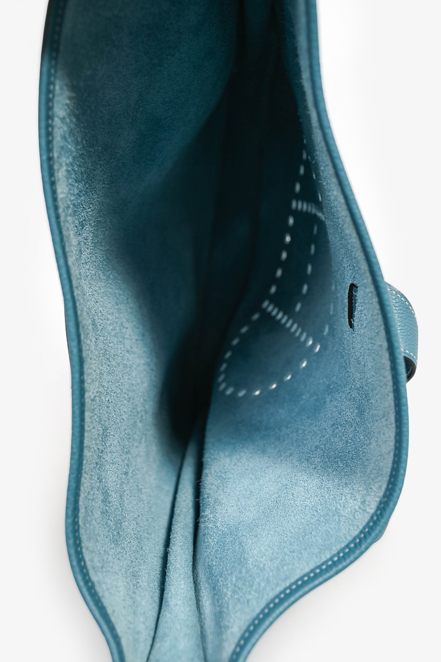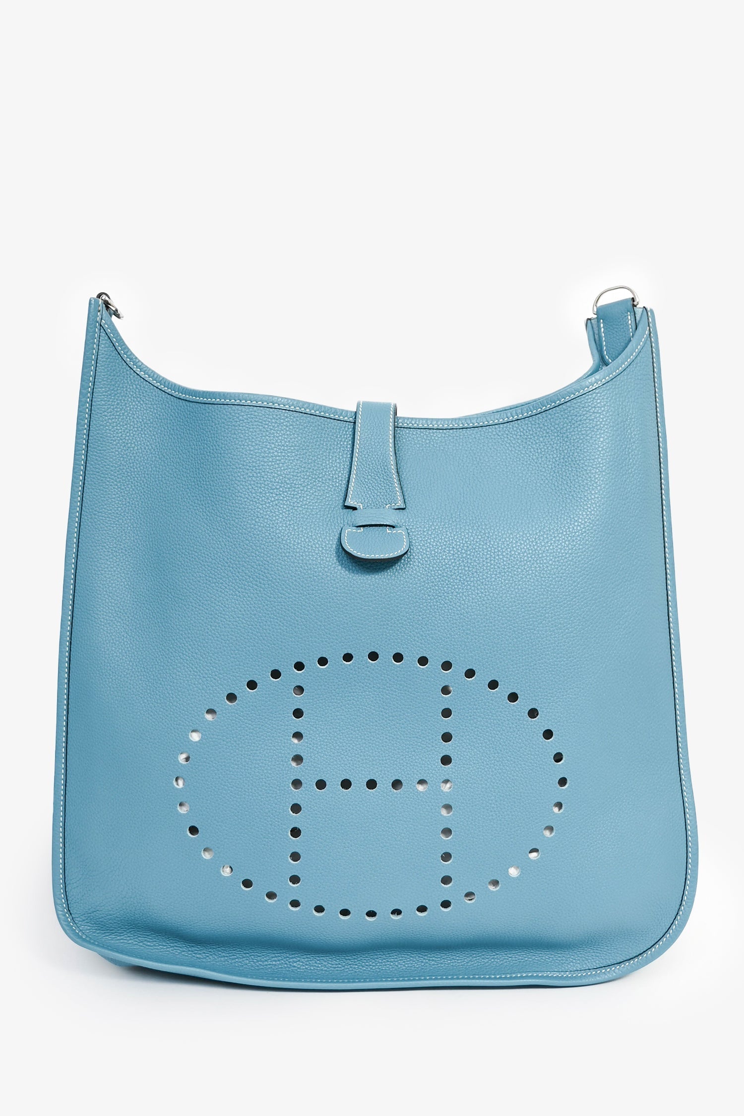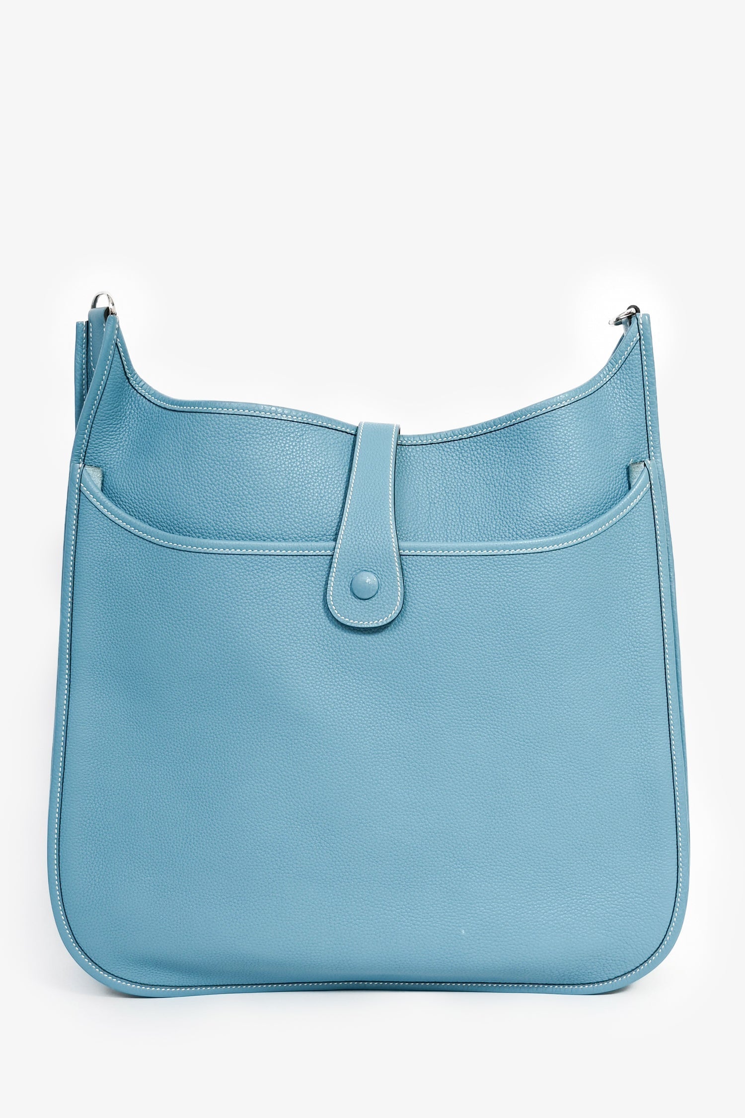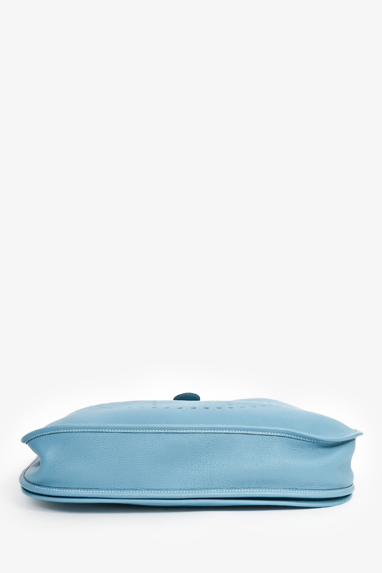 Hermès 2007 Blue Jean Clemence Leather Evelyne 31. Silver-tone hardware. Fold-over snap strap. Lined interior. Single slip compartment. Attachable like-tone hardware. Contrast stitching.