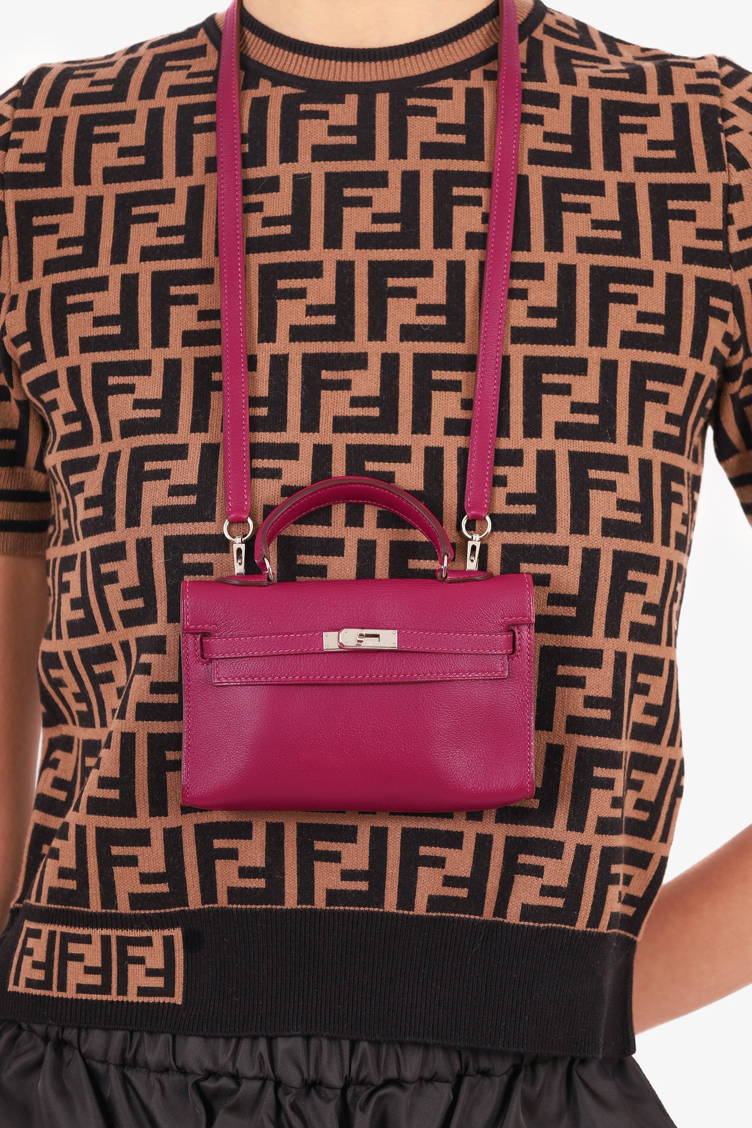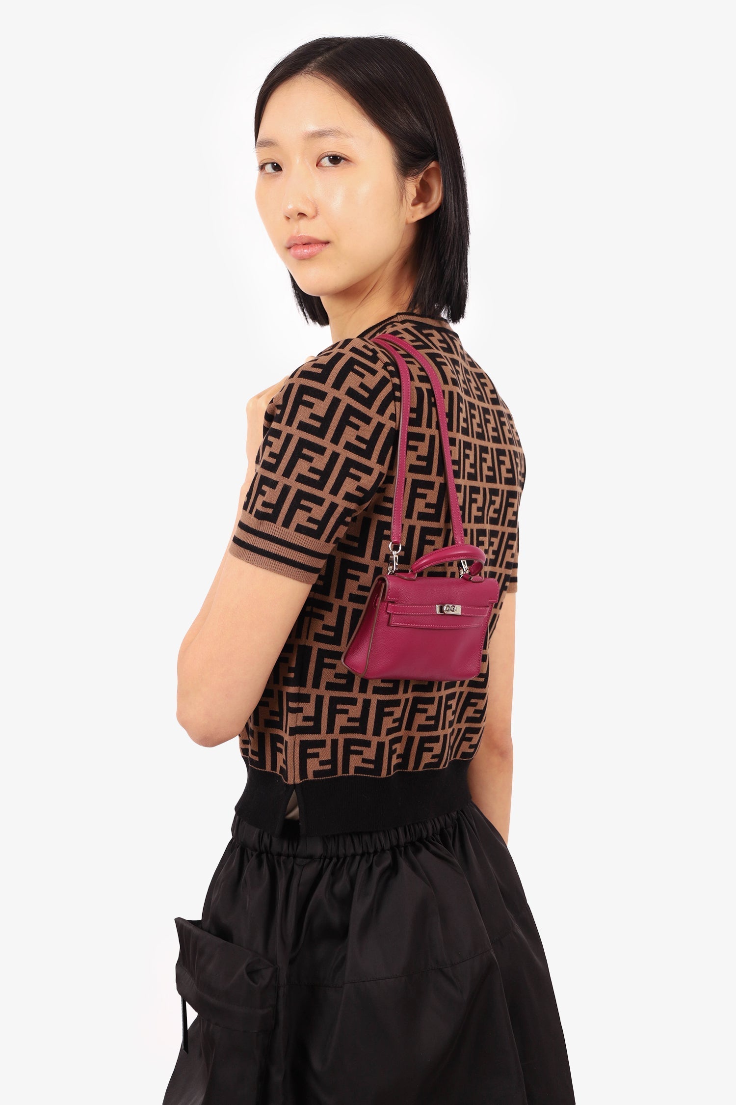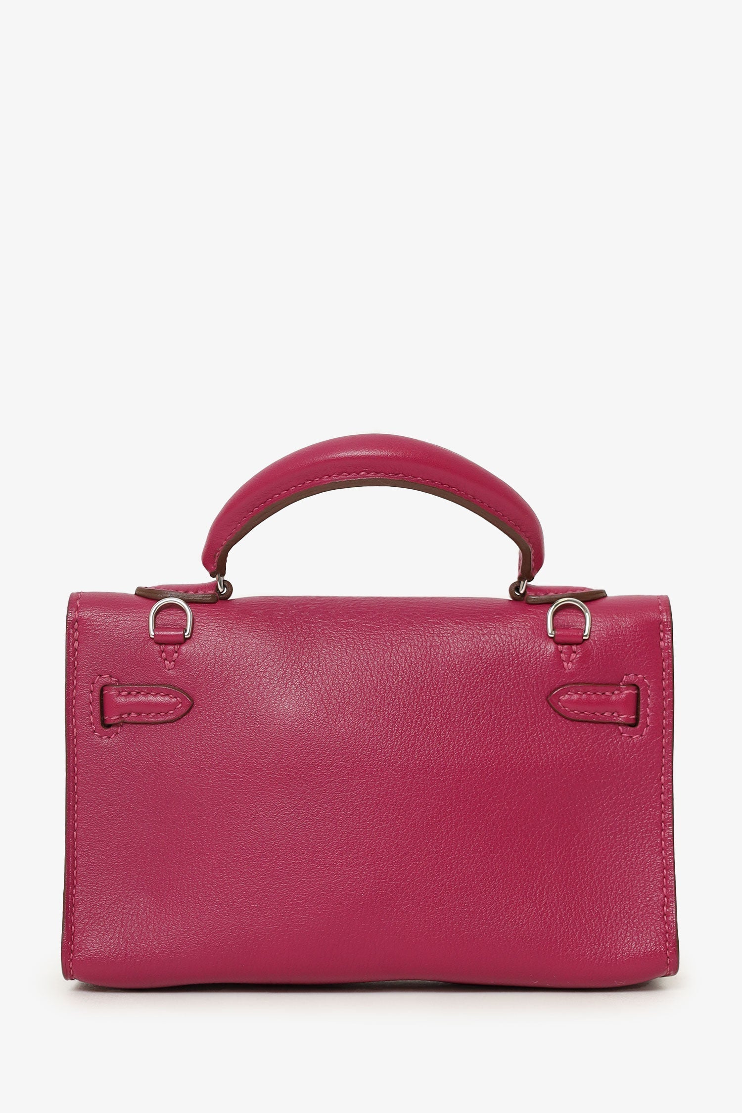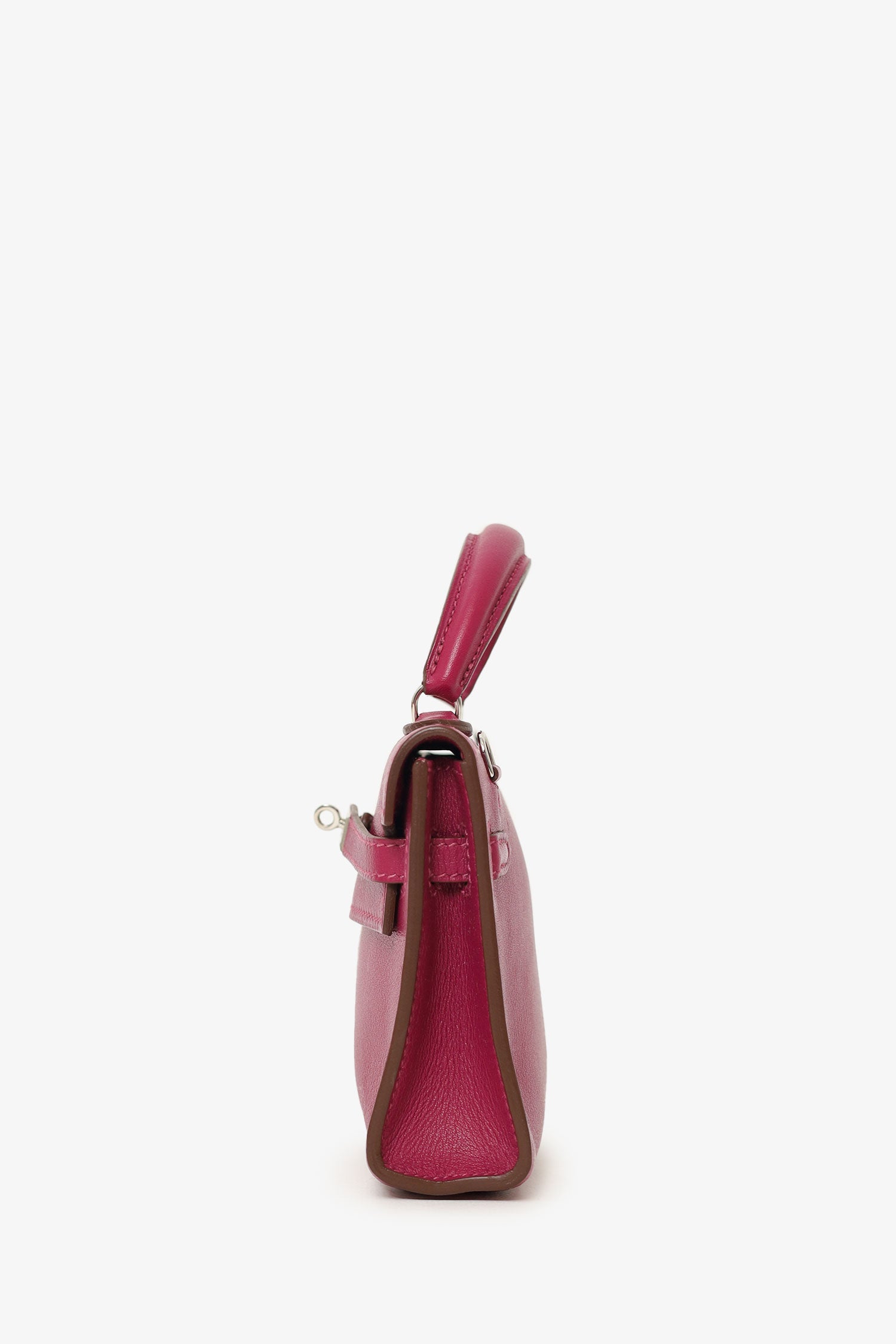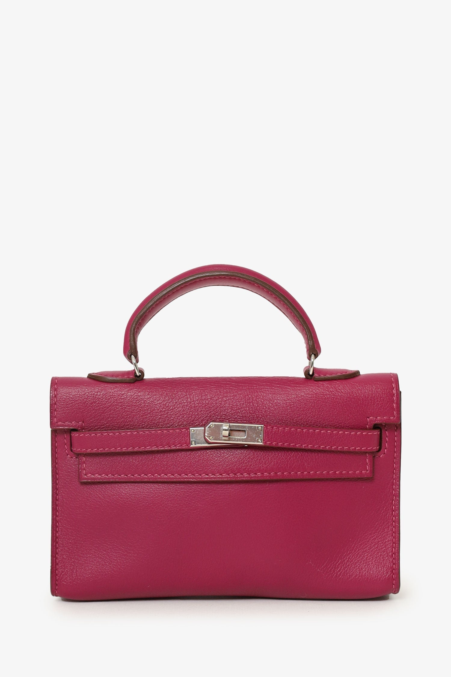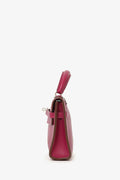 Hermès 2011 Tosca (Purple) Swift Micro Kelly 15 with Palladium Hardware. Turn lock closure. Top handle. Removable short strap. Tonal stitching.