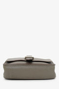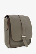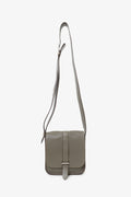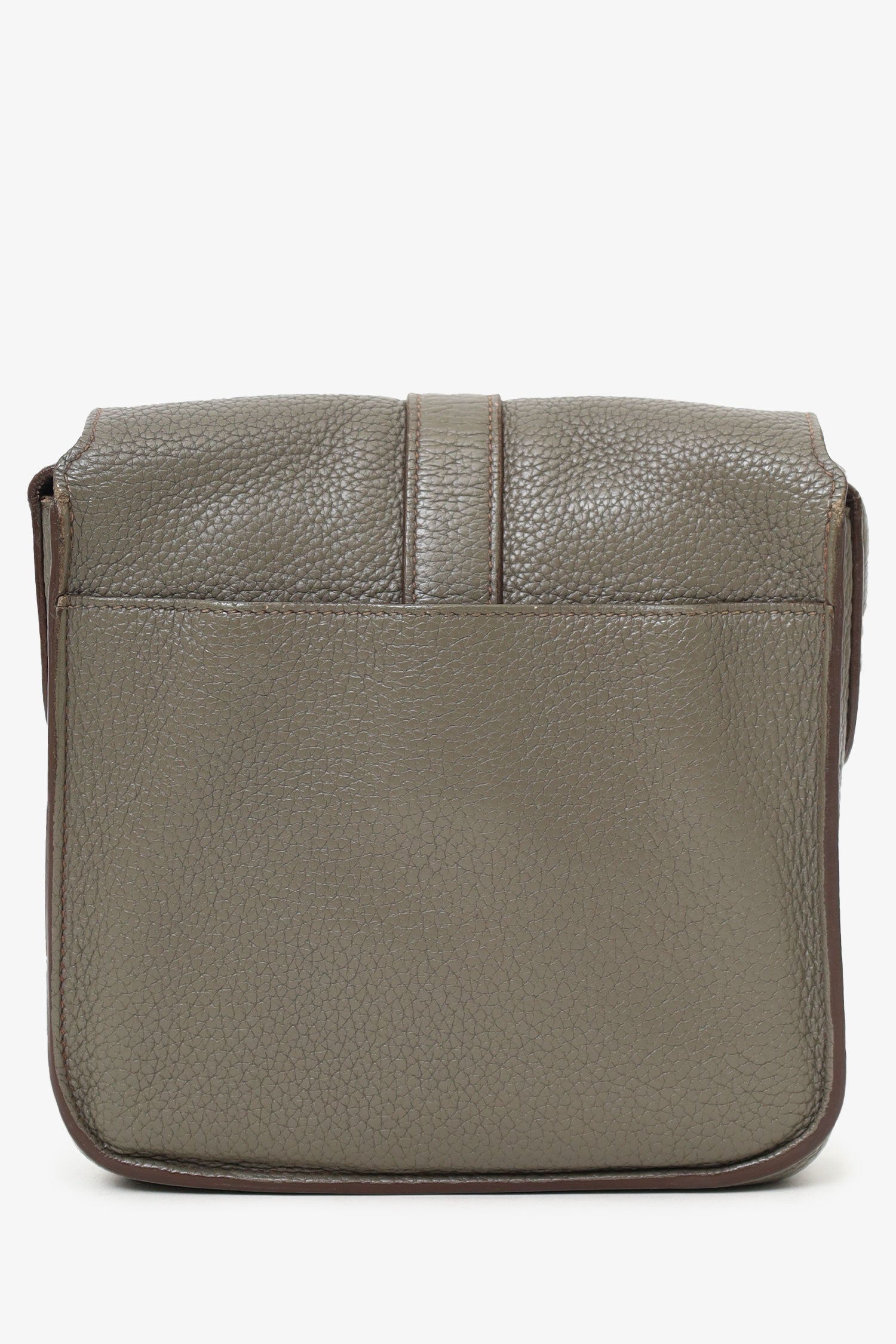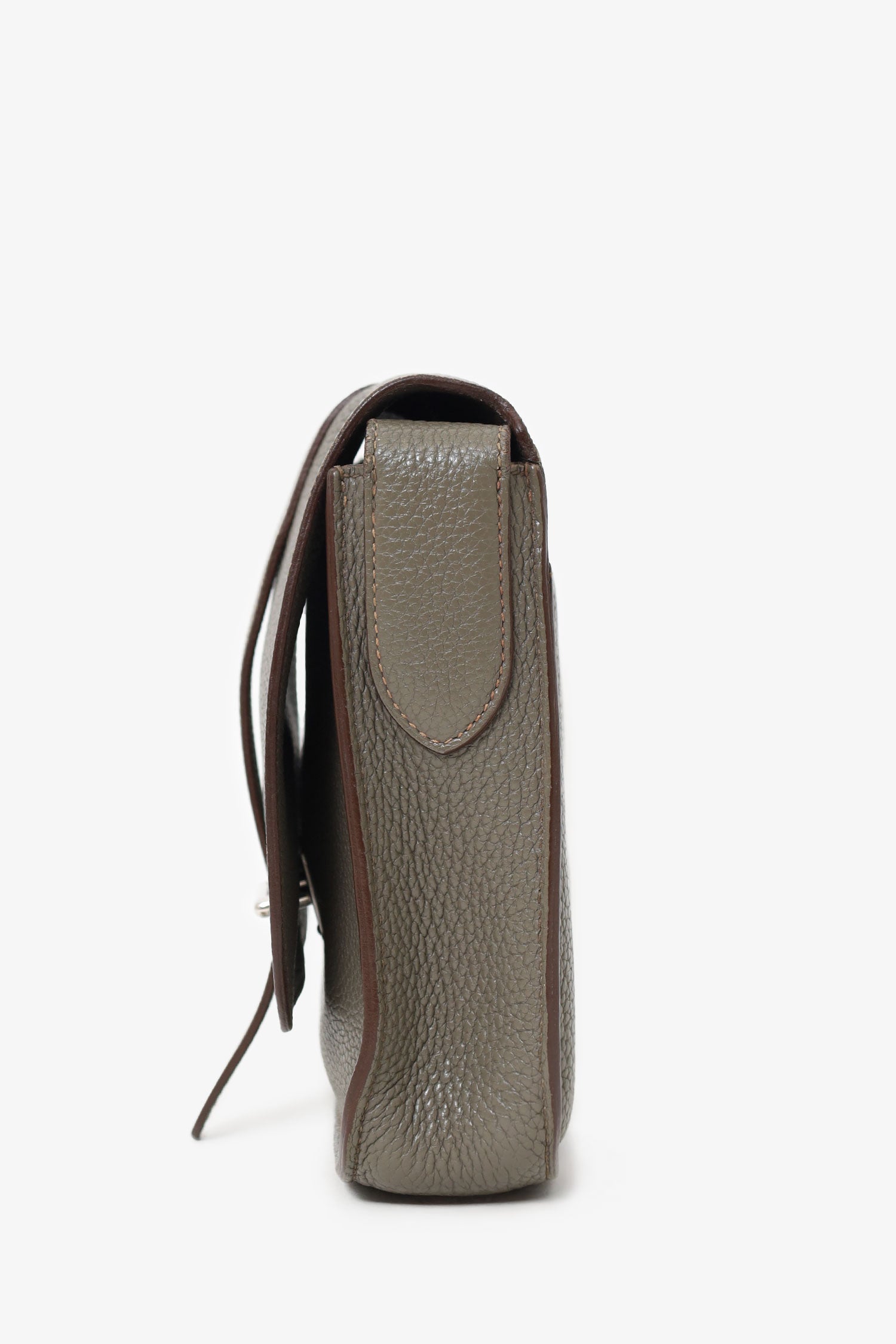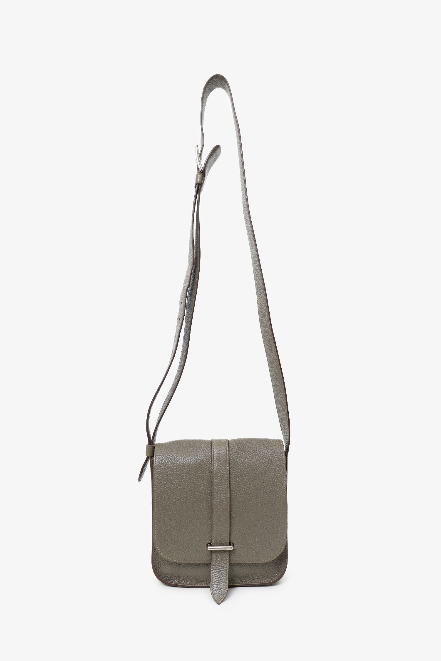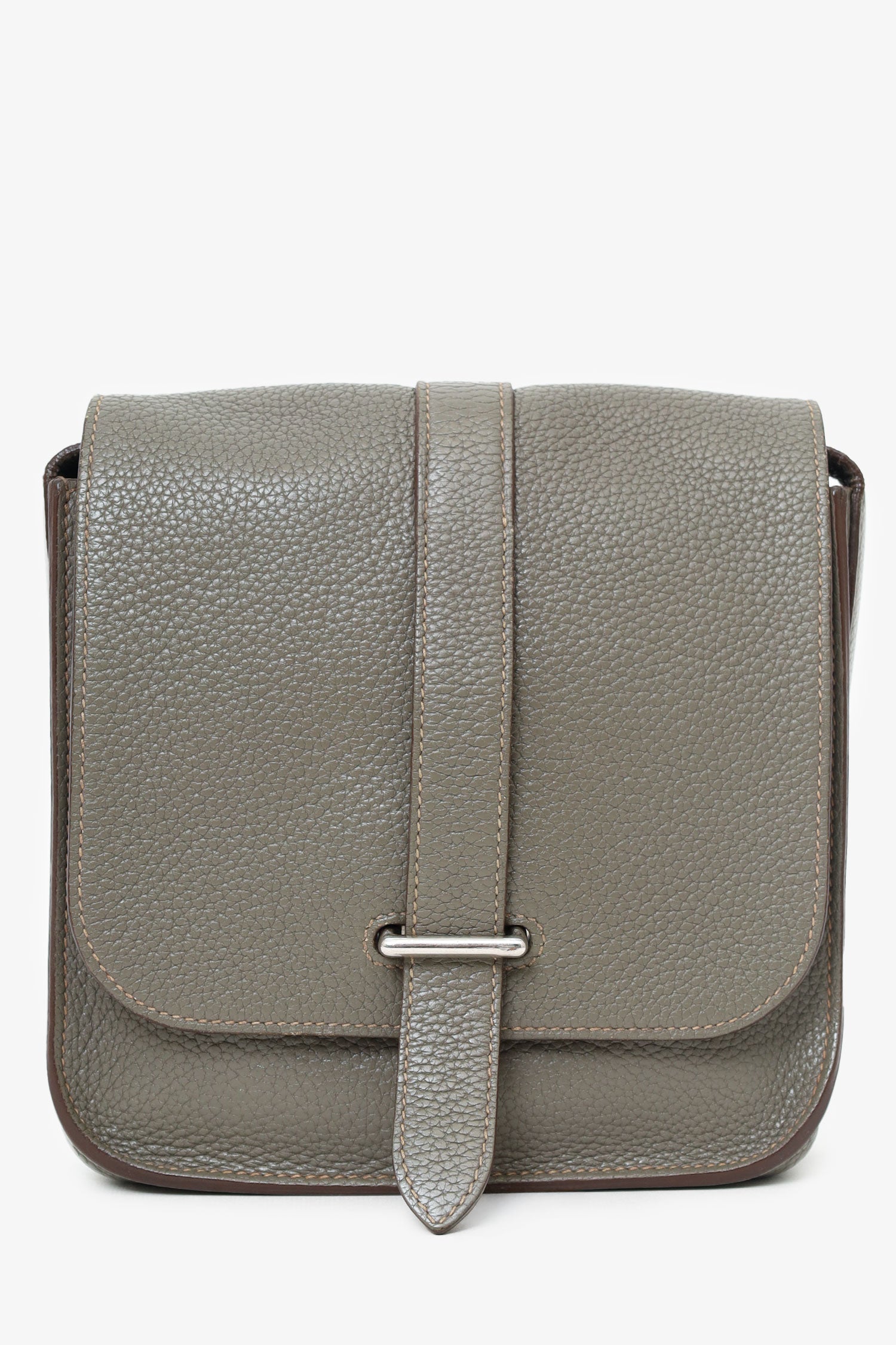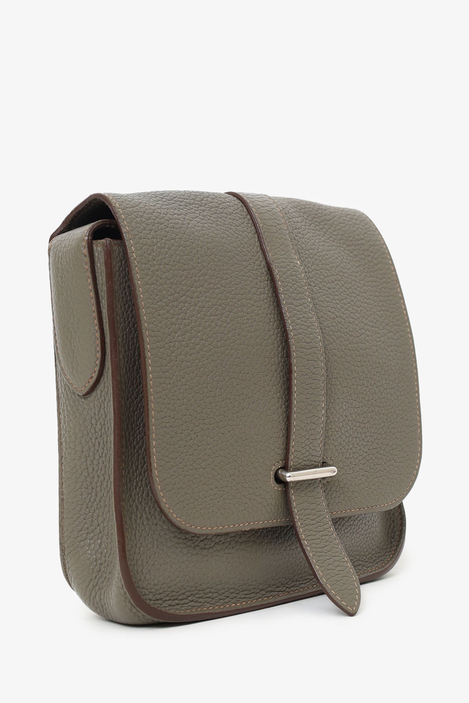 Hermes 2012 Étoupe Clemence Steve Steve Pochette PM Crossbody. Front fold-over flap with slide-strap closure. Adjustable shoulder/crossbody strap with buckle closure. Single exterior slip-pocket. Leather lined interior. Single interior slip pocket. Silver-tone hardware. Tonal stitching.