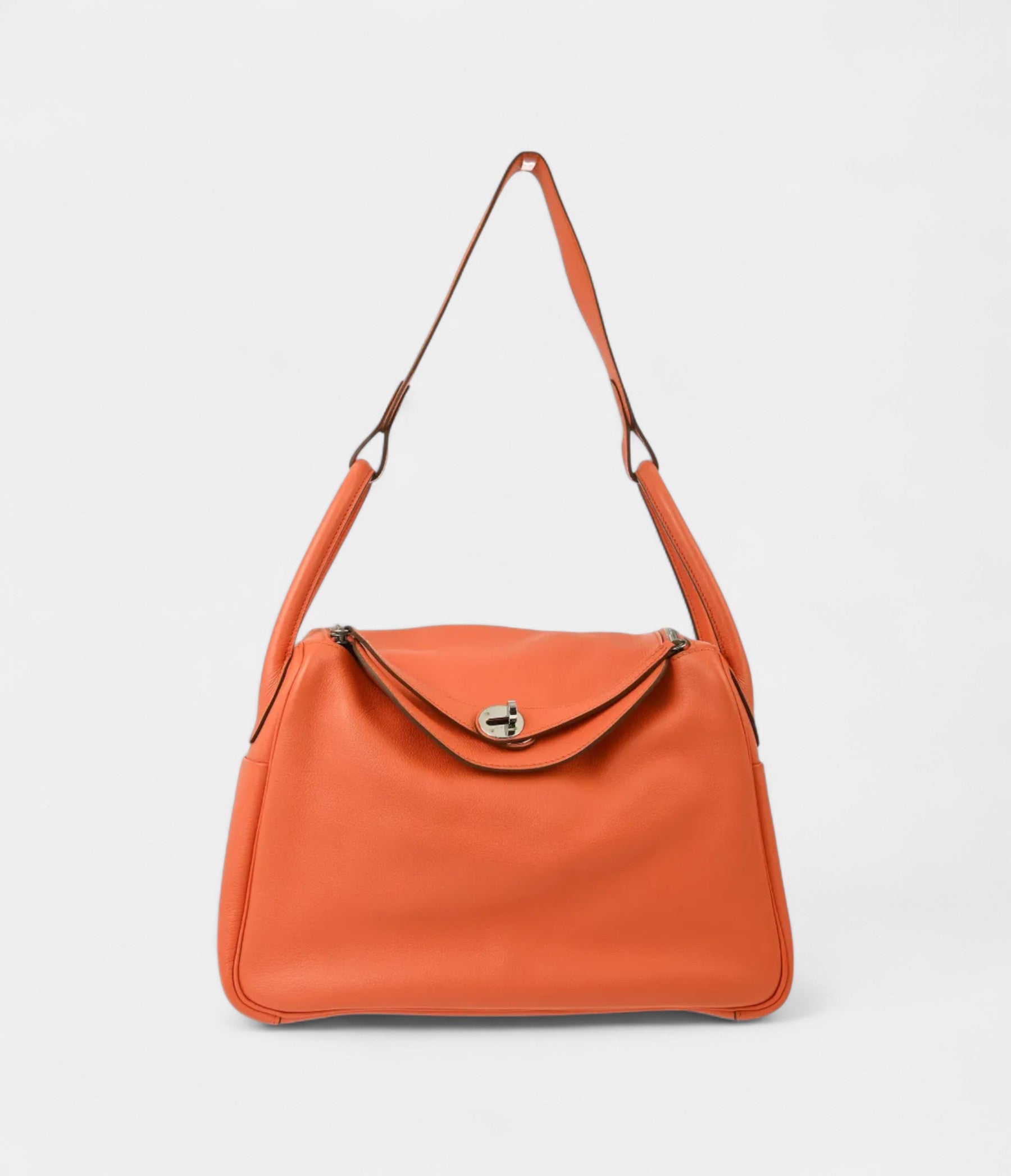 The Hermès Lindy 30 from 2012 is a stylish and functional piece that embodies both elegance and practicality. Featuring a unique design, this bag is crafted from premium leather and showcases the signature Lindy shape with a flap closure and distinctive double handles. The bag's vibrant orange color adds a playful and bold touch, making it perfect for those who enjoy standing out in their accessories.