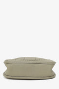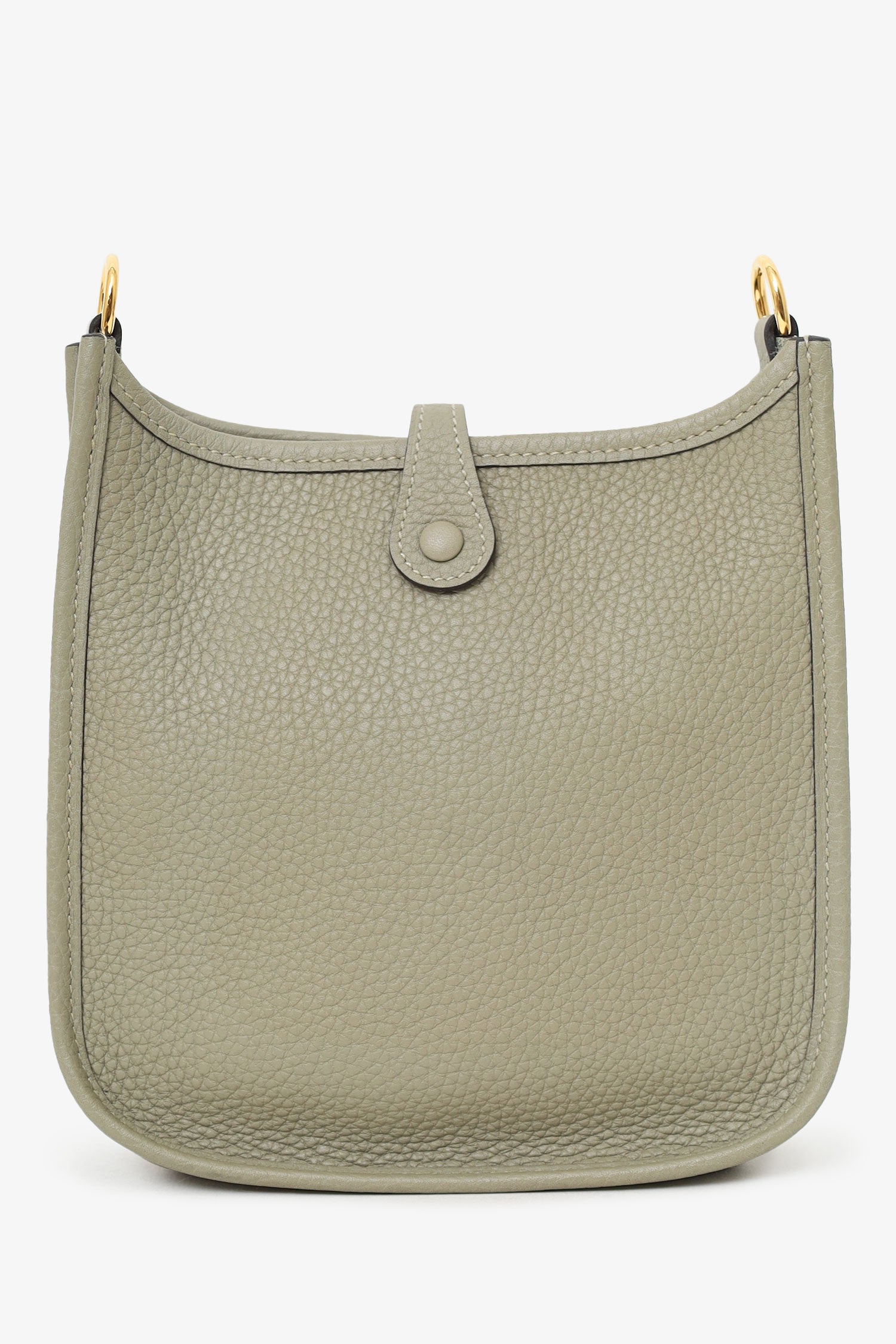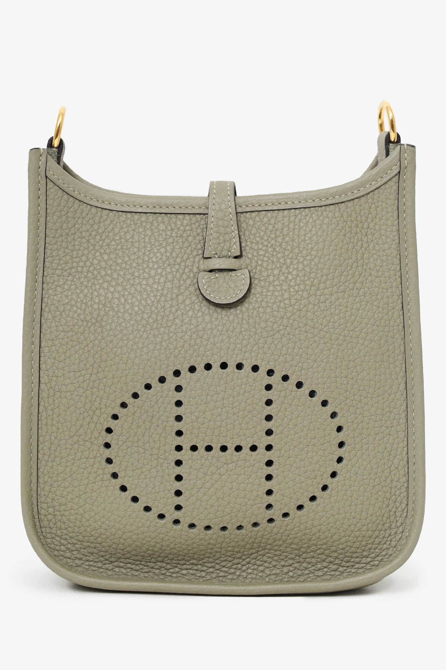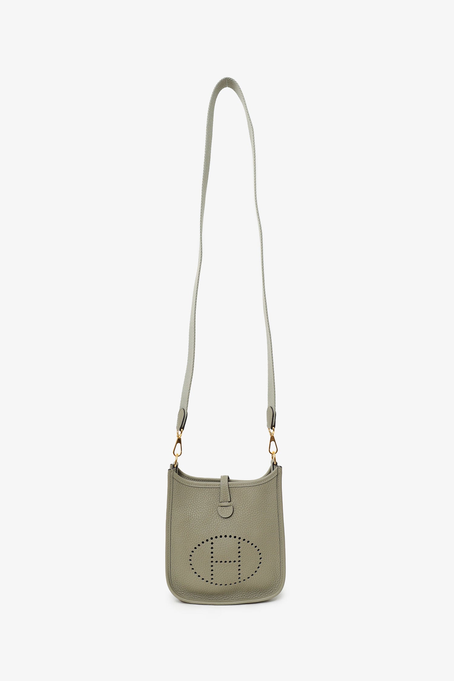 Hermès 2021 Sage Clemence Mini Evelyne II TPM 16 Crossbody. Top front fold-over snap button closure. Removable strap with lobster clasp closure. Perforated logo on front centre exterior. Suede-lined interior. Gold-tone hardware. Tonal stitching.