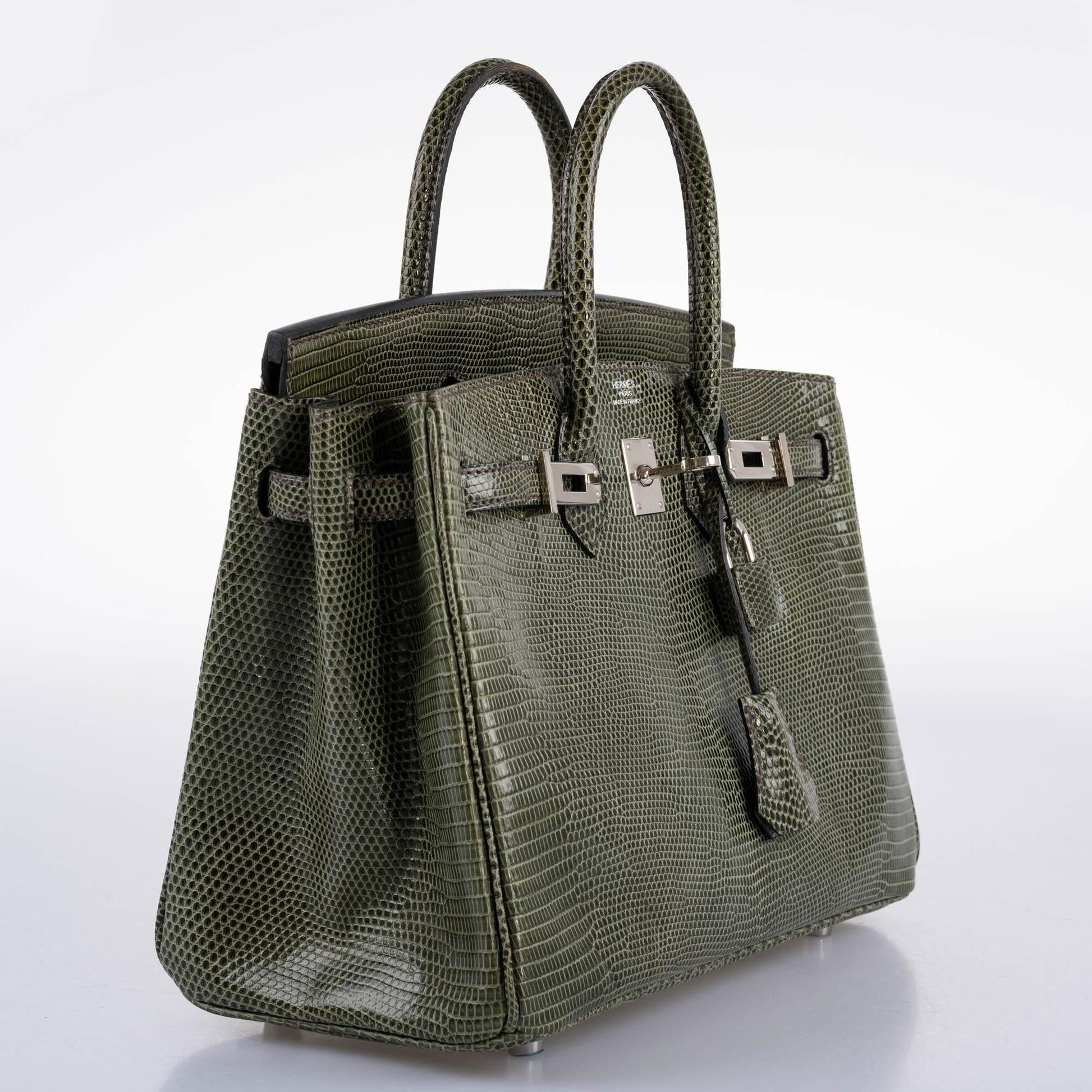 First launched in 2004, the 25cm Birkin was initially met with a less than enthusiastic response. For the first decade of its existence, small bags were out and big bags were in, with the 35cm holding standard over all other Birkins. In recent years, the growing demand for small bags and small Birkins has led to a surge in popularity for unusual early examples of this diminutive size. This 25cm Birkin, done in Vert Olive Salvator Lizard with Palladium hardware, is a spectacular example from the early years of this size’s production. this rare color shows beautifully over the small glossy scales. An exceptional piece for any collection, Salvator Lizard is distinct for its small, flat, hexagonal scales.