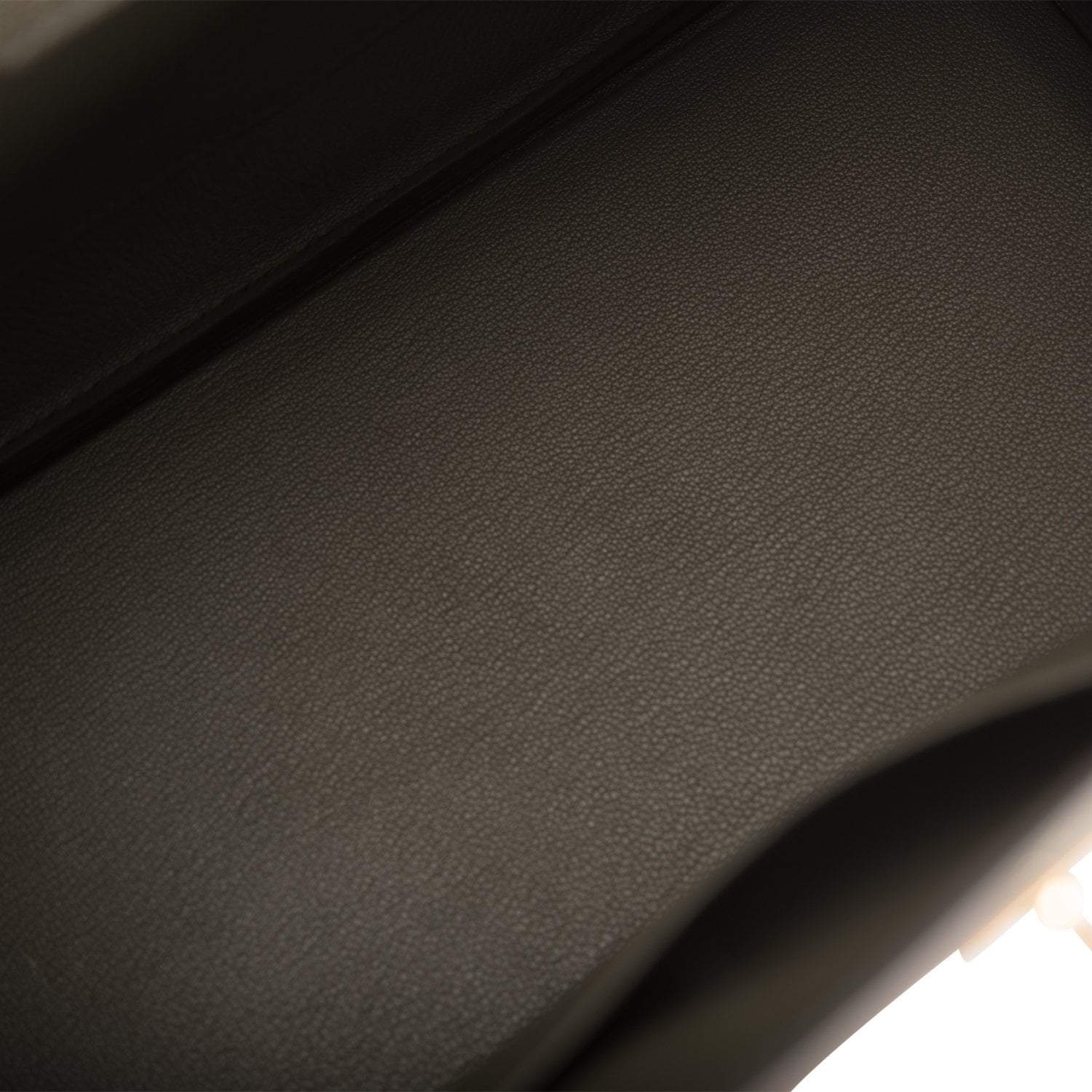 The interior is lined with Vert de Gris chevre leather and includes one zip pocket with an Hermes engraved zipper pull, as well as an open pocket on the opposite side.