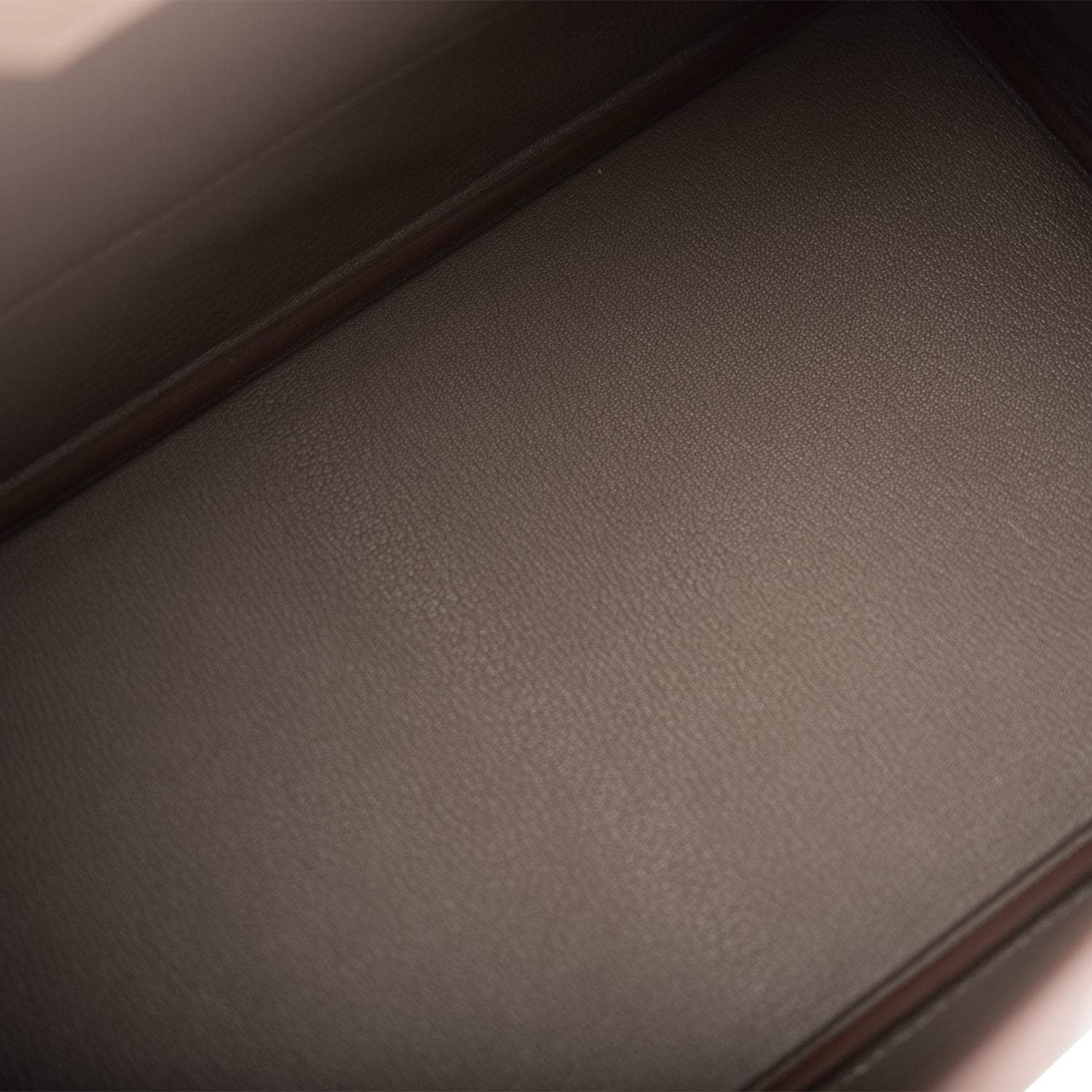 This exquisite Birkin is crafted from Etain Epsom leather with palladium hardware and features tonal stitching, a front flap, two straps with a center toggle closure, clochette with lock and two keys, and double rolled handles. The interior is lined with Etain Chevre leather and includes one zip pocket with an Hermes engraved zipper pull and an open pocket on the opposite side.