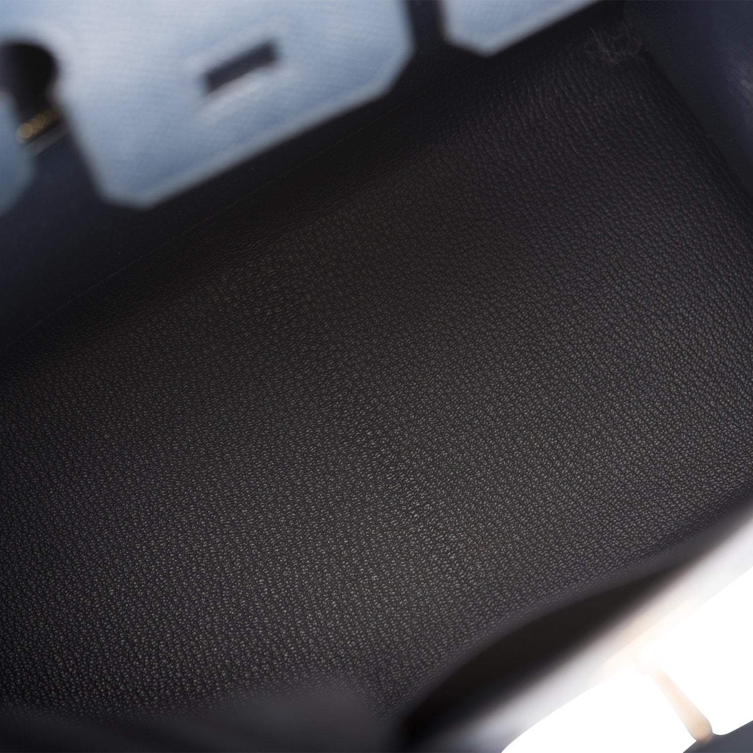The interior is lined with Bleu Indigo chèvre leather and includes one zip pocket with an Hermès-engraved zipper pull and an open pocket on the opposite side for added storage.