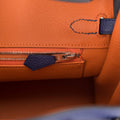 The interior is lined with Orange chevre and has one zip pocket with a Hermes engraved zipper pull and an open pocket on the opposite side.