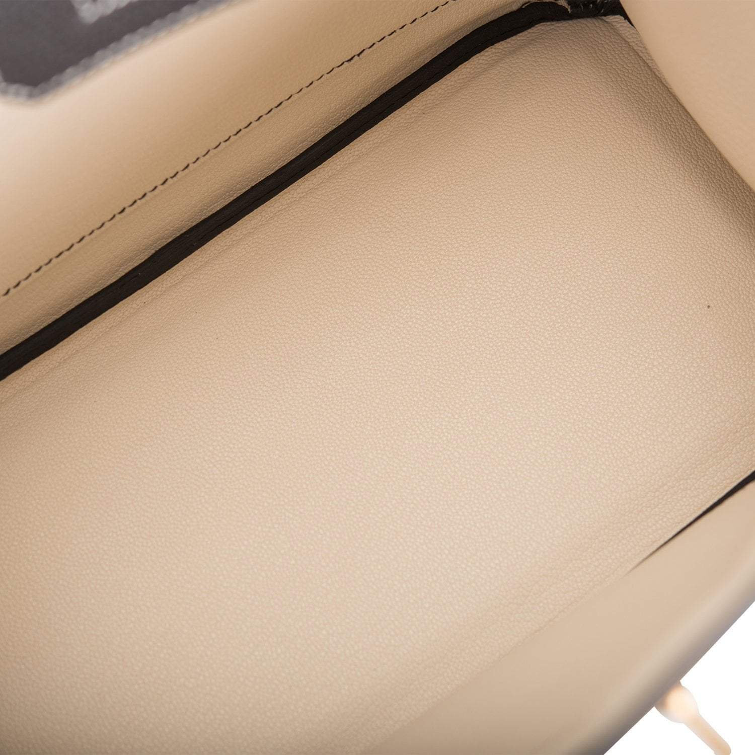 The interior is lined with Craie chevre leather, offering one zip pocket with an Hermes engraved zipper pull, and an open pocket on the opposite side.